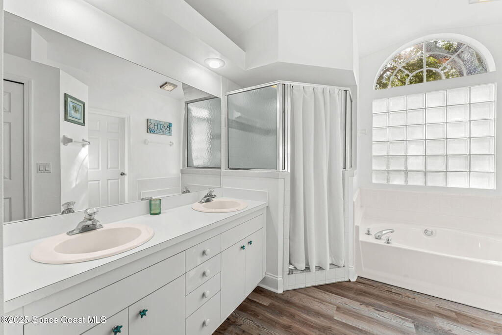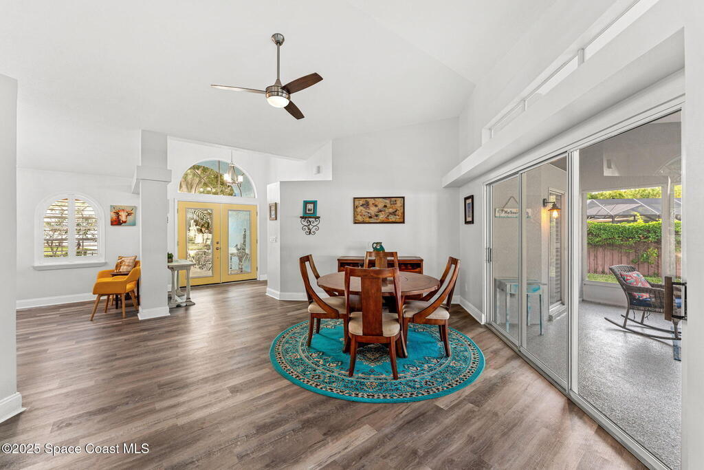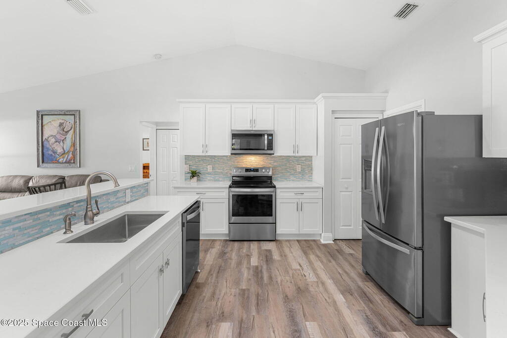 Set on an exceptional 0.36-acre parcel, one of the largest in Pineda Crossing, this home offers a rare sense of space enhanced by a pie-shaped backyard. A 2019 roof, nearly 300 ft of PVC fencing, newer pavered driveway, painted exterior & newer front door reflect thoughtful care. Inside, vaulted ceilings & an open layout amplify the 2020 kitchen renovation featuring 42'' white cabinets, beachy tile backsplash, white quartz counters, new appliances & an impressive 11ft island. Popcorn ceilings were removed in 2020 & brand new woodgrain LVP installed 11/2025! The split layout places the primary suite in its own wing, complemented by a 2025 full bath renovation. Practical upgrades include a newer gas water heater, 2010 HVAC, gas availability behind the stove & dryer, plumbing for a utility sink, dual water valves for an espresso setup, plus a garage w/ side door & attic stairs. A large enclosed lanai w/ vinyl windows & an epoxied floor expands year-round living. Viera School Zones!