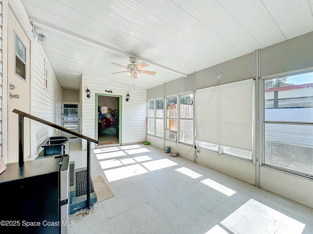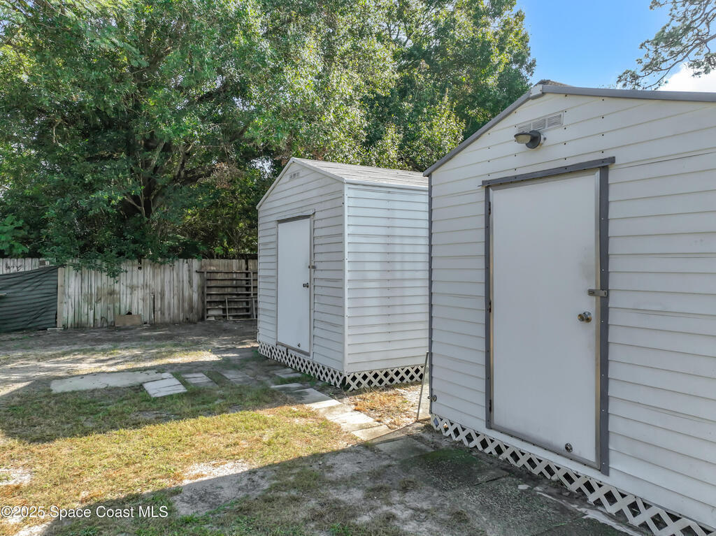 Opportunity awaits with this inviting 2 bedroom, 2 bathroom home sitting on a spacious 0.26 acre lot with no HOA and you own the land! This property offers incredible flexibility, comfort, and convenience in a highly desirable location close to restaurants, shopping, and quick access to I-95. Inside, you'll find an open floor plan with tile flooring throughout, creating a bright and cohesive living space. The spacious kitchen provides plenty of counter and cabinet space and flows seamlessly into the large dining and living areas--perfect for everyday comfort and entertaining. Enjoy multiple outdoor living options with an enclosed patio including AC, an additional screened patio and a generous fenced backyard ideal for pets, gardening, or simply relaxing. A durable metal roof adds peace of mind and longevity. The home also includes a carport, storage room with washer and dryer hookups, and two storage sheds for all your tools and recreational gear. You have additional gate access on the