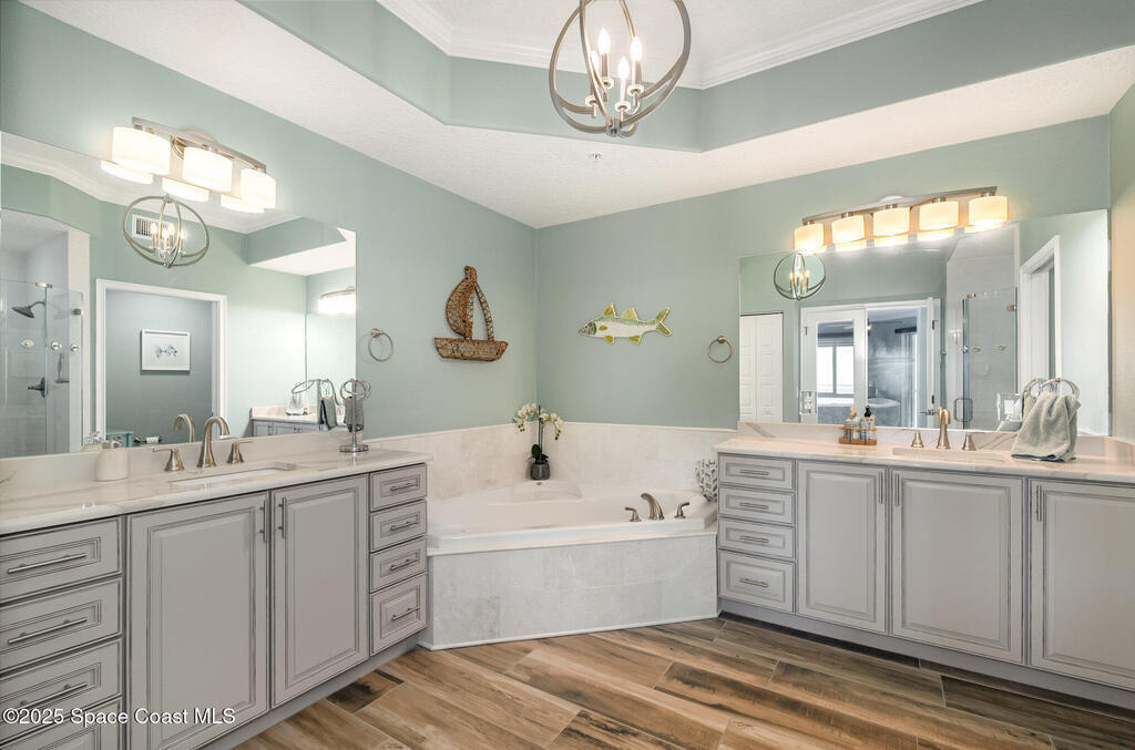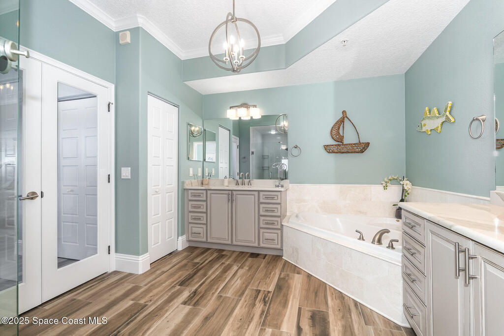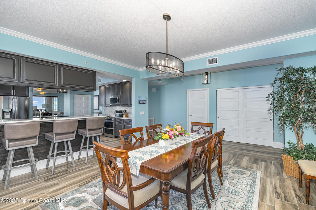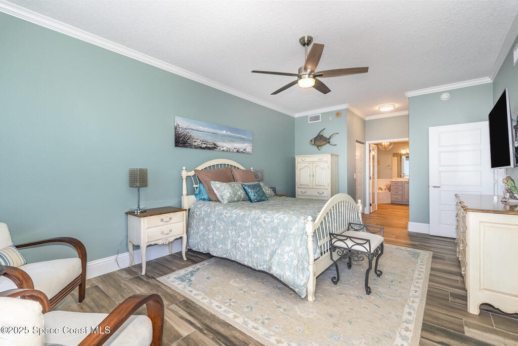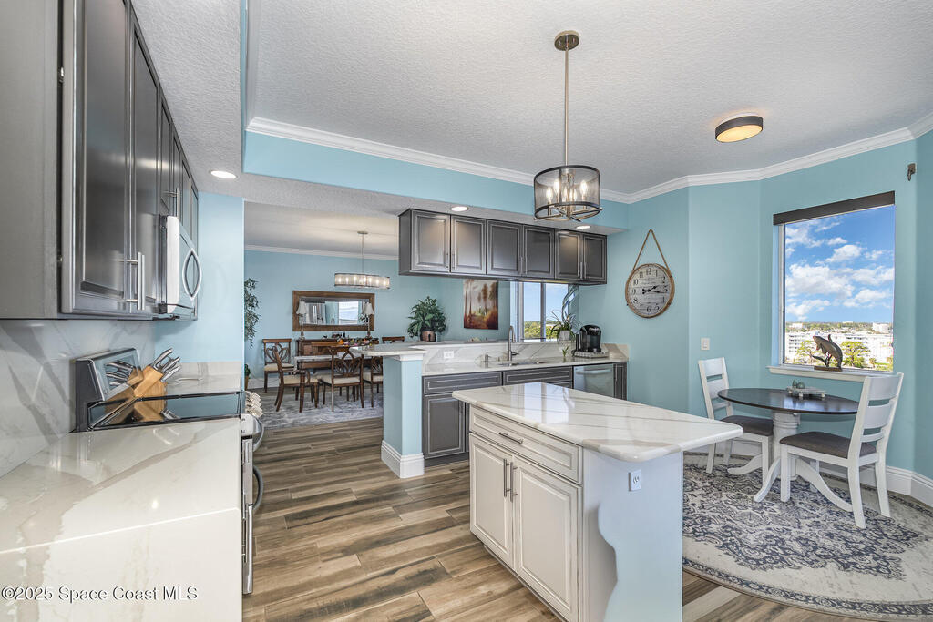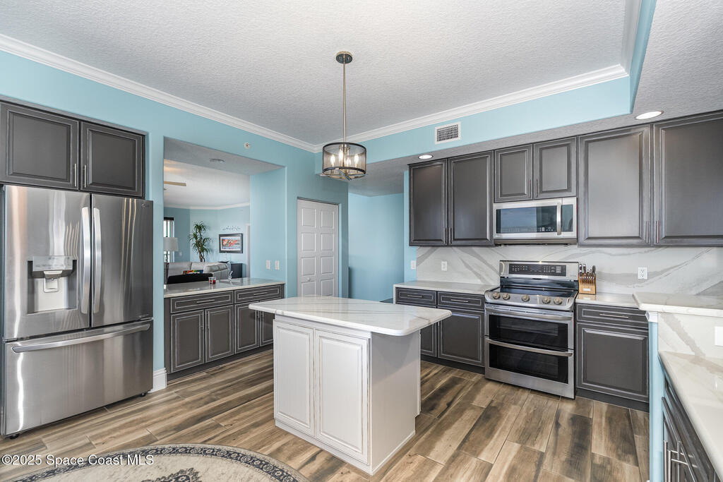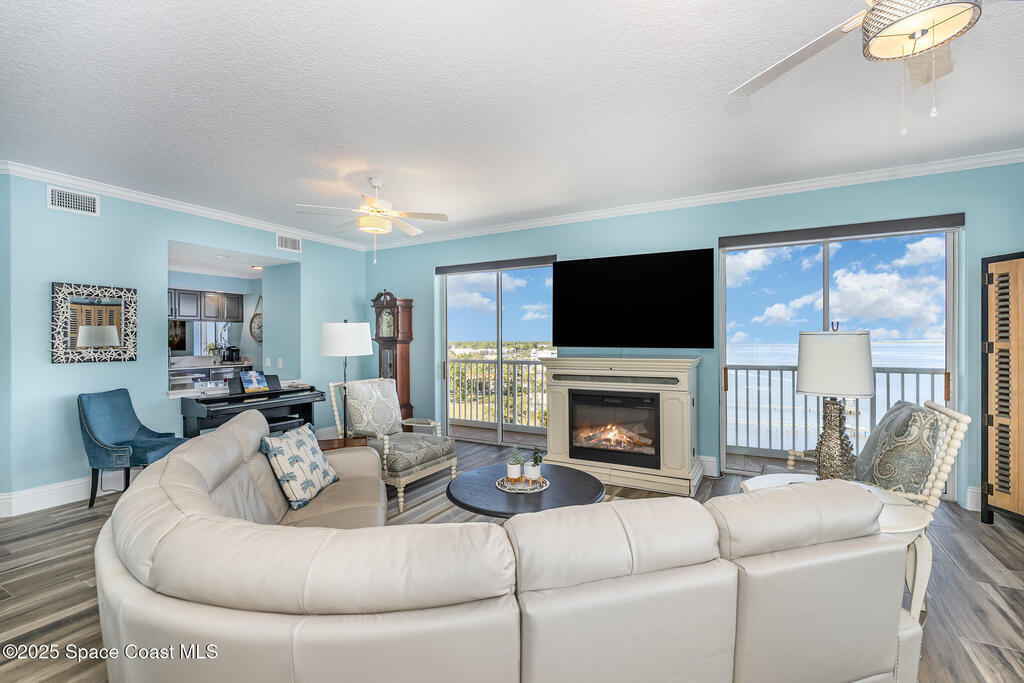 Take me to the river! Stay and enjoy expansive water views and rocket launches from nearly every room of this 9th floor 3 bedroom 3.5 bath masterpiece! Fully remodeled to a very high standard. 9 foot ceilings with crown molding throughout! New tile floors with upgrades galore. Work from home in large office/study! Separate laundry room with additional storage. The designer chefs kitchen with quartz counter tops and upscale appliances is sure to please! Open floor plan makes it live like a single family home yet with the conveniences of a first class condo. Tankless water heater, newer ACs and plantation shutters are all a bonus. Did we mention two separate private garages and an additional spot under the building! Association is well managed and funded with a completed reserve study for piece of mind! Ideally located with convenient access to all that the space coast and Orlando areas have to offer. Request your private showing today or someone else will!!!