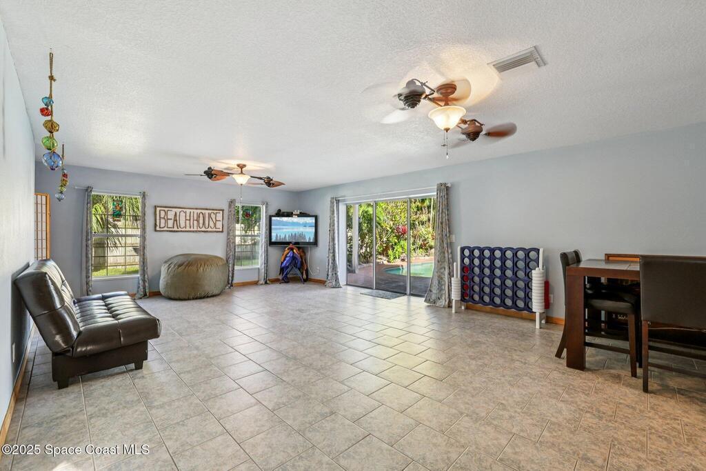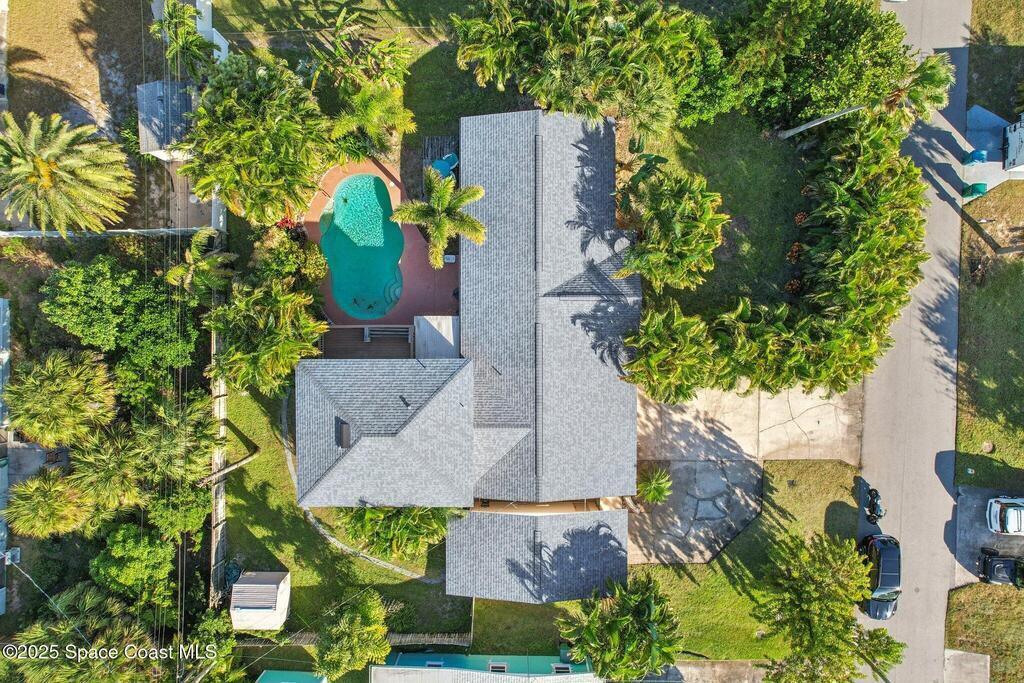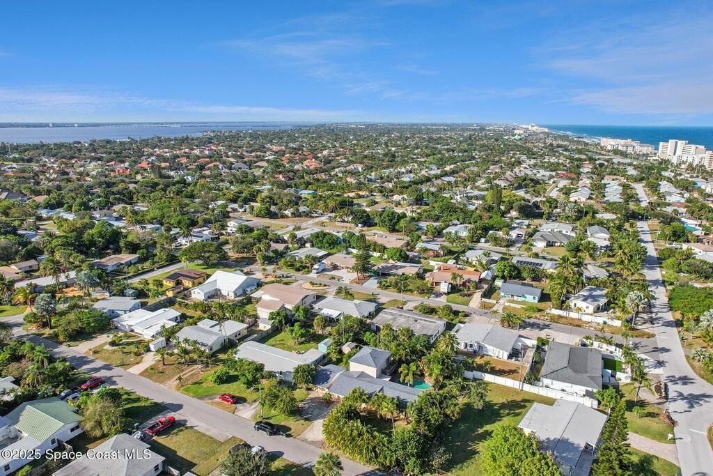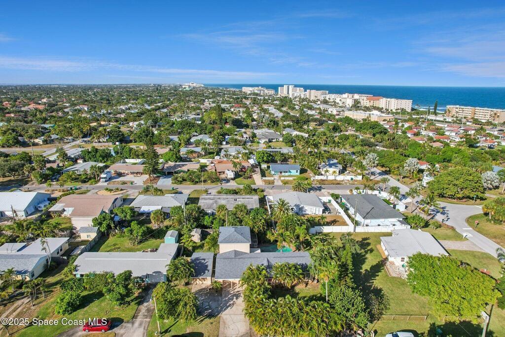 Just one block from the sparkling shores of Indialantic, this spacious 4-bedroom, 3-bath pool home offers the ideal setting to enjoy Florida coastal living. With 2,724 sq. ft. of interior space, an inviting in-ground pool, and multiple indoor/outdoor entertainment areas, this property is perfect for those seeking a full-time residence or a fantastic vacation retreat. The main level features terrazzo flooring in bedrooms and baths, luxury vinyl plank in the primary living spaces, and a bright kitchen complete with granite countertops, wood cabinetry, and a glass tile backsplash. Triple pocket sliders open wide to the pool deck, and outdoor bar seating, inviting seamless indoor-outdoor enjoyment. The upstairs primary suite offers a private balcony overlooking the pool, dual vanities, and a full bath, while an additional separate living area with tile flooring and private access presents excellent versatility for guests, hobbies, or potential rental opportunities.