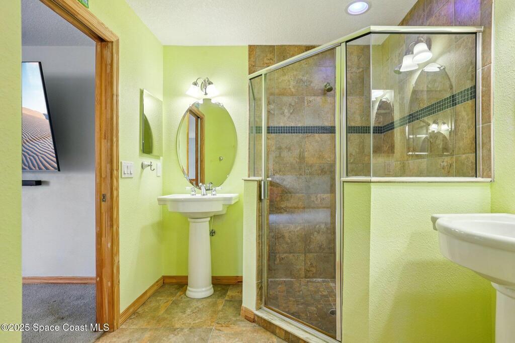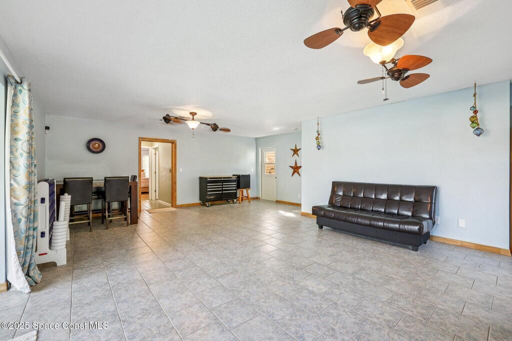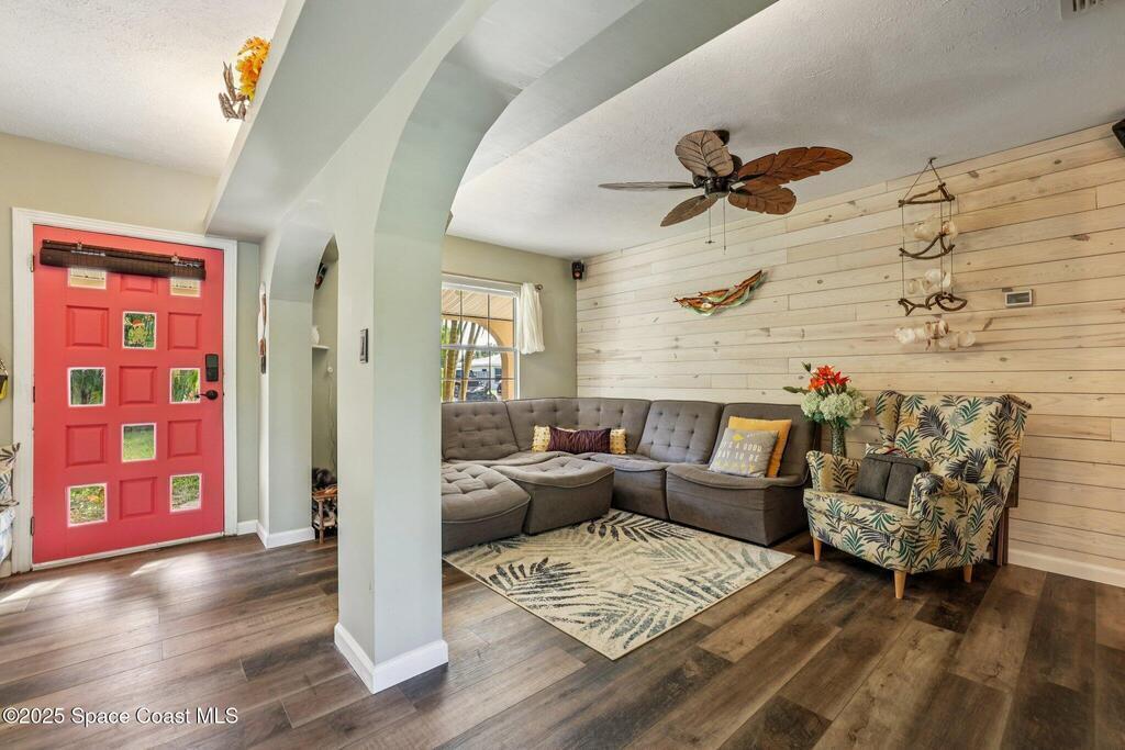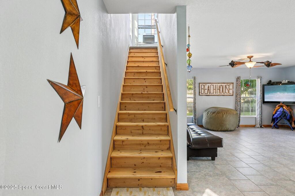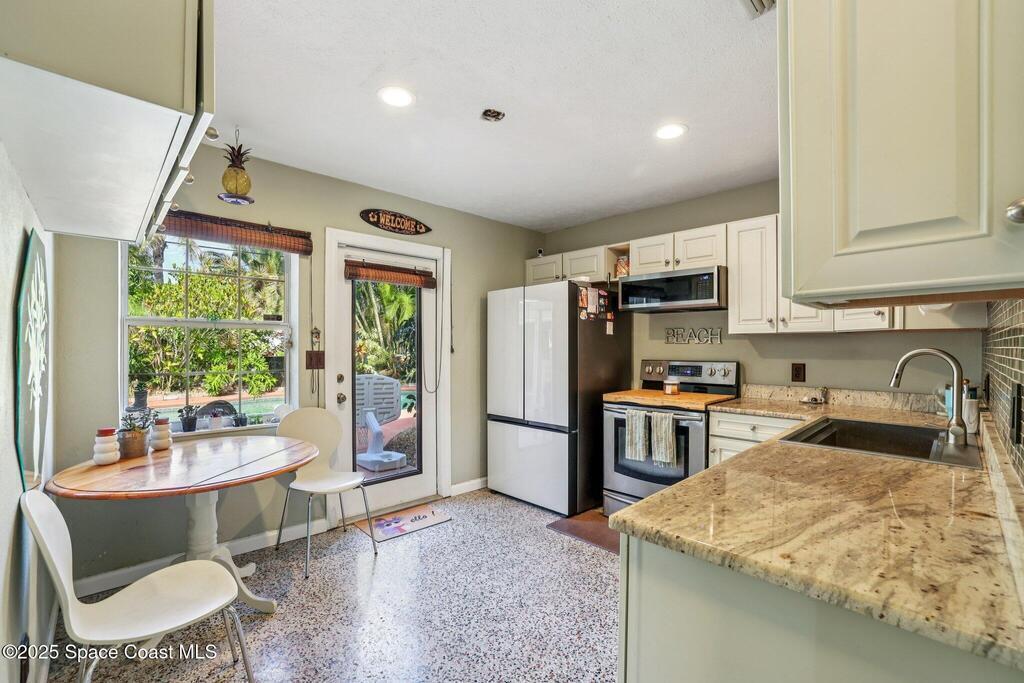 Just one block from the sparkling shores of Indialantic, this spacious 4-bedroom, 3-bath pool home offers the ideal setting to enjoy Florida coastal living. With 2,724 sq. ft. of interior space, an inviting in-ground pool, and multiple indoor/outdoor entertainment areas, this property is perfect for those seeking a full-time residence or a fantastic vacation retreat. The main level features terrazzo flooring in bedrooms and baths, luxury vinyl plank in the primary living spaces, and a bright kitchen complete with granite countertops, wood cabinetry, and a glass tile backsplash. Triple pocket sliders open wide to the pool deck, and outdoor bar seating, inviting seamless indoor-outdoor enjoyment. The upstairs primary suite offers a private balcony overlooking the pool, dual vanities, and a full bath, while an additional separate living area with tile flooring and private access presents excellent versatility for guests, hobbies, or potential rental opportunities.
