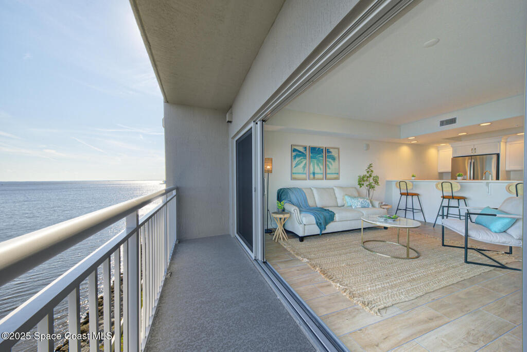 Exquisite River View! Direct Waterfront, 2 Bedroom, 2 Bathroom, River Front Condo with 1201 living sqft on 5th Floor built in 2023 located in Titusville right off the banks of the Indian River. This property is almost directly across the river from Nasa's Launch Pad giving a spectacular view of Launches all from the comfort of it's living room or balcony. This condo has much to offer with its open floor plan, tons of natural lighting, spacious kitchen with bright white wooden cabinetry, quartz countertops, black & stainless steel appliances and breakfast bar, tile flooring throughout. In unit, laundry closet, washer and dryer included. Under the building is one assigned parking space, there are additional open parking spaces in front of the building. Association Amenities offer a Community Pool, Fitness Center, Club House, the association fees include Cable TV, Internet, Water, Trash, Sewer and pest control. This property is worth taking a look at!