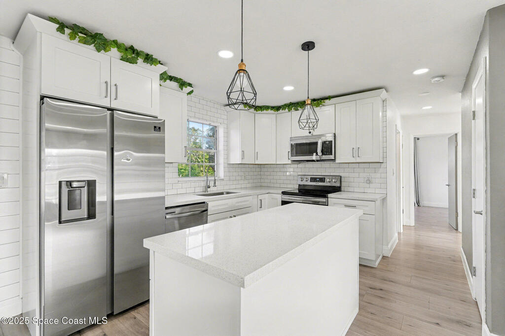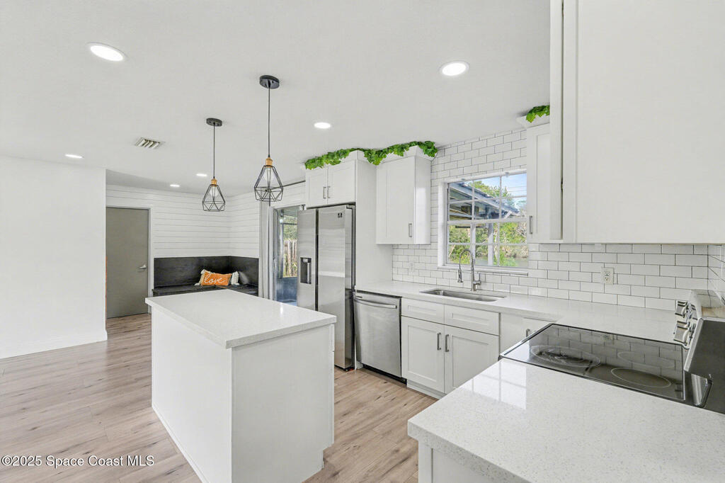 Move in ready with a beautiful waterfront view! This 3/1 home features an efficient layout including indoor laundry. Many recent renovations have been made to include a stunning kitchen with an island, featuring shaker cabinets with crown molding, subway tile backsplash, stainless appliances & quartz countertops. Updated bathroom, LVP flooring throughout, updated electrical, LED lighting and fans, drain lines have been replaced all the way to the road, and a brand new roof 11/25! Pond fed lawn irrigation with a new pump, large peaceful backyard with plenty of room for a shop or pool, and an extended driveway for additional parking. This home is located on a high and dry lot in the back of a quiet subdivision with minimal through traffic. Close proximity to dining and stores. Under a 30 minute drive to the beaches, the Space Center, and Viera!