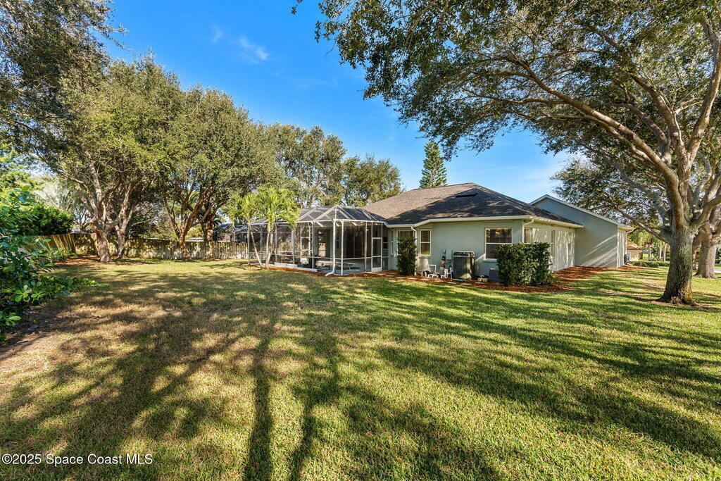 Welcome to River Grove, one of South Merritt Island's premier executive communities with a private community dock for fishing, kayaking, and sunset views on the Indian River. This inviting 4-bedroom, 2-bath home offers high ceilings, abundant natural light, and an open, comfortable layout. Formal living and dining rooms provide flexible space for everyday living or entertaining. The kitchen features an island, built-in desk, and breakfast nook, opening to the family room with wood flooring and pool views. The primary suite is spacious and private with a large custom walk-in closet and well-appointed bath. Enjoy peaceful pool views from the screened porch--perfect for relaxing. Updates include a 2018 roof, new A/C system in 2018 with new ductwork in 2021, fresh interior and exterior paint, and new Kohler toilets throughout. A well-cared-for home in a highly desirable South Merritt Island location.