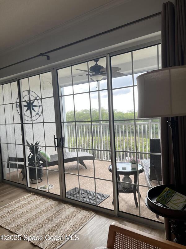 Come and Enjoy! Unfurnished Condo located in this well-maintained Condo complex. Paradise awaits you. You'll have a front row seat for the daily sensational sunsets from this spacious screened balcony, located on the canal and the Banana River, two blocks from the beach. This spacious two-bedroom two-bath condo has an updated kitchen with granite counters, newer stainless-steel appliances, breakfast bar, and eating area. Primary Bedroom bath has a double vanity separate from the shower & jetted tub, LV flooring throughout. All windows have Hurricane shutters. Boat and RV storage available on-site. There is boat-ramp access at adjacent Ramp Road Park. Amenities include: three pools, two tennis/pickle ball courts, riverfront boardwalk, and exercise room.Private one car garage w/remotethe