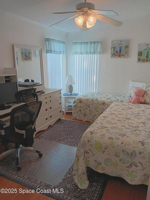 This spacious home has 3 bedrooms and all enclosed front room with French doors leading to the rest of the home. Large kitchen with pantry and plenty of cabinets. Open dining room and living room Separate master bedroom suite with bath plus 2 more bedrooms and full bath. All interior doors are 36'' wide. Home has many updates including, Roof 2023, Hot water heater 2023, AC 2018 just refurbished, water filter, refrigerator and washing machine brand new, Large lot with mature trees for shade, Barefoot Bay offers many amenities for all to enjoy including Private dock and beach. You own the land!