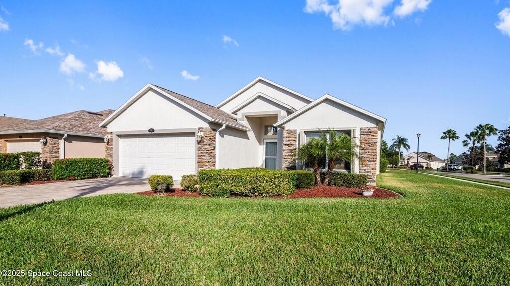 Located in one of the most sought-after 55+ gated communities, Grand Isle, this impeccably maintained corner-lot residence offers outstanding curb appeal with pavered driveway, walkway, and front porch, along with neatly edged planting beds filled with decorative stone. Accordion hurricane shutters provide added peace of mind. Step inside to a bright, open, and modern floor plan with soaring ceilings and abundant natural light. The heart of the home is the spacious kitchen, featuring solid wood cabinetry topped with quartz countertops and designed to overlook the dining and great rooms--ensuring the chef is always part of the conversation and ideal for entertaining. From the moment you enter, enjoy uninterrupted sight lines that flow seamlessly through the great room and into the garden room beyond. The spacious owner's suite is a private retreat, complete with a lovely ensuite bath offering a raised-height double-sink vanity, soaking tub, walk-in shower, and a generous walk-in closet.