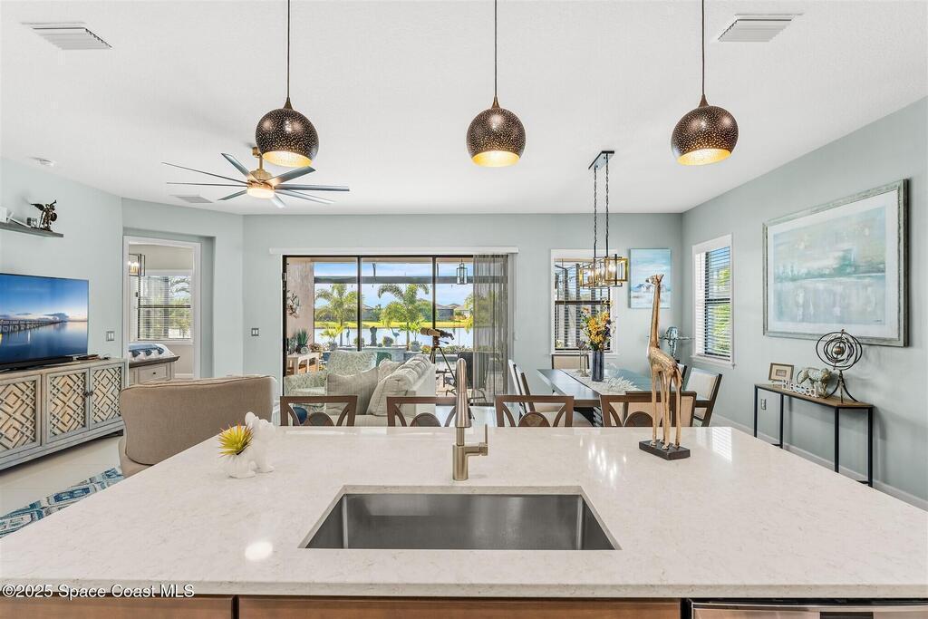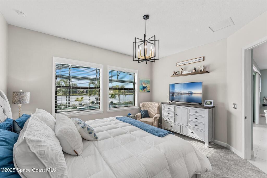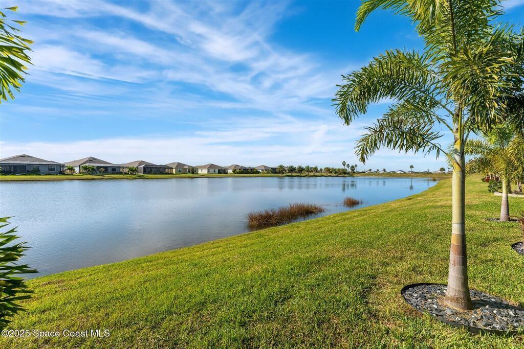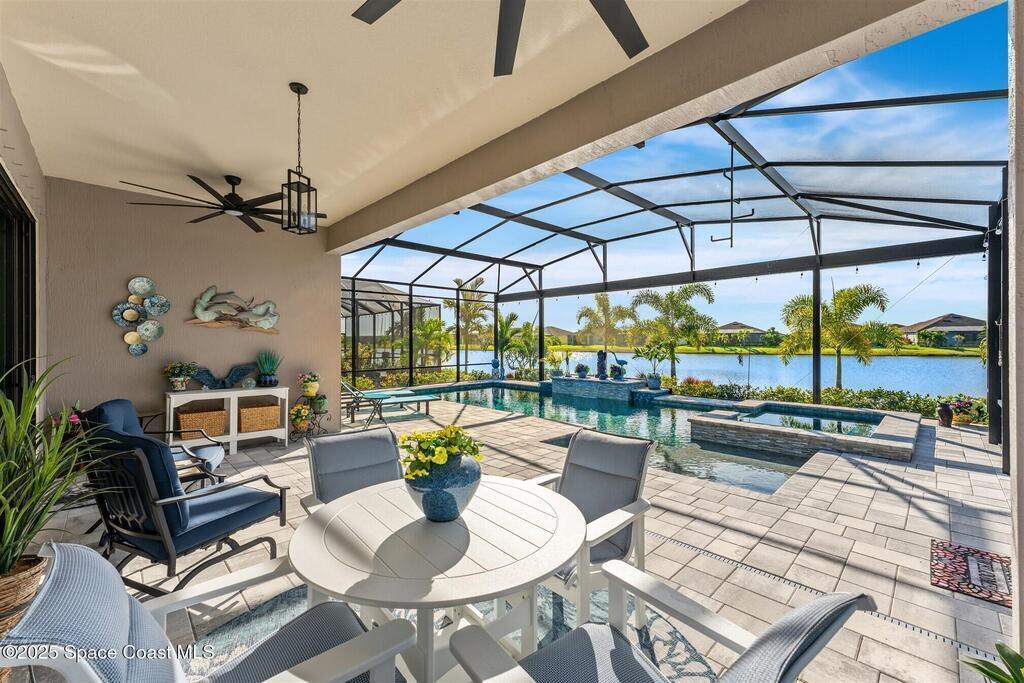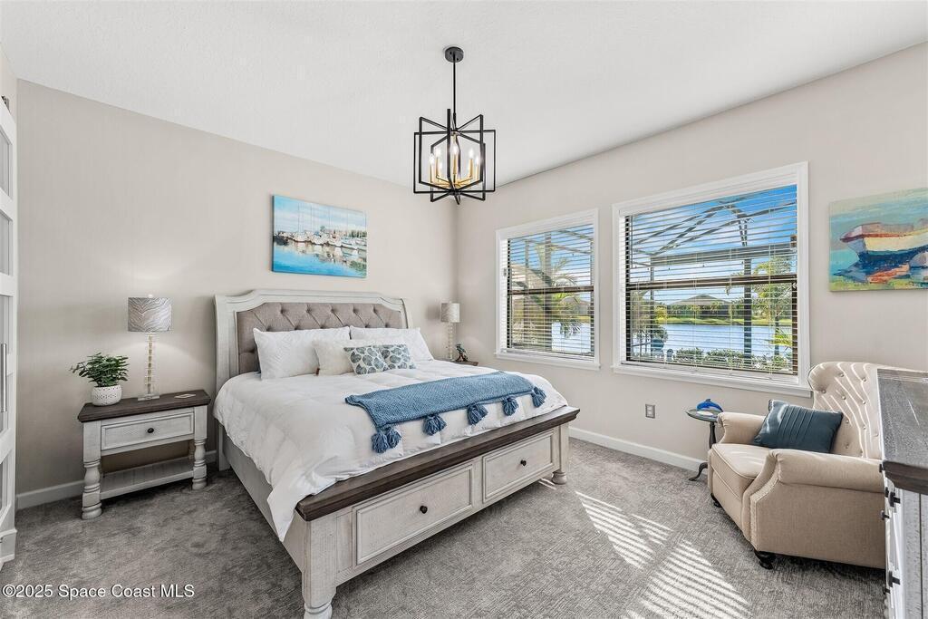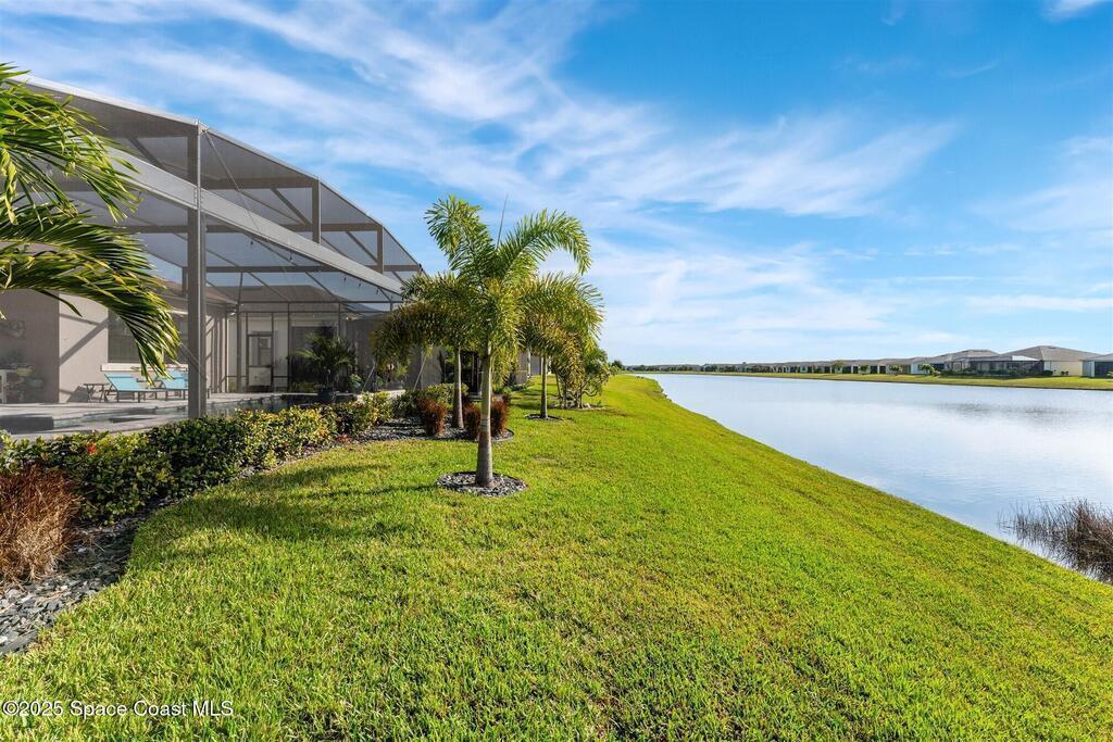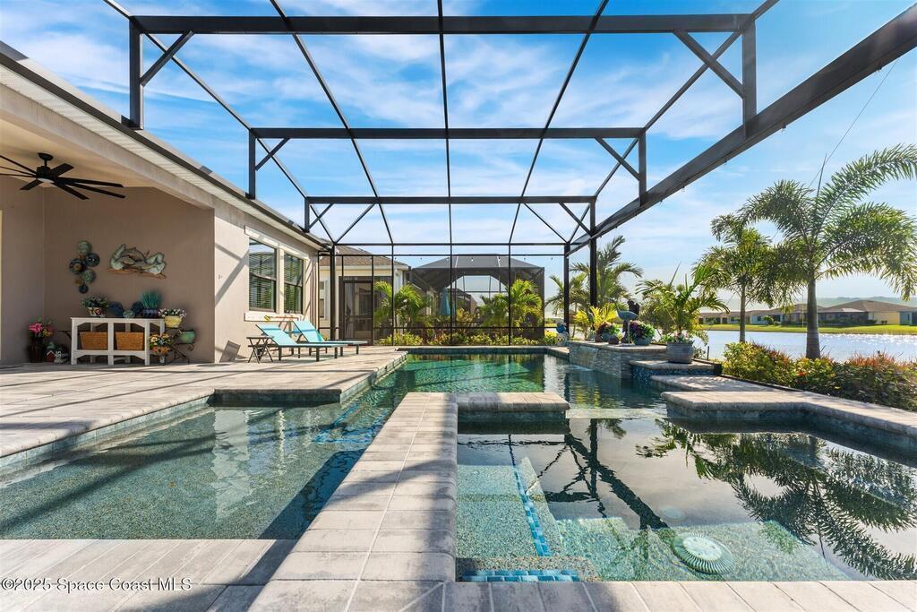 Out of the pages of a decorator magazine, this stunning pool home in Bridgewater, Viera's resort like 55+ community, has added features that will amaze you. Bask in the luxurious screened-in heated saltwater pool and spa (2024) overlooking the lake. Entertain in the elegant kitchen w/ upgraded cabinets w/soft close door/drawers, microwave/convection wall ovens and cooktop, designer backsplash and wine/coffee bar. Upgraded lighting featuring pendant lights, above and below cabinet lighting and custom light fixtures. Luxuriate in the stunning primary bath w/new barn door entry and remodeled tile shower! Primary walk-in complete w/built-ins and heated towel bar! Added professional landscaping and palm trees, lighting, stone beds, and exterior and interior were painted in 2024. Features include 8' doors, marble window-sills, LED lighting, garage with epoxy floor. Bridgewater's private clubhouse includes a heated pool, tennis & pickleball courts, a movie theater, fitness room, billiards!