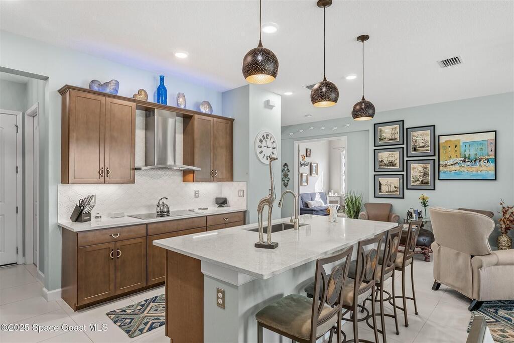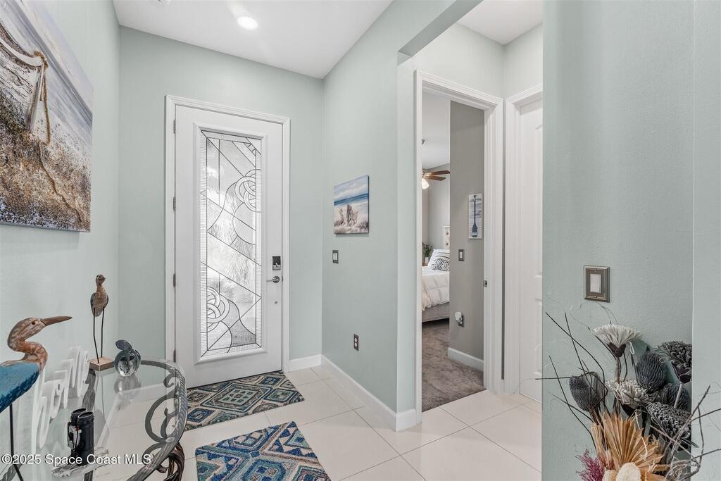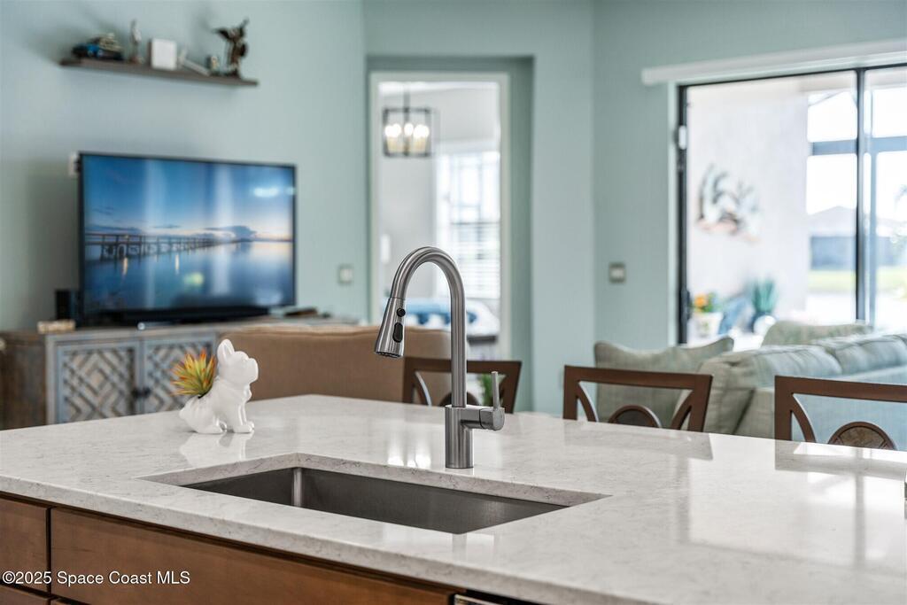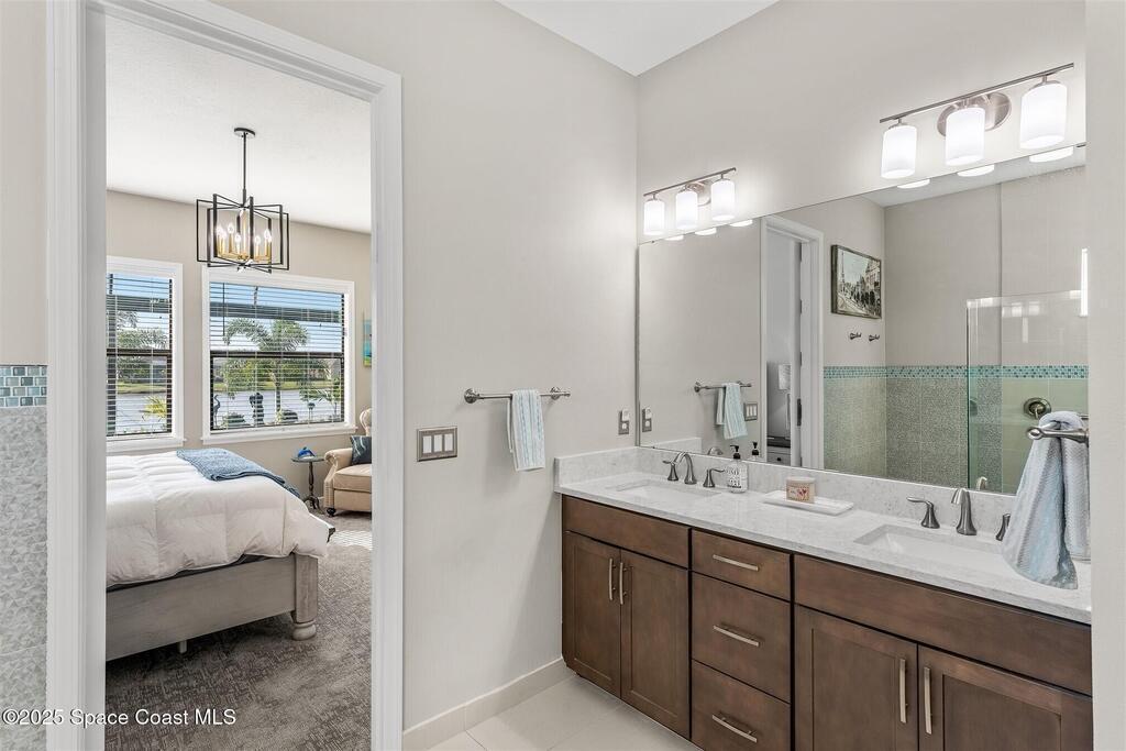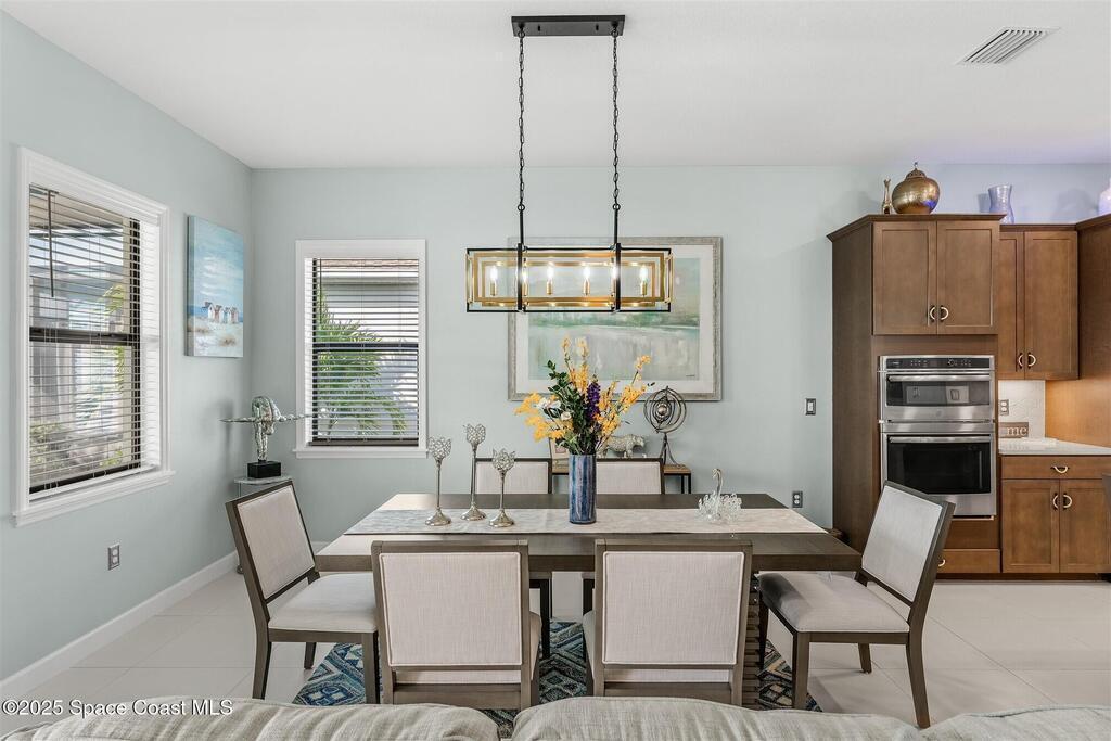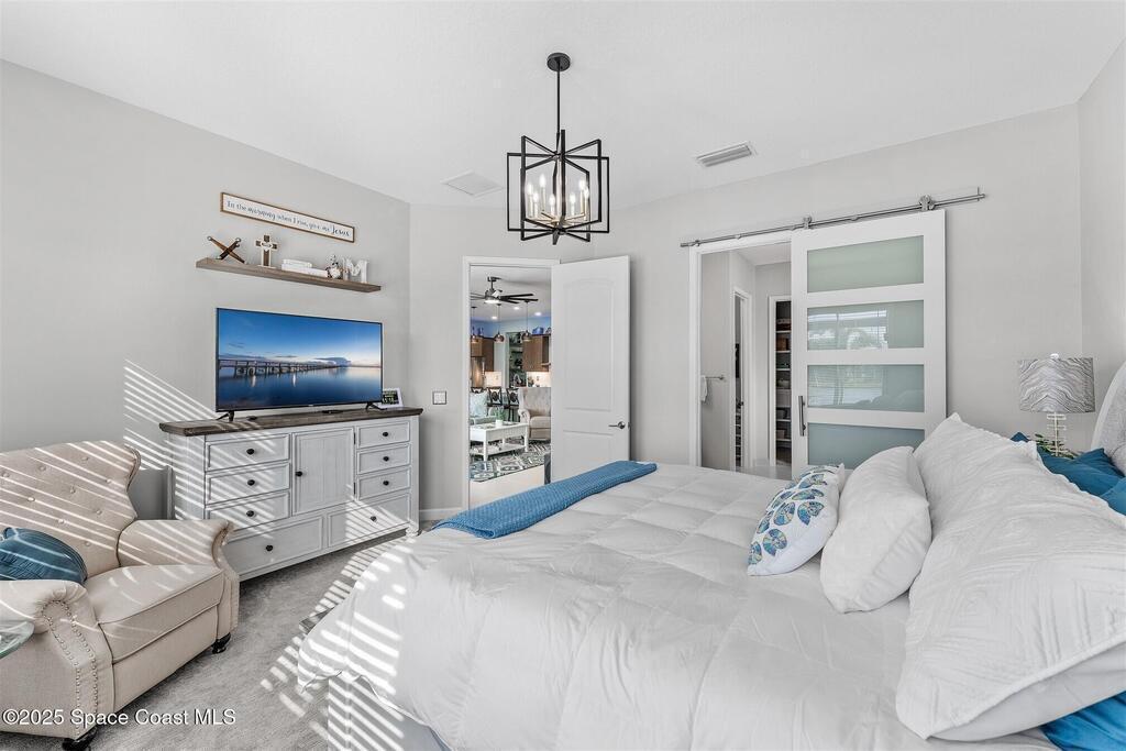 Out of the pages of a decorator magazine, this stunning pool home in Bridgewater, Viera's resort like 55+ community, has added features that will amaze you. Bask in the luxurious screened-in heated saltwater pool and spa (2024) overlooking the lake. Entertain in the elegant kitchen w/ upgraded cabinets w/soft close door/drawers, microwave/convection wall ovens and cooktop, designer backsplash and wine/coffee bar. Upgraded lighting featuring pendant lights, above and below cabinet lighting and custom light fixtures. Luxuriate in the stunning primary bath w/new barn door entry and remodeled tile shower! Primary walk-in complete w/built-ins and heated towel bar! Added professional landscaping and palm trees, lighting, stone beds, and exterior and interior were painted in 2024. Features include 8' doors, marble window-sills, LED lighting, garage with epoxy floor. Bridgewater's private clubhouse includes a heated pool, tennis & pickleball courts, a movie theater, fitness room, billiards!