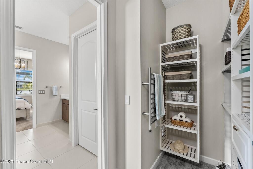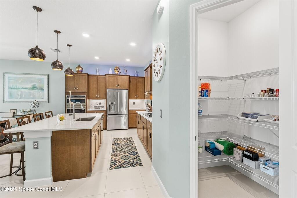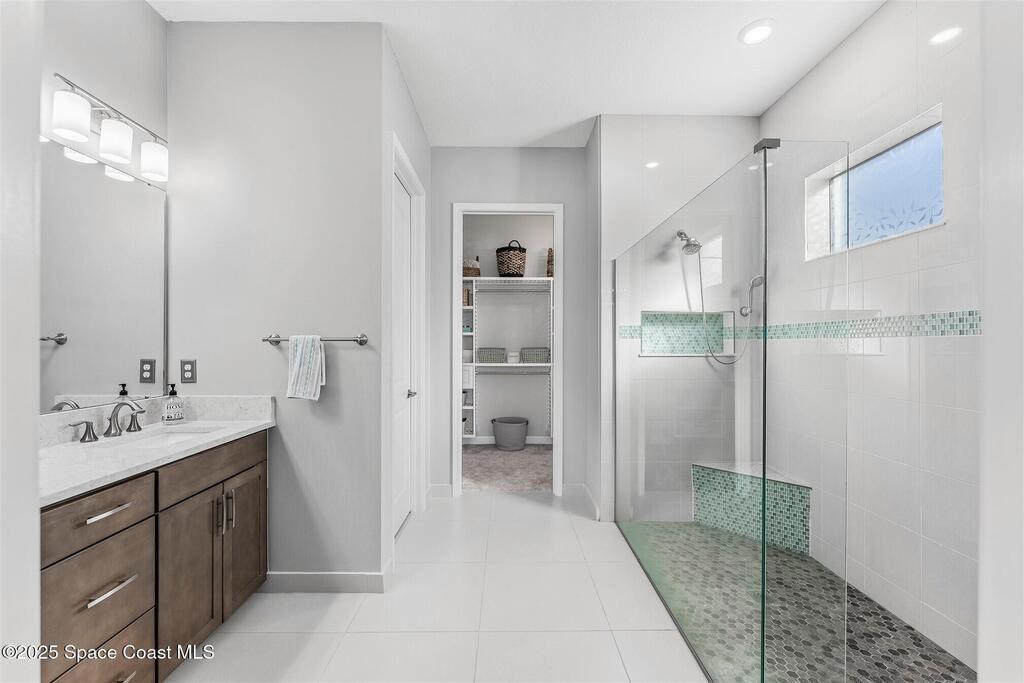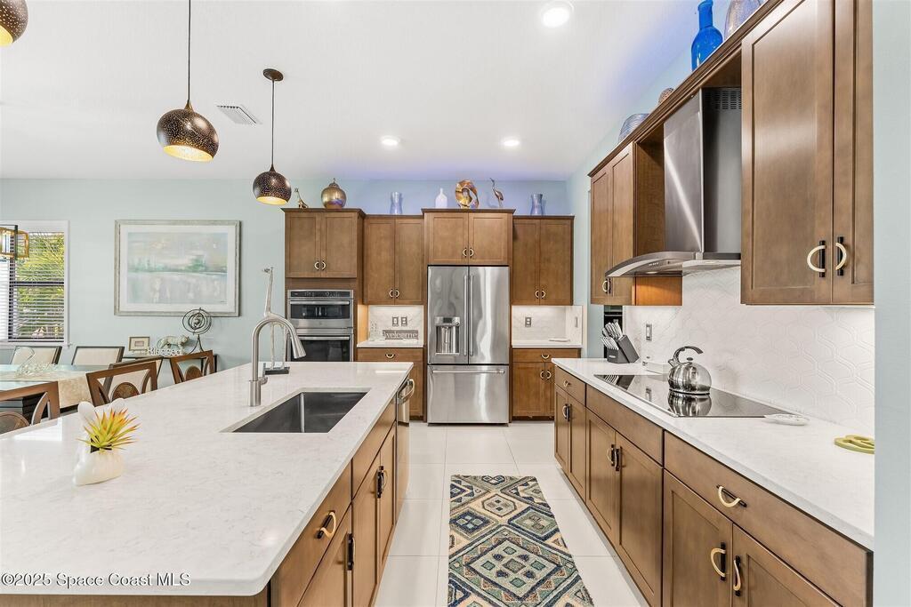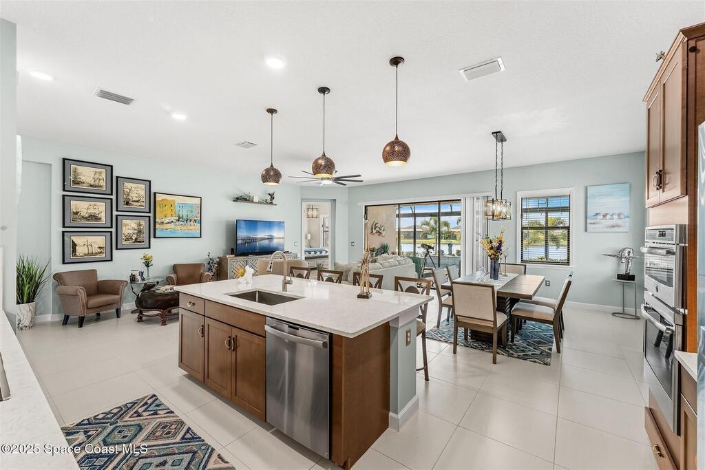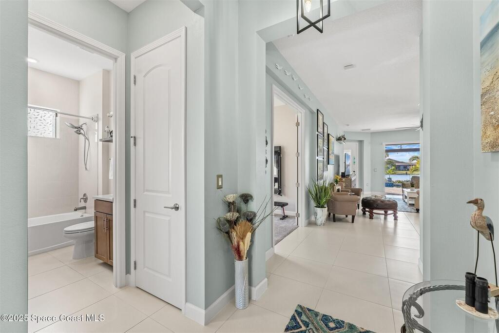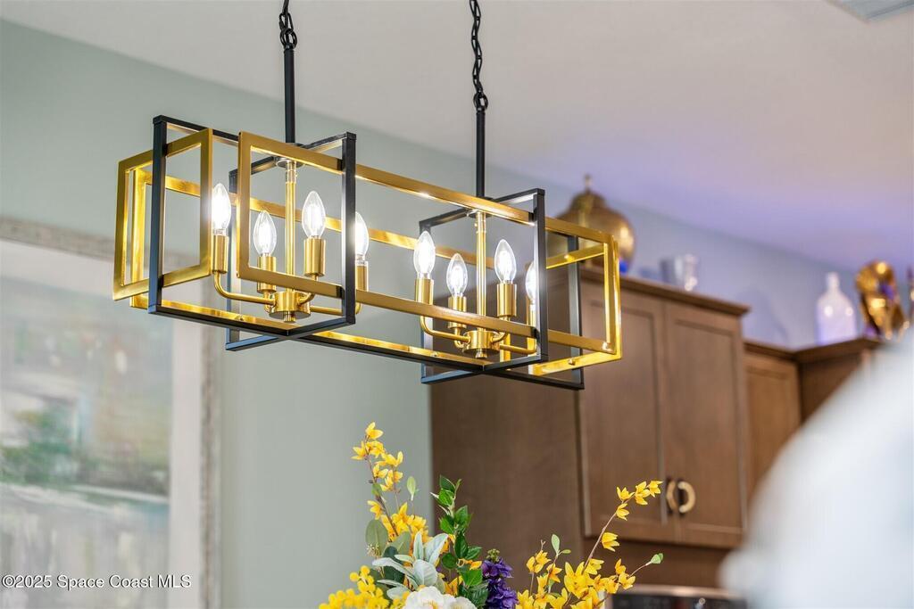 Out of the pages of a decorator magazine, this stunning pool home in Bridgewater, Viera's resort like 55+ community, has added features that will amaze you. Bask in the luxurious screened-in heated saltwater pool and spa (2024) overlooking the lake. Entertain in the elegant kitchen w/ upgraded cabinets w/soft close door/drawers, microwave/convection wall ovens and cooktop, designer backsplash and wine/coffee bar. Upgraded lighting featuring pendant lights, above and below cabinet lighting and custom light fixtures. Luxuriate in the stunning primary bath w/new barn door entry and remodeled tile shower! Primary walk-in complete w/built-ins and heated towel bar! Added professional landscaping and palm trees, lighting, stone beds, and exterior and interior were painted in 2024. Features include 8' doors, marble window-sills, LED lighting, garage with epoxy floor. Bridgewater's private clubhouse includes a heated pool, tennis & pickleball courts, a movie theater, fitness room, billiards!