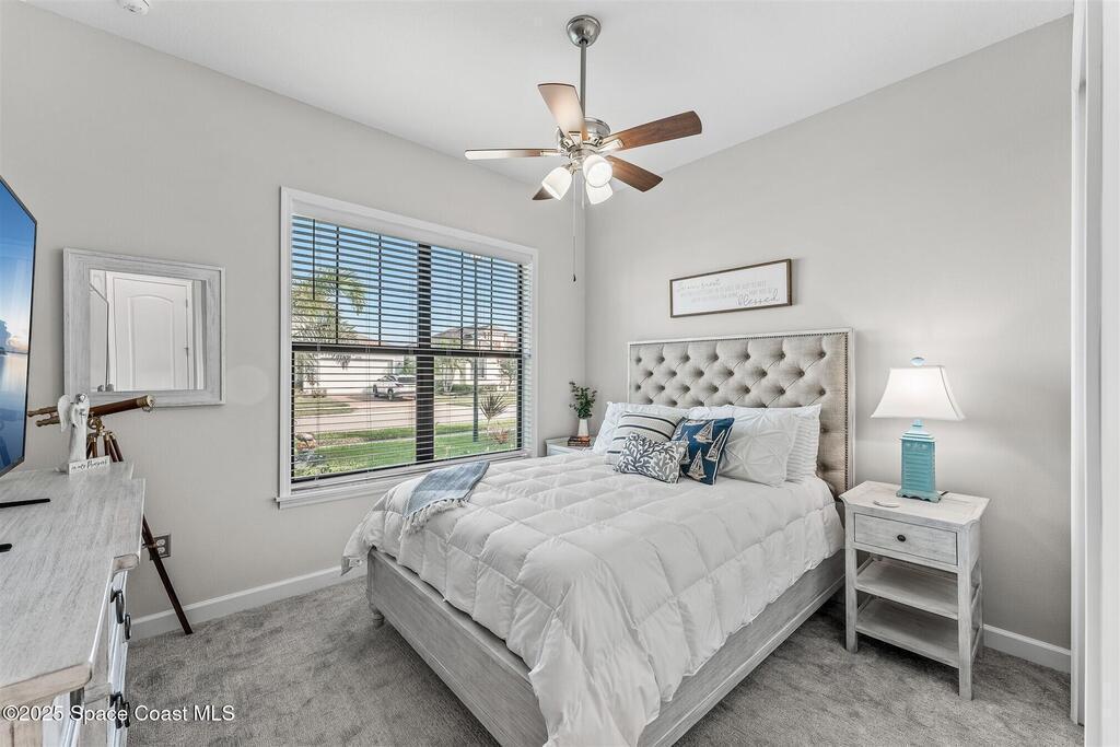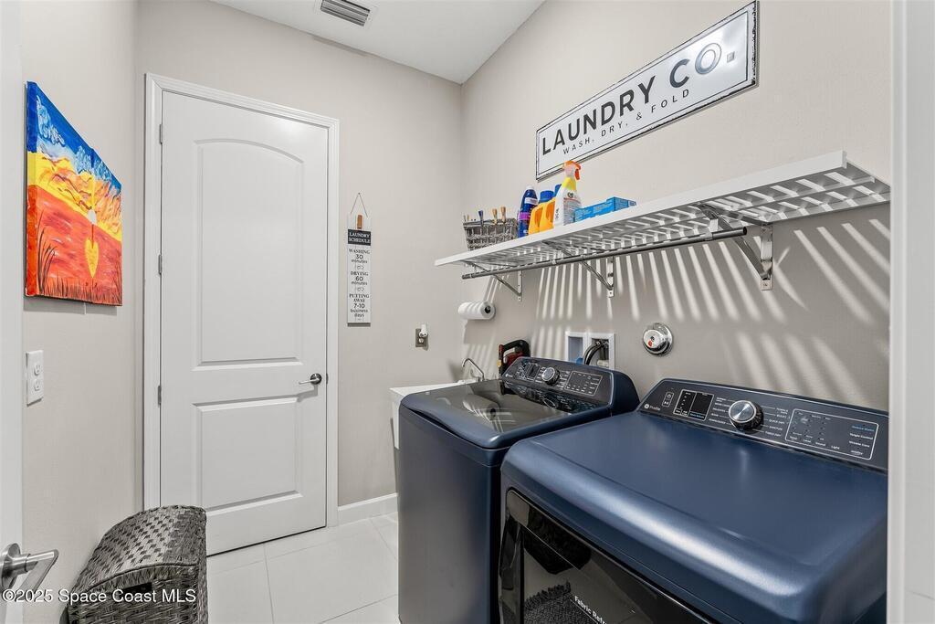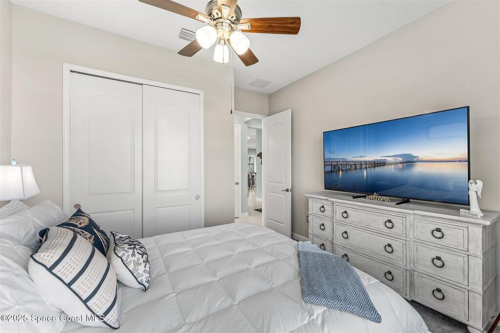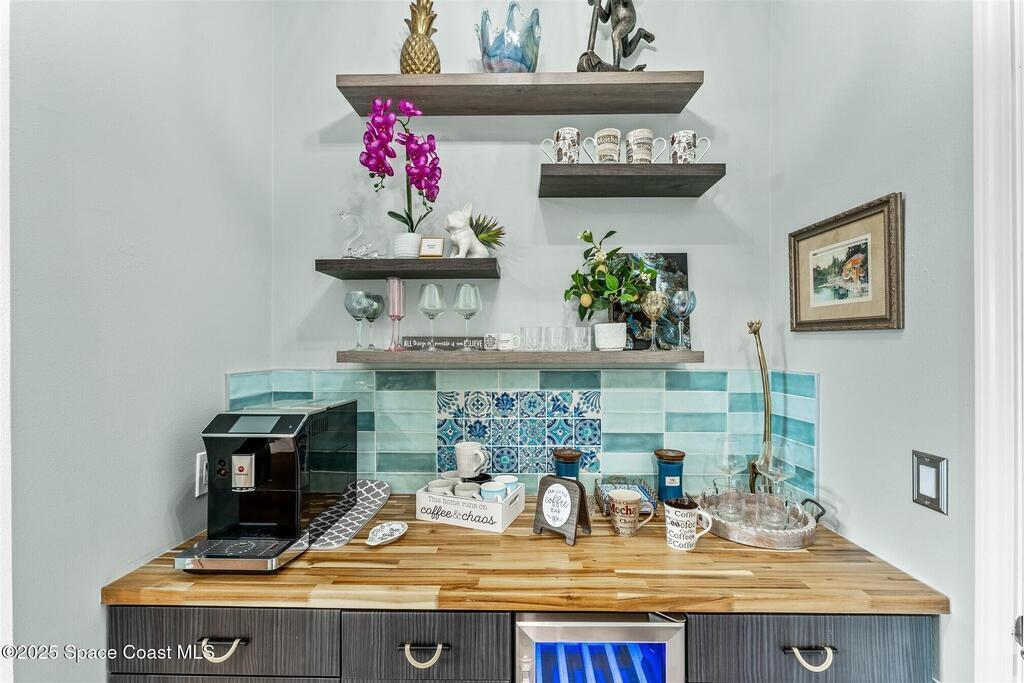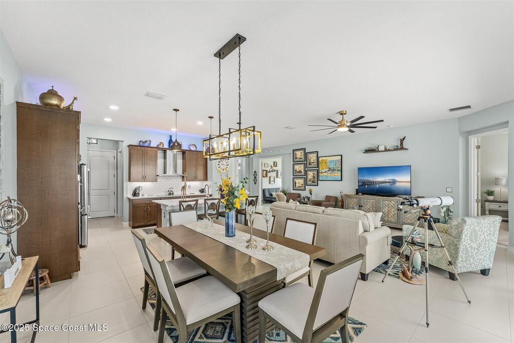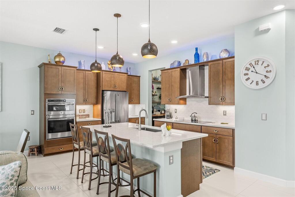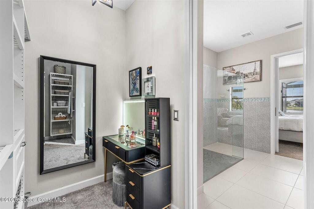 Out of the pages of a decorator magazine, this stunning pool home in Bridgewater, Viera's resort like 55+ community, has added features that will amaze you. Bask in the luxurious screened-in heated saltwater pool and spa (2024) overlooking the lake. Entertain in the elegant kitchen w/ upgraded cabinets w/soft close door/drawers, microwave/convection wall ovens and cooktop, designer backsplash and wine/coffee bar. Upgraded lighting featuring pendant lights, above and below cabinet lighting and custom light fixtures. Luxuriate in the stunning primary bath w/new barn door entry and remodeled tile shower! Primary walk-in complete w/built-ins and heated towel bar! Added professional landscaping and palm trees, lighting, stone beds, and exterior and interior were painted in 2024. Features include 8' doors, marble window-sills, LED lighting, garage with epoxy floor. Bridgewater's private clubhouse includes a heated pool, tennis & pickleball courts, a movie theater, fitness room, billiards!