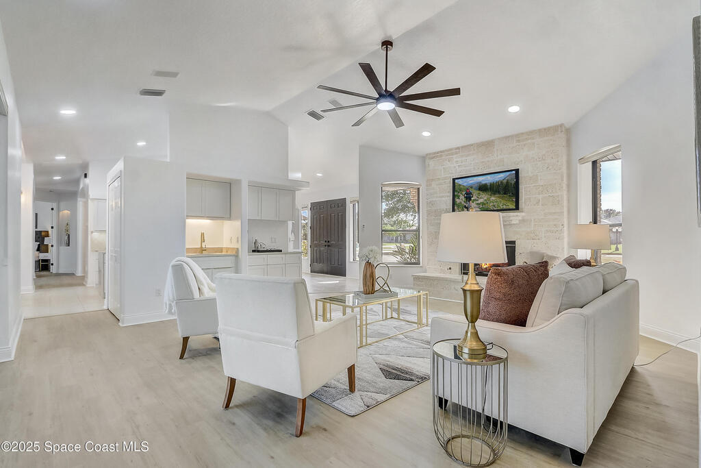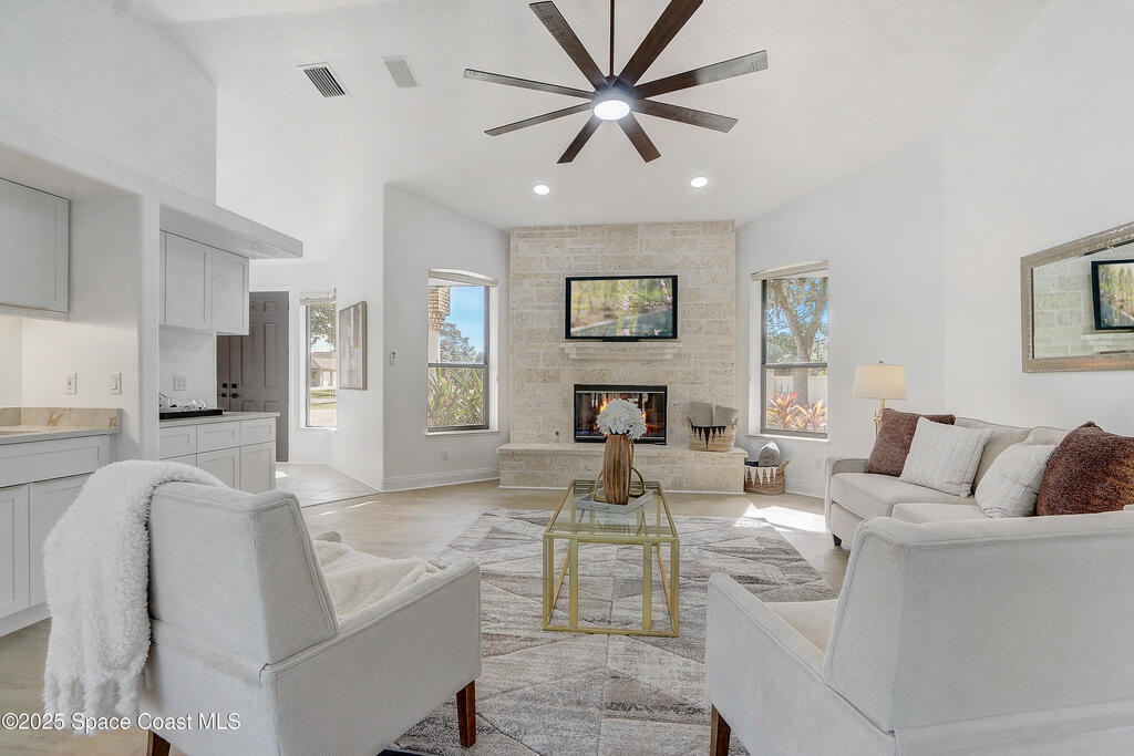 This exceptional single-story coastal residence presents a rare combination of architectural integrity, refined design, and uncompromising privacy. Solid block construction, no HOA restrictions, and a full one-acre homesite create a level of freedom and permanence that is increasingly difficult to find. Professionally remodeled in 2025 and maintained in excellent condition, the home offers a turnkey luxury experience defined by thoughtful upgrades and enduring quality. The interior unfolds with light-filled living spaces and a seamless, open flow ideal for both elevated entertaining and everyday living. The kitchen and bathrooms are finished with elegant quartz countertops, complemented by new white shaker cabinetry and stainless steel appliances, delivering a clean, timeless aesthetic with modern sophistication. Designed for effortless indoor-outdoor living, the home opens to a screened, heated pool, creating a private resort-style setting perfect for year-round enjoyment.