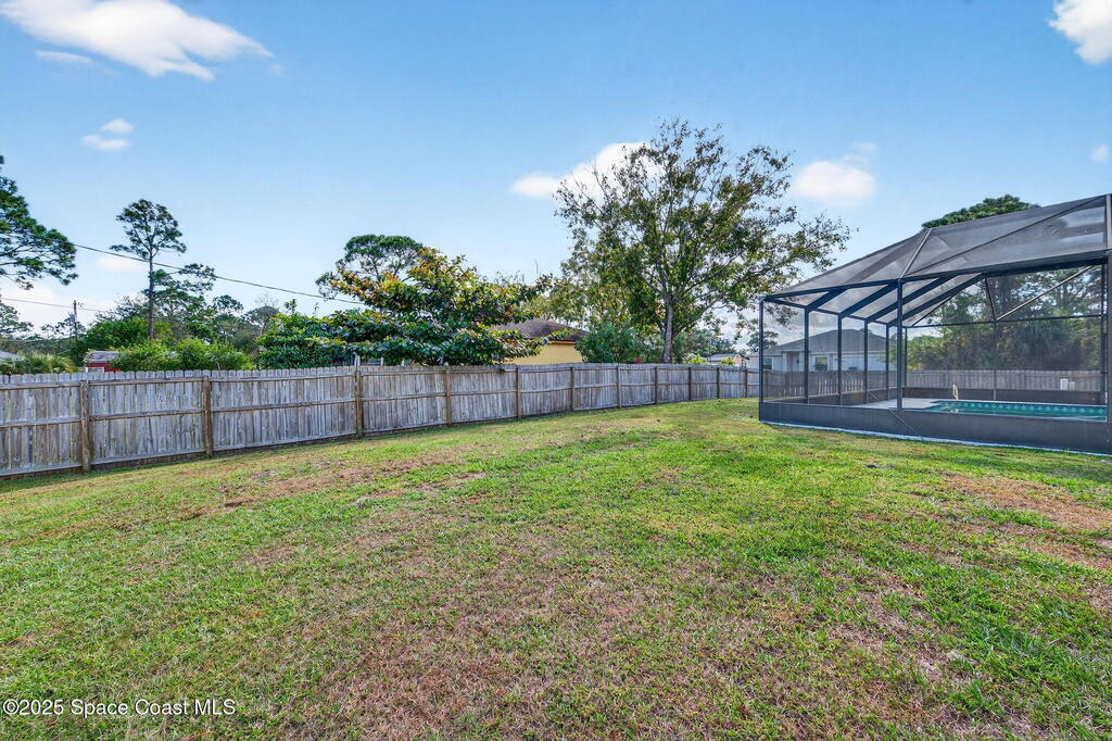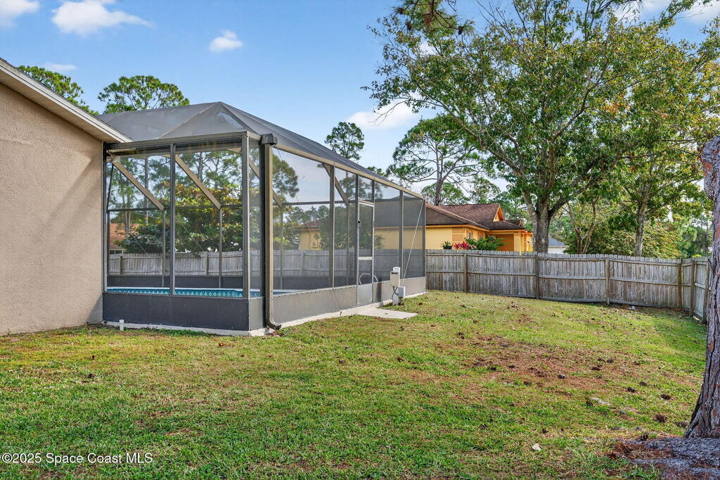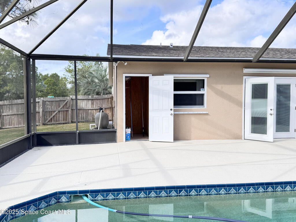 Situated on a spacious .51-acre double lot near the desirable Bayside Lakes community, this well-maintained 3-bedroom, 2-bath, 2-car garage pool home offers comfort, flexibility, and room to grow. The screened in-ground pool is complemented by a new pool deck and a dedicated storage room for pool equipment, creating an ideal setting for outdoor living and entertaining. Inside, the home features no carpet, with tile and manufactured hardwood flooring throughout. The kitchen showcases rich cherry cabinetry, granite countertops, and high-end stainless steel appliances, while both bathrooms also feature granite finishes. All bedrooms include walk-in closets, and a dedicated Flex/office provides ideal space for remote work or study. The garage features new epoxy flooring and the laundry room, has been freshly painted for a clean, updated look. A second driveway with culvert and gated access leads to the mostly cleared additional lot, offering endless possibilities for storage,