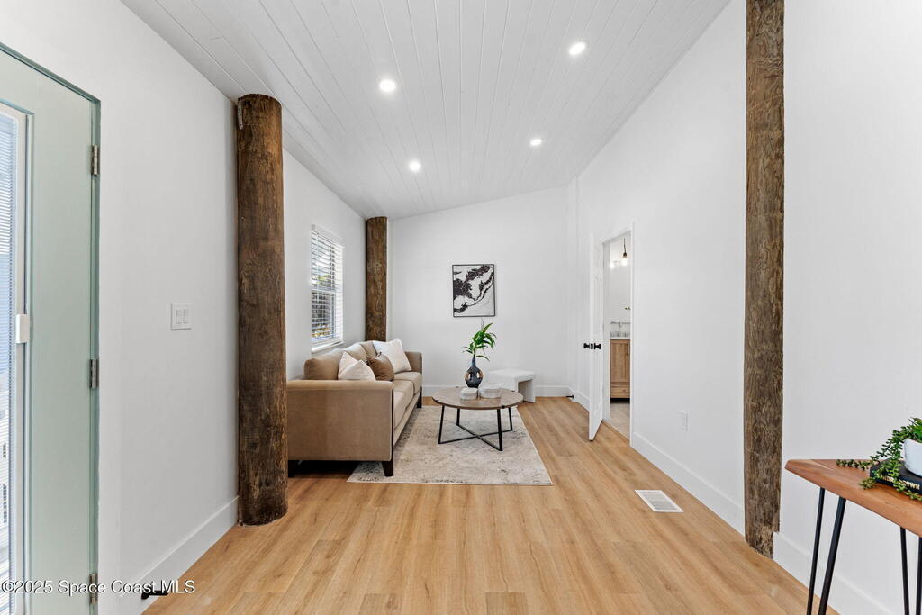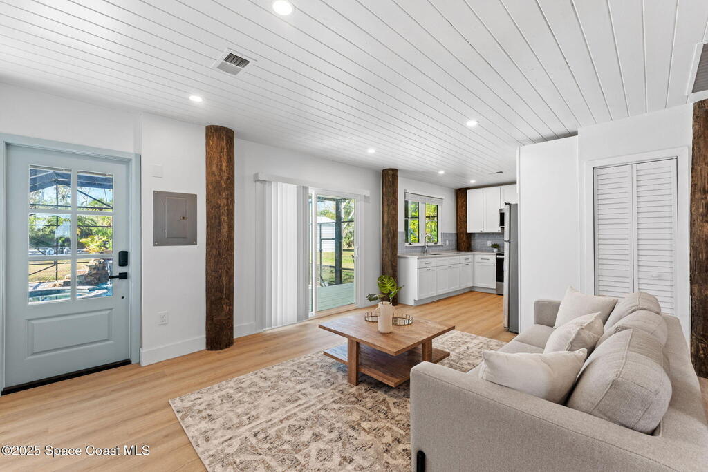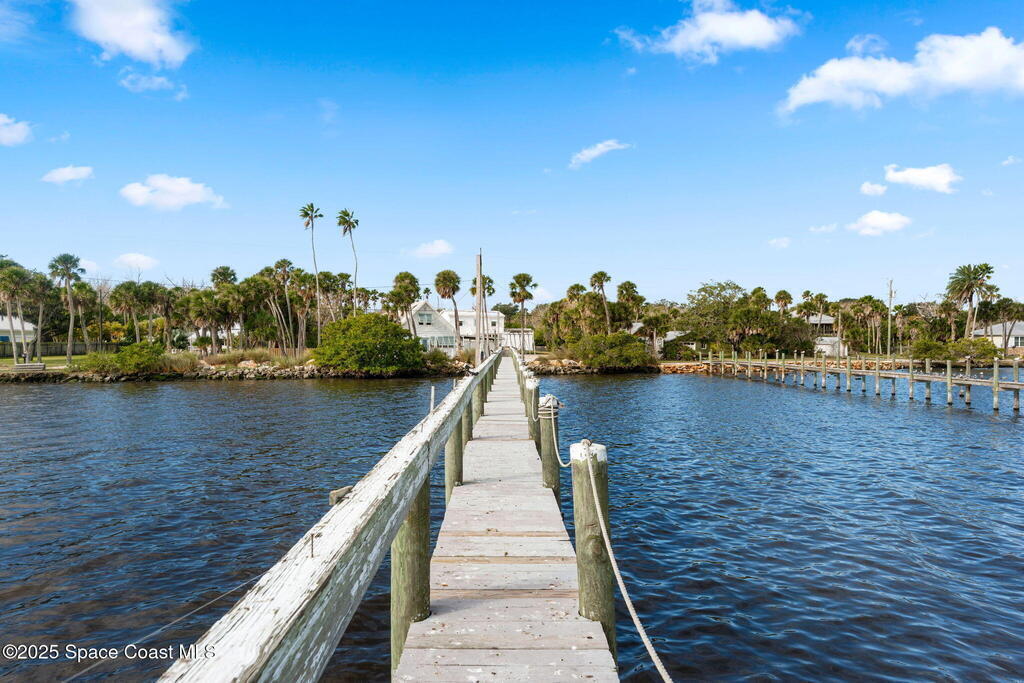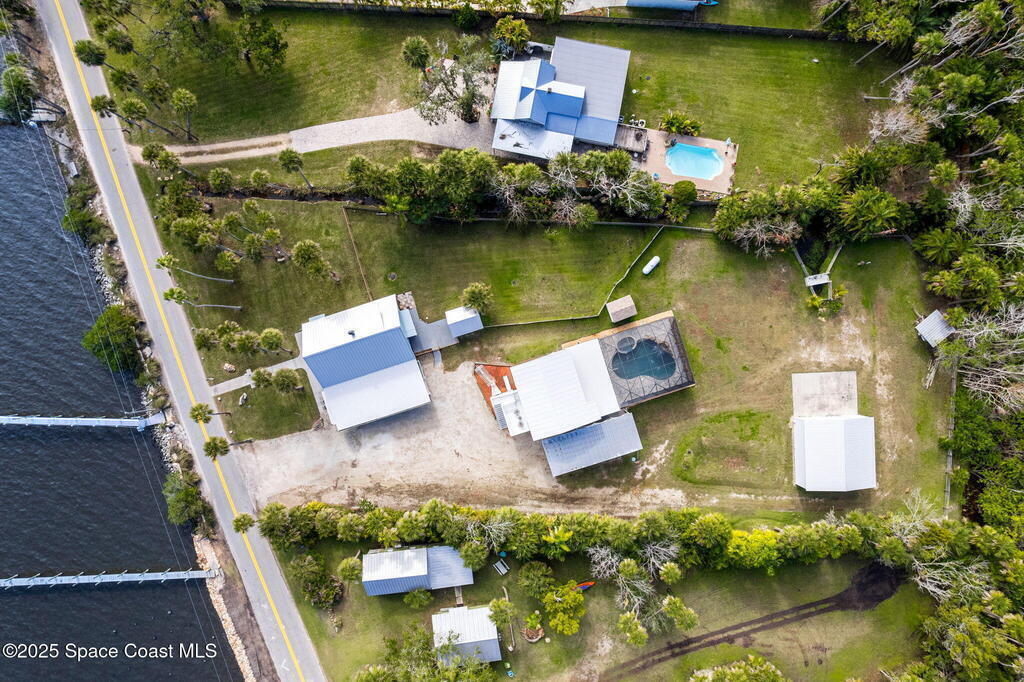One of the most unique Waterfront compounds on 1.21 Acres on the Indian River! This property features a 1914 Key West style home and a 2009 Barn both completely renovated and a large metal garage. Perfect for an owner's home and rental or any configuration you desire! The main house has been completely restored with a complete re-pipe (PVC), metal roof, 2020 AC, 29k crawlspace SmartJack system for foundation, sump pump, restored windows and refinished original floors. Brand new kitchen and bathrooms in both properties includes Taj Mahal Quartz, high end cabinetry and brushed gold hardware. Two septics replaced in 2021. Barn has upstairs apartment and clubhouse downstairs for the pool. 2021 HEATED designer Pool/spa/grotto w/waterfall and fountains and 51k screen enclosure. Metal garage w/power/water in back of property along w/small fishing pond. Covered RV pad w/hookups. 350ft Dock w/power+water with two levels for NASA views and rocket launches. Newer 10k lb boat lift in 20x40 slip.