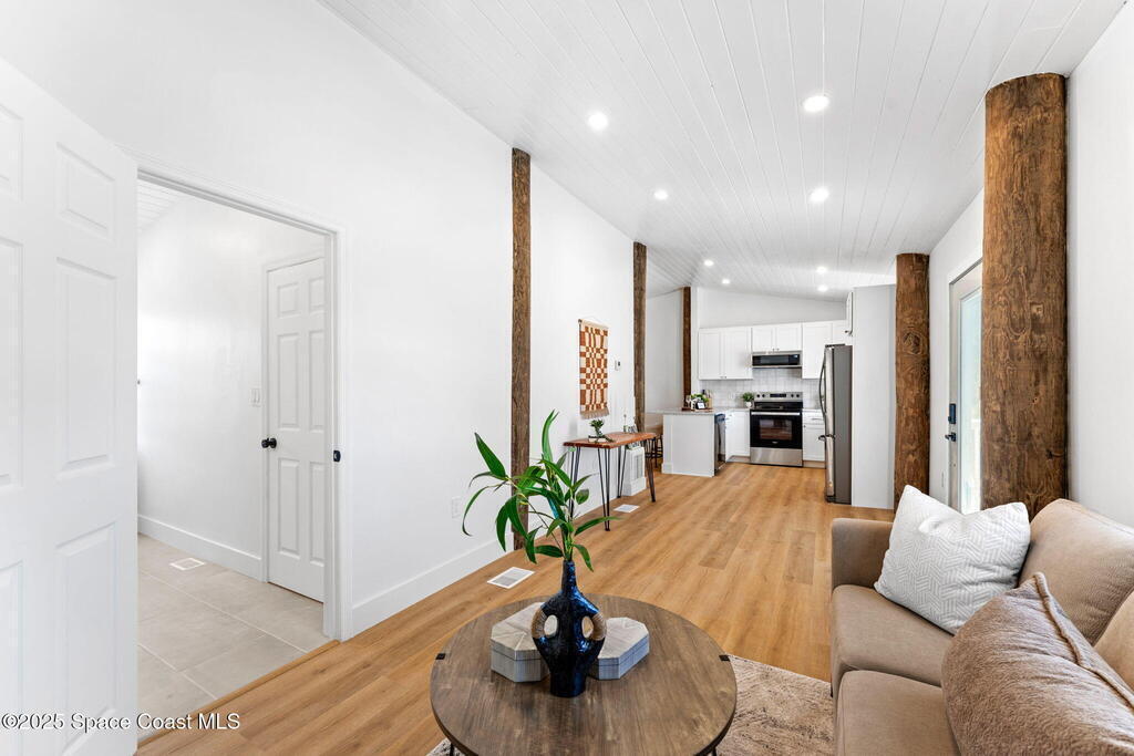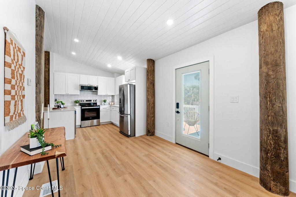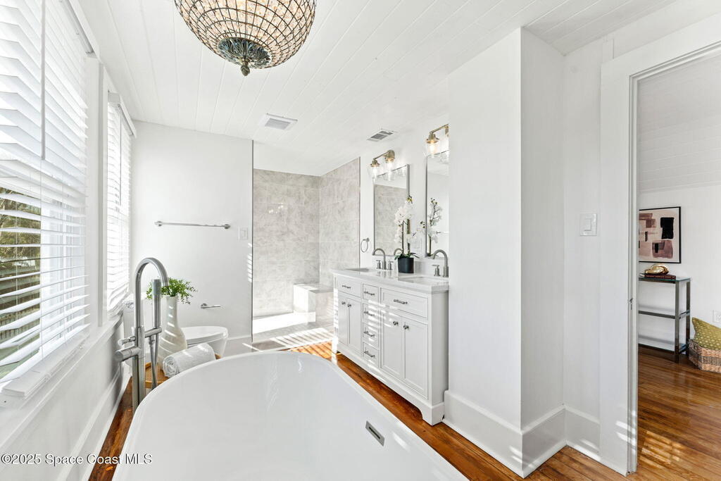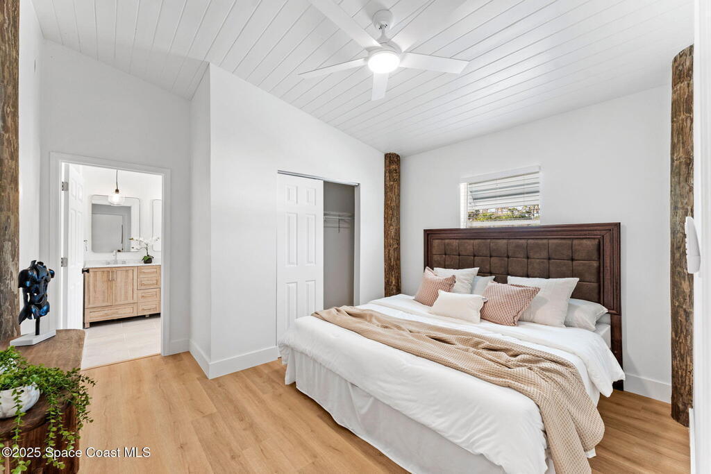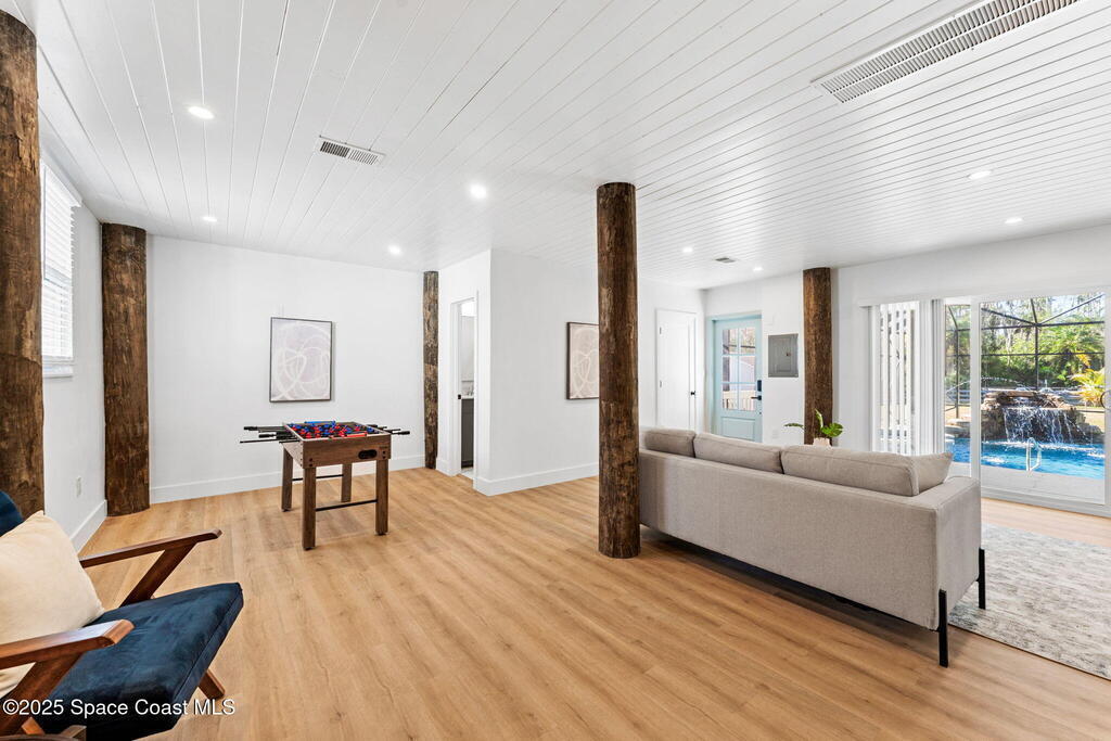 One of the most unique Waterfront compounds on 1.21 Acres on the Indian River! This property features a 1914 Key West style home and a 2009 Barn both completely renovated and a large metal garage. Perfect for an owner's home and rental or any configuration you desire! The main house has been completely restored with a complete re-pipe (PVC), metal roof, 2020 AC, 29k crawlspace SmartJack system for foundation, sump pump, restored windows and refinished original floors. Brand new kitchen and bathrooms in both properties includes Taj Mahal Quartz, high end cabinetry and brushed gold hardware. Two septics replaced in 2021. Barn has upstairs apartment and clubhouse downstairs for the pool. 2021 HEATED designer Pool/spa/grotto w/waterfall and fountains and 51k screen enclosure. Metal garage w/power/water in back of property along w/small fishing pond. Covered RV pad w/hookups. 350ft Dock w/power+water with two levels for NASA views and rocket launches. Newer 10k lb boat lift in 20x40 slip.
