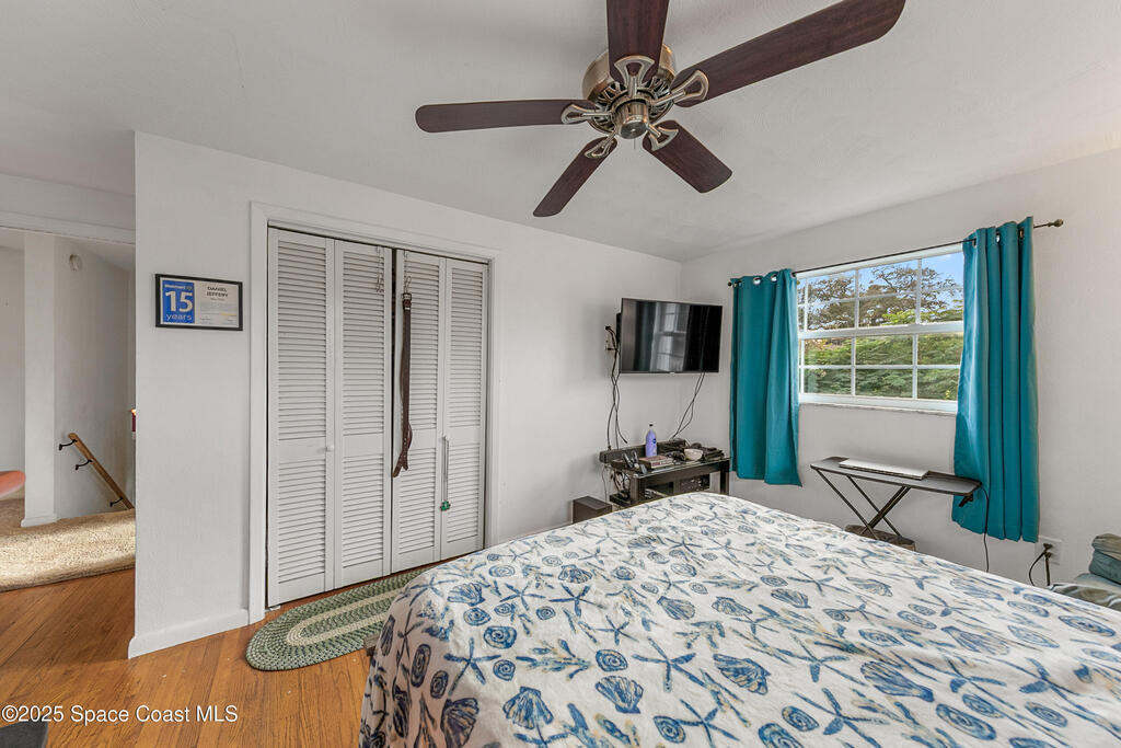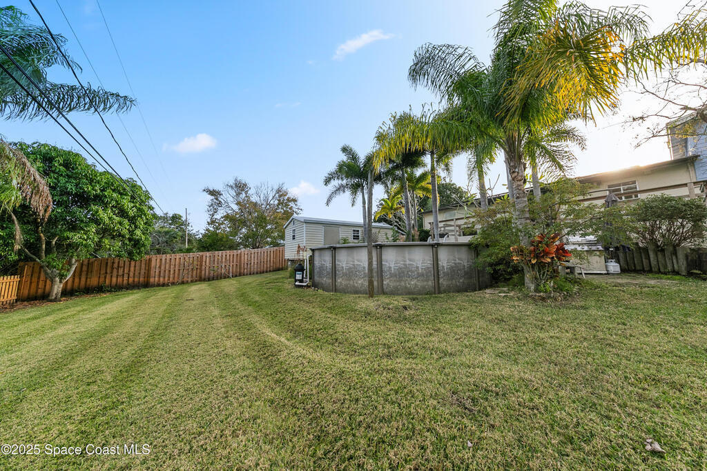 Split-level home with scenic backdrop overlooking Elbow Creek. Entry level features a living/dining room combo and updated kitchen with sliding doors to a large patio overlooking a lush backyard with palm trees, shrubs, and a mango tree. Upper level offers 3 bedrooms with wood floors and 2 baths. Lower level includes a spacious living room, bedroom, bath, and laundry room--ideal for an in-law suite or rental opportunity. Updates include new sewer lines throughout, roof (2022), water heater (2020), AC (2021), accordion shutters, brand new impact front door, new wood fence, and high-end kitchen appliances. Above-ground pool (4 yrs) with excellent pump system. Extra concrete slab on SW side accommodates boat, trailer, or RV. Oversized shed frees garage for parking. New Hardie board siding on 2-story section. Centrally located minutes to Downtown Eau Gallie, shopping, dining, and the beach.