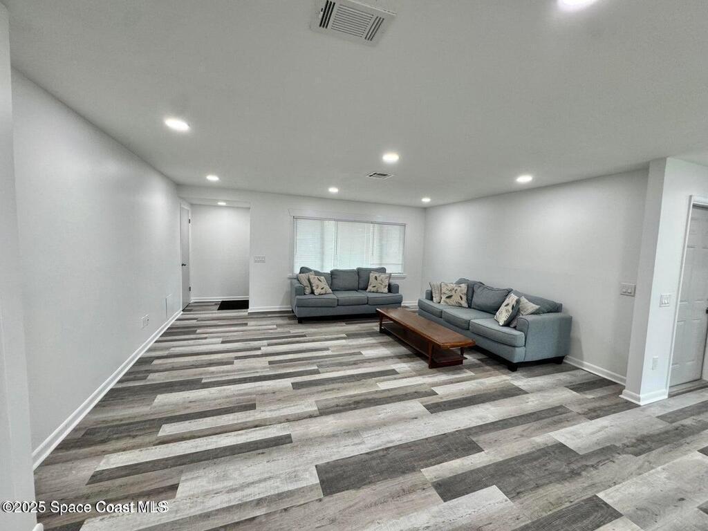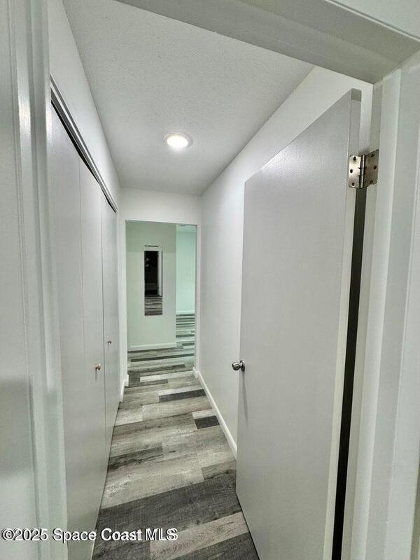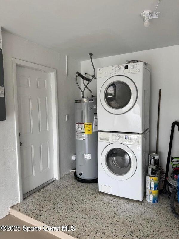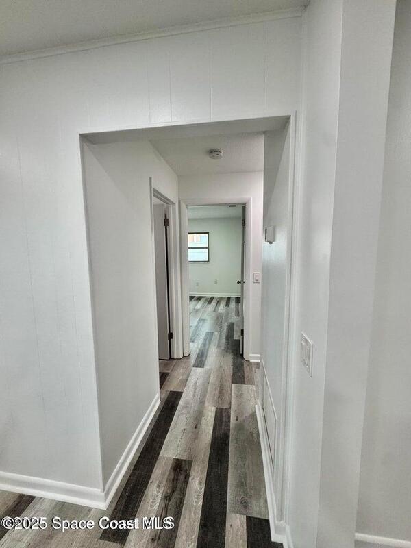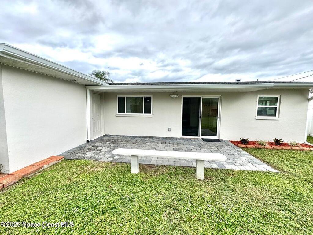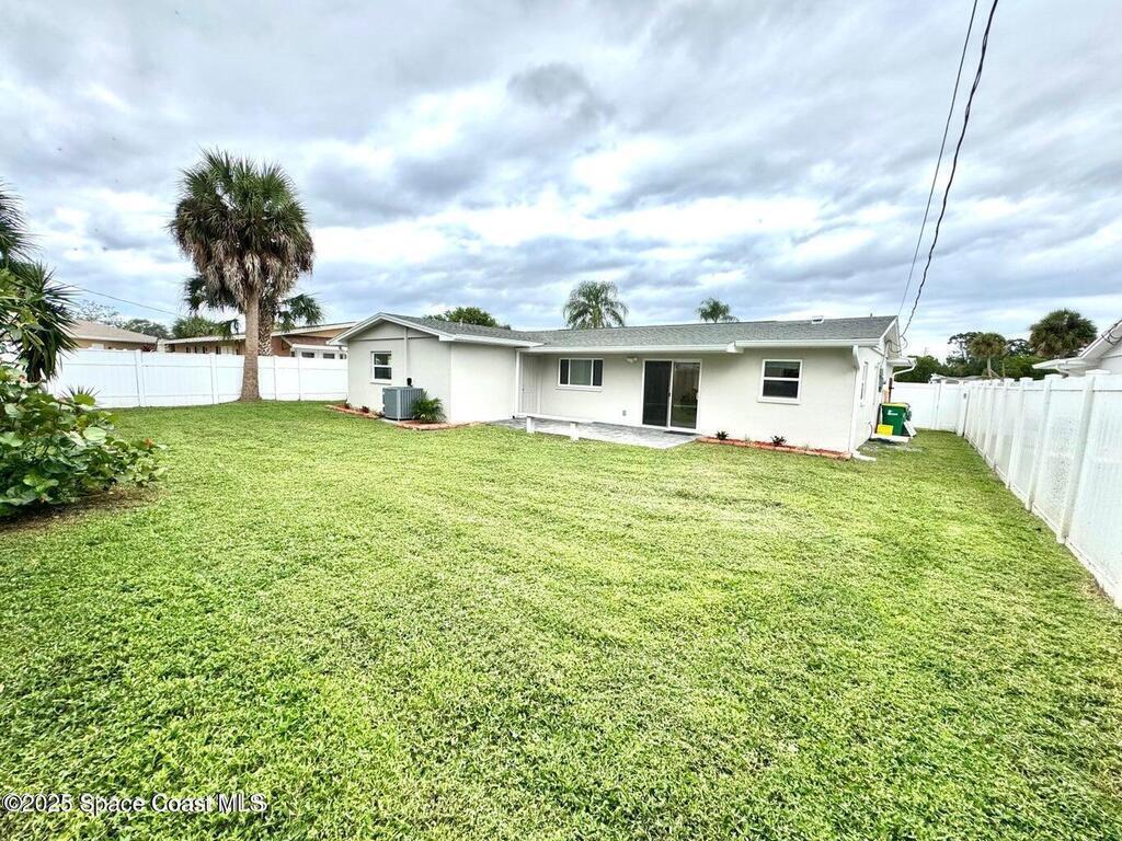 Fully renovated 3BR/2BA rental in Melbourne, FL. Bright open living and dining areas with updated LED lighting throughout. Kitchen features white Shaker cabinetry, Carrara marble countertops, and stainless steel appliances. Primary bedroom is privately located at the rear of the home with patio access and views of the fully fenced backyard. Ensuite bath includes a tiled walk-in shower with subway tile and modern vanity. Two additional bedrooms share a full bath with tub/shower combo. Additional features include newer A/C and water heater, full-size stackable washer and dryer, brand-new rain gutters, one-car garage, and fenced yard. Impeccably clean, move-in ready, and conveniently located near shopping and dining.