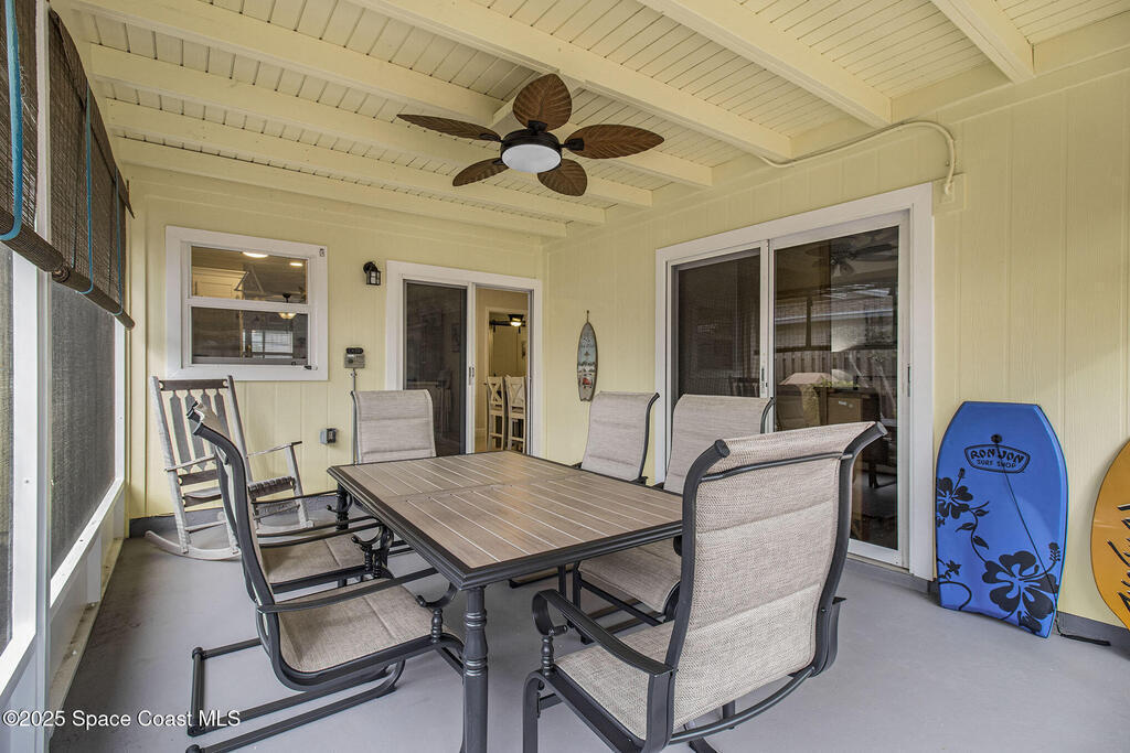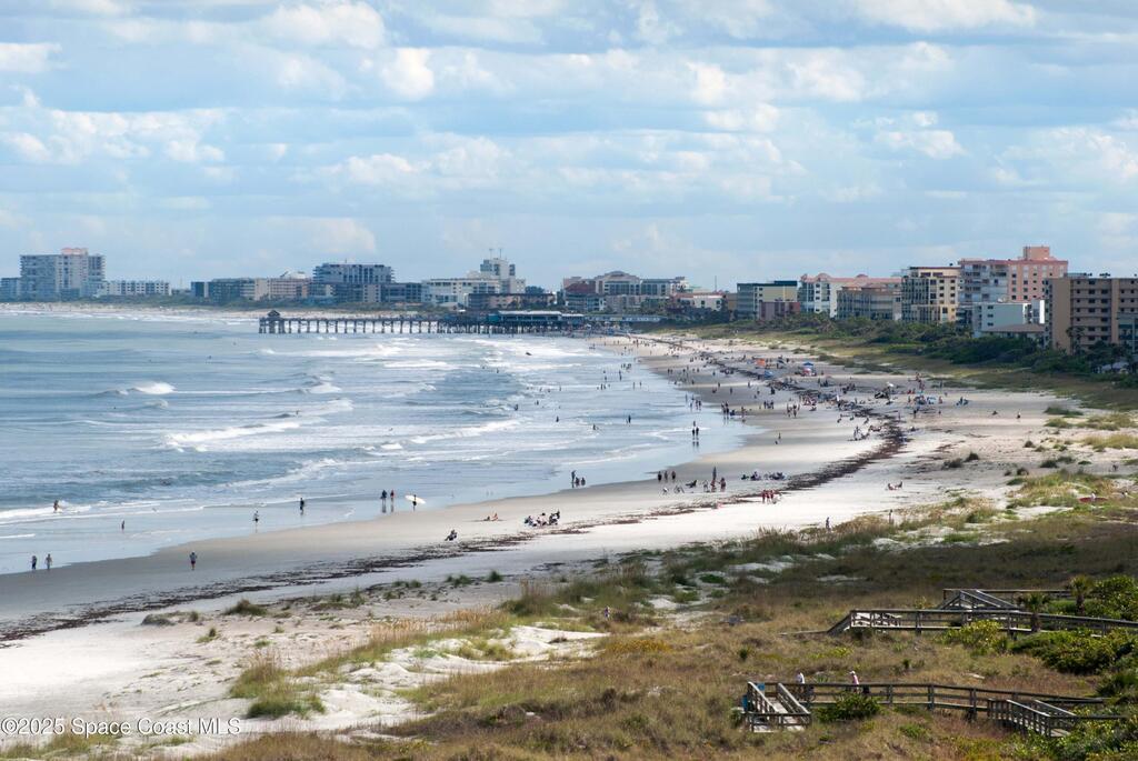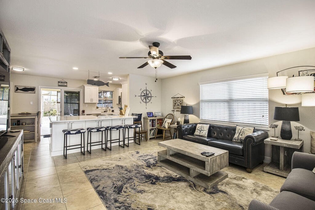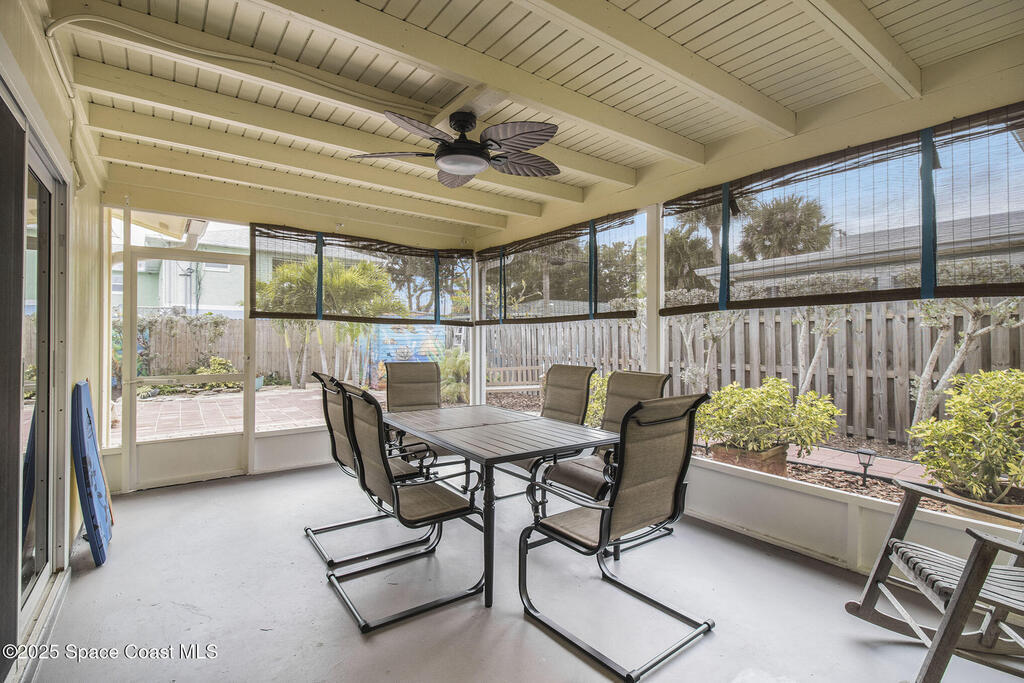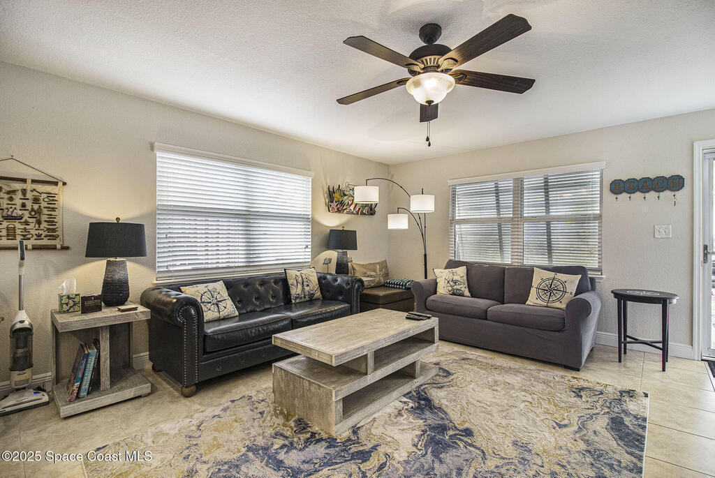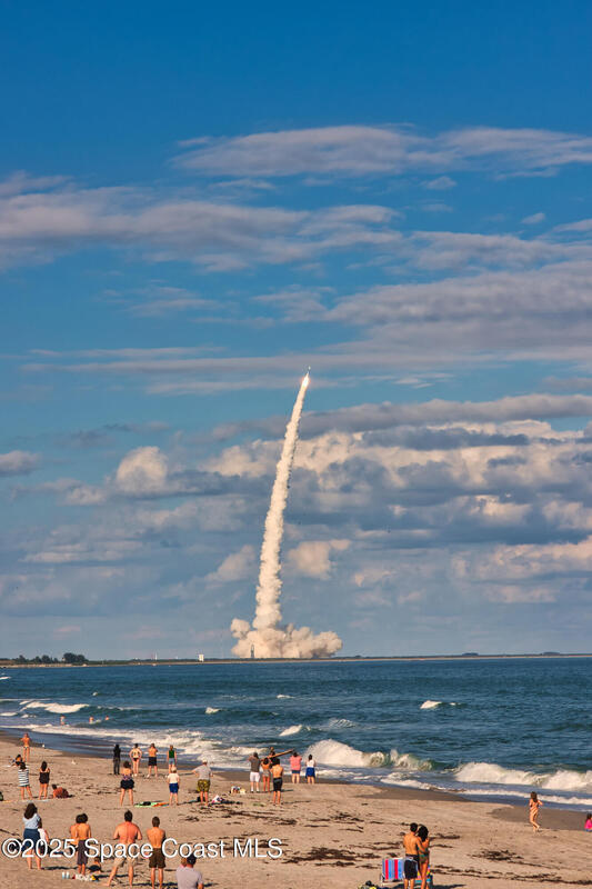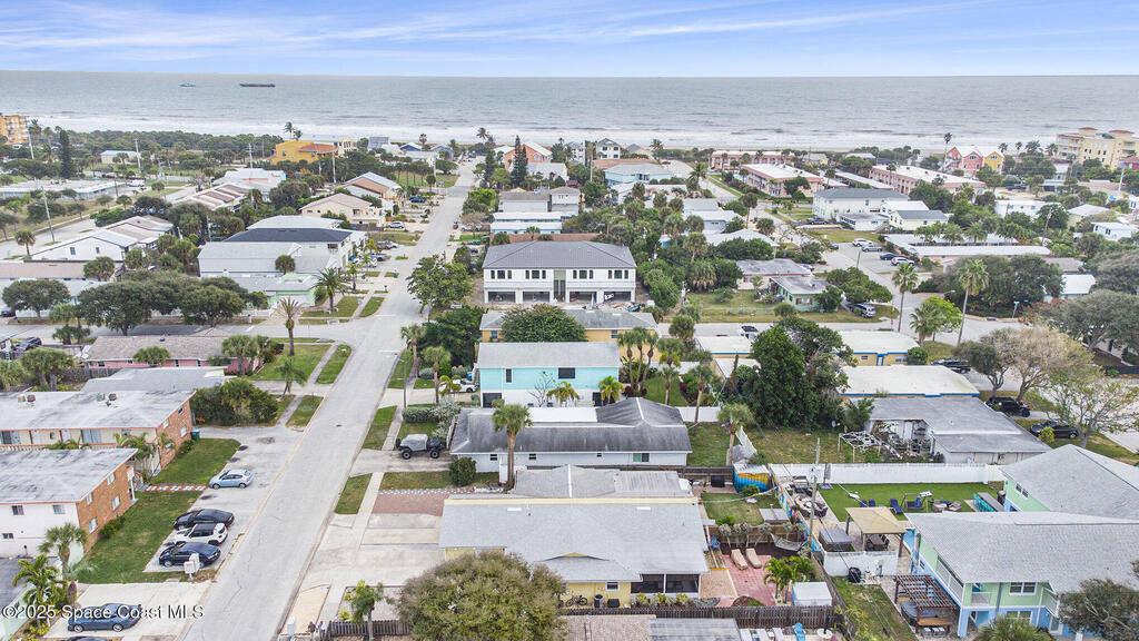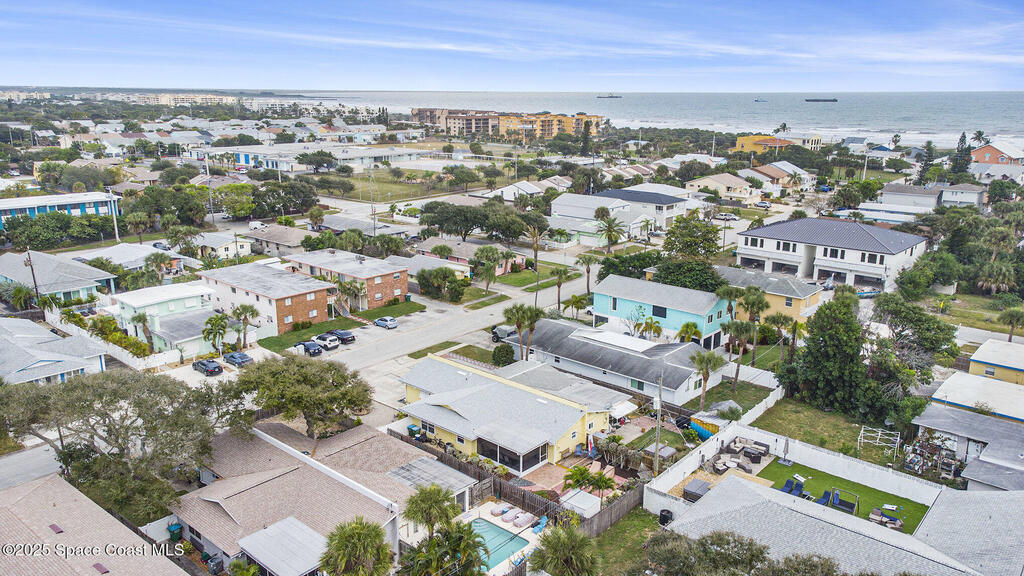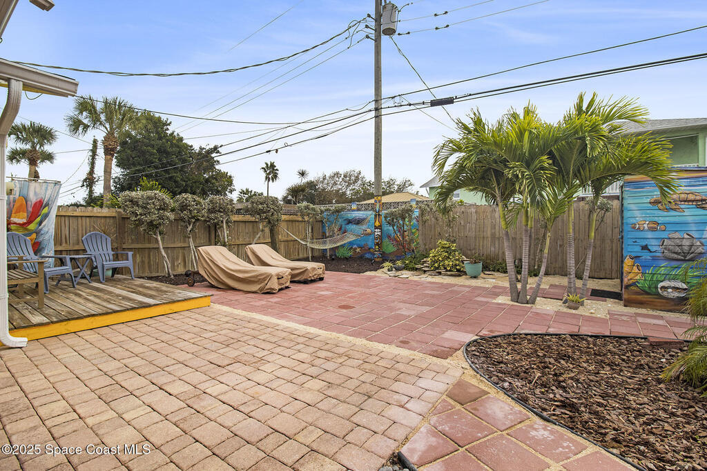 Offered is an adorable 2/2 half duplex with a garage just 2 blocks from the beach! This property is ideal for a short-term rental or your permanent residence. The house has been completely remodeled with shaker style cabinets in the kitchen, bathroom vanities, quartz counter tops, stainless appliances, recessed lighting and a fresh coat of paint, inside and out. The roof and outside a/c were replaced in 2024, circuit panel in 2025. Enjoy the comfort of having impact windows and sliders. The large patio leads to a nicely landscaped back yard accented by local muralist Rick Shores. The seller is offering a $ 5,000 credit towards a hot tub or closing costs. The house is being sold completely furnished and is move-in ready. Additional bedding, supplies and owners cabinets are in place. There is no HOA to be concerned with. Rocket launches can be viewed from the front and back yard or take a quick stroll to the beach. Ask your Realtor(r) to show you this cute beach house today!!