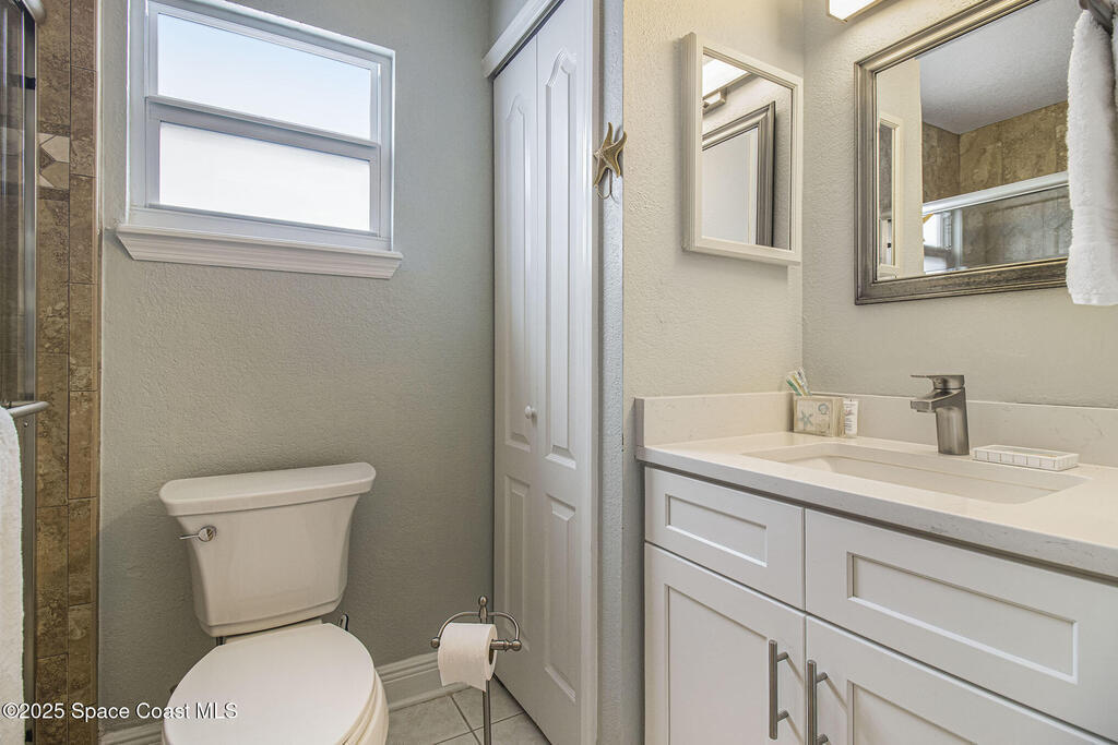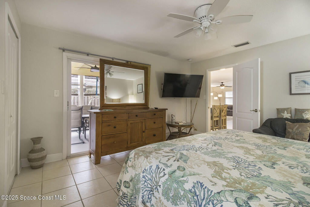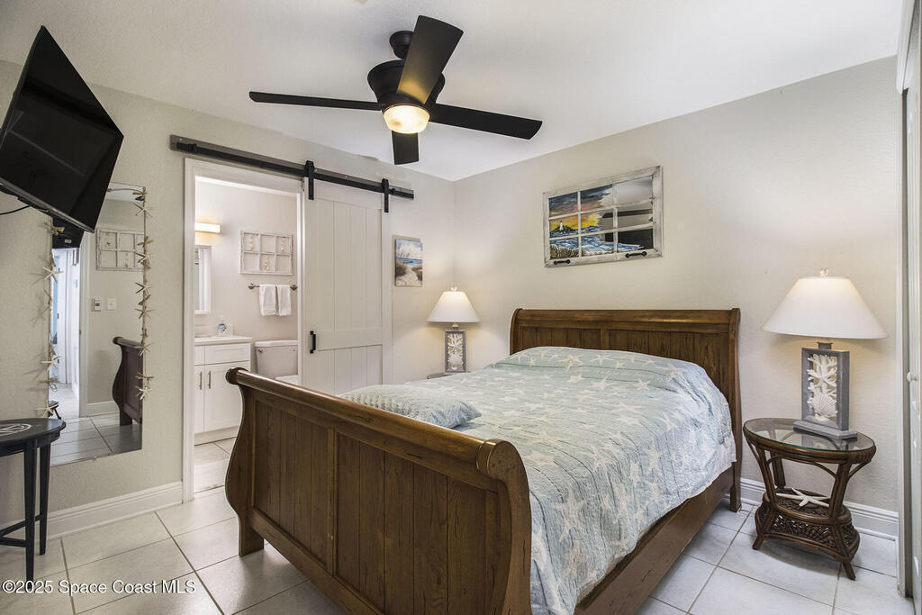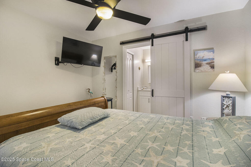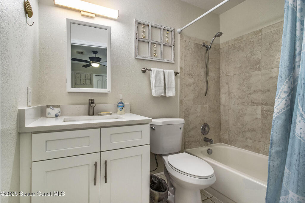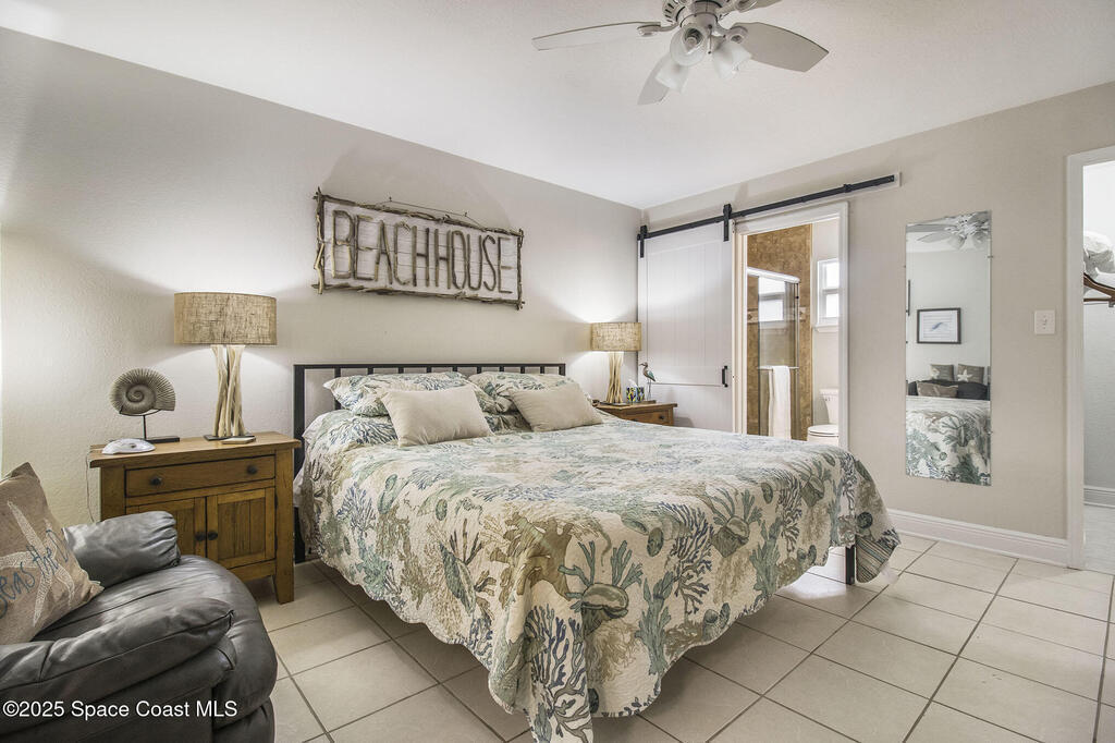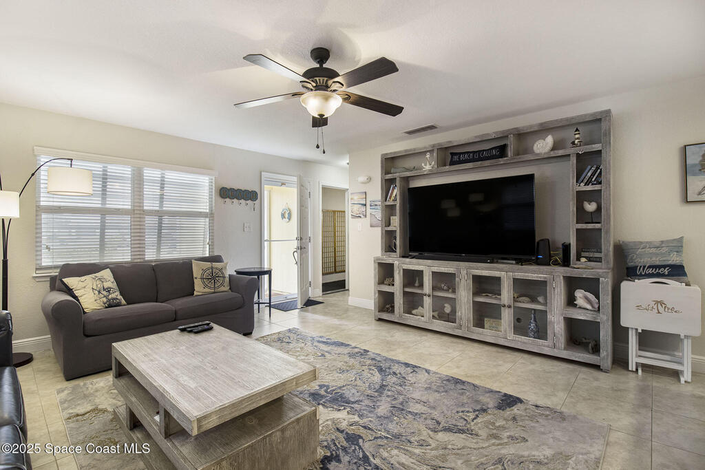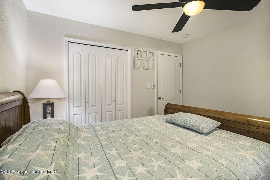 Offered is an adorable 2/2 half duplex with a garage just 2 blocks from the beach! This property is ideal for a short-term rental or your permanent residence. The house has been completely remodeled with shaker style cabinets in the kitchen, bathroom vanities, quartz counter tops, stainless appliances, recessed lighting and a fresh coat of paint, inside and out. The roof and outside a/c were replaced in 2024, circuit panel in 2025. Enjoy the comfort of having impact windows and sliders. The large patio leads to a nicely landscaped back yard accented by local muralist Rick Shores. The seller is offering a $ 5,000 credit towards a hot tub or closing costs. The house is being sold completely furnished and is move-in ready. Additional bedding, supplies and owners cabinets are in place. There is no HOA to be concerned with. Rocket launches can be viewed from the front and back yard or take a quick stroll to the beach. Ask your Realtor(r) to show you this cute beach house today!!