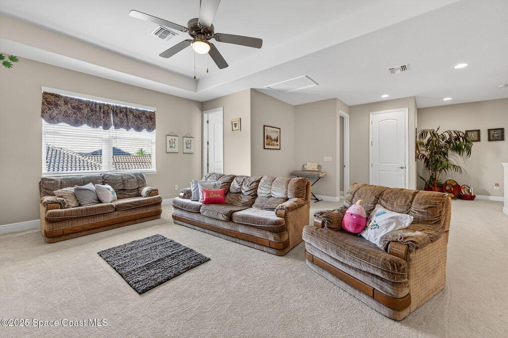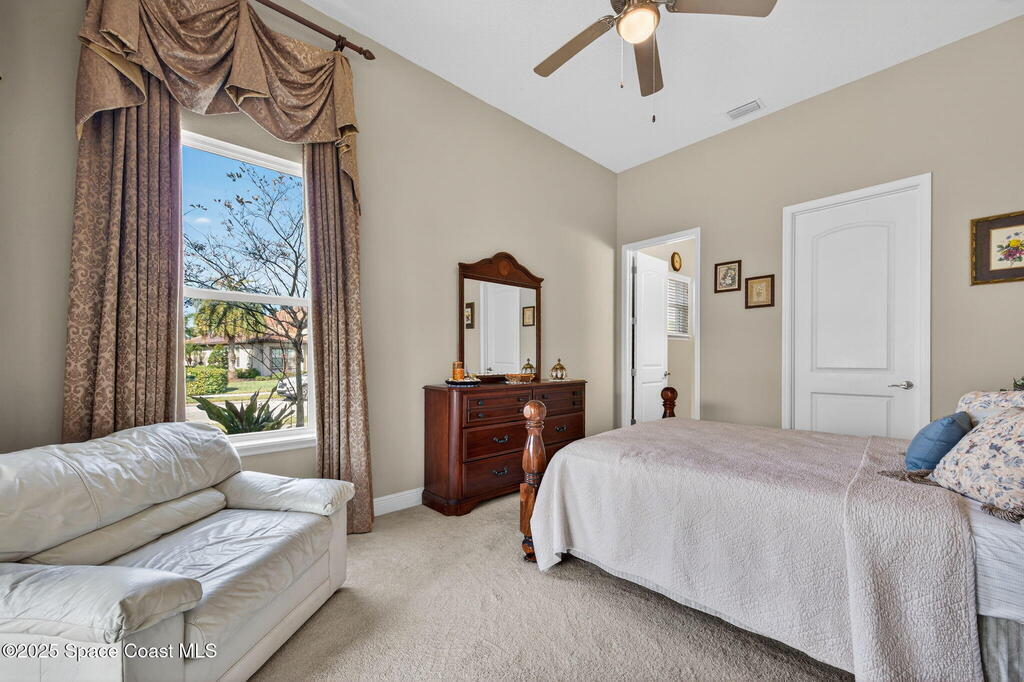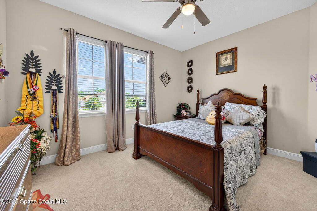 Custom built home in Viera in Gated Community - 4 Bedrooms, 5.5 Baths. Welcome to this beautifully appointed residence offering 4 spacious bedrooms, each with its own private bath, ideal for comfort and privacy. The home features a chef's kitchen with granite countertops, breakfast bar, and cozy eating nook, flowing seamlessly into the living, dining, & family room- perfect for entertaining & everyday living. Bonus room upstairs. Situated on a large third-acre corner lot, w/ outdoor kitchen, screened porch, and room for a pool, making it an entertainer's dream. The first-floor bedroom with full bath and private screened patio is perfect for multi-generational living or guests.Elegant details include tray ceilings, crown molding, and brand-new carpet throughout. Homes is block construction on first & second floor.Enjoy the lifestyle of Fairway Lakes where you can take your golf cart directly to Duran Golf Course, stroll to The Avenues , and benefit from the best Viera sch
