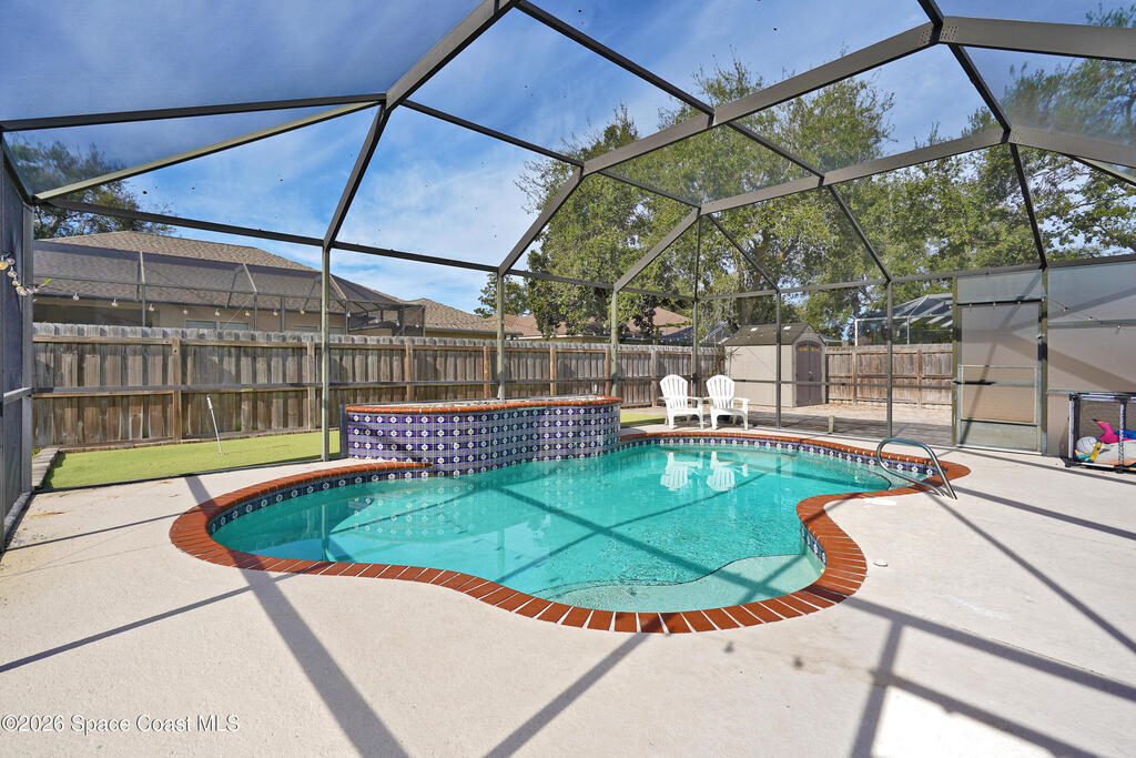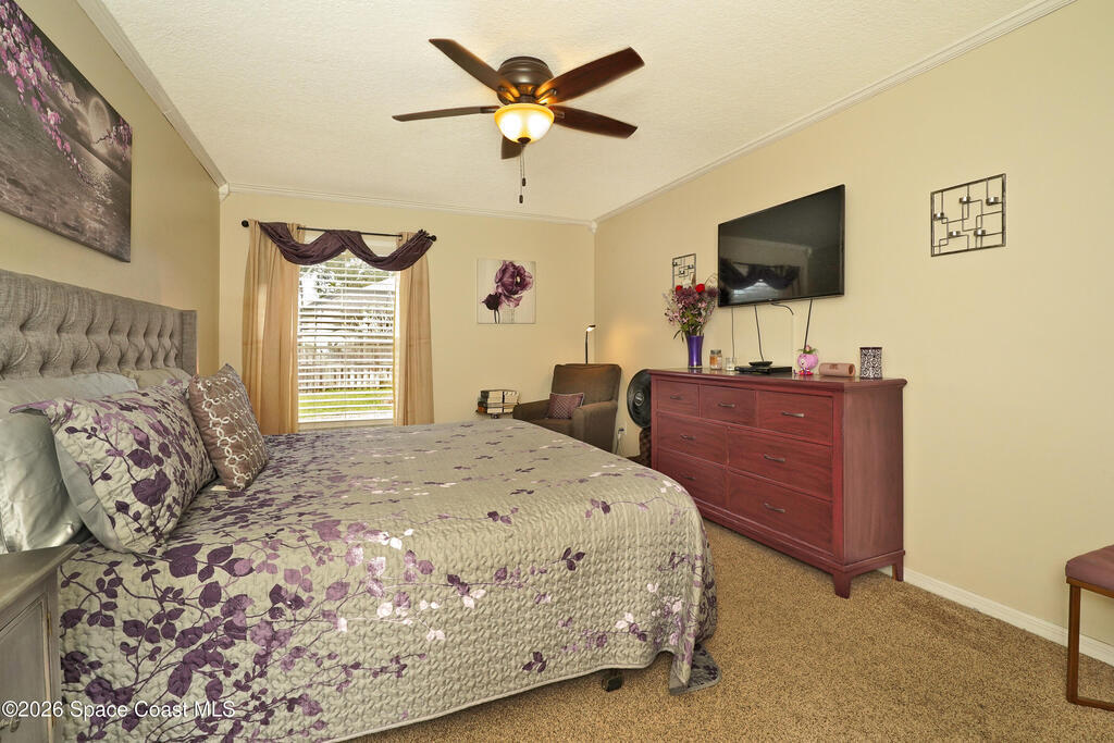 This beautiful corner lot, 2,236 sq. ft. open plan home has 4 or 5 bedrooms , 2 baths, and a bright office (5th bedroom) area next to the kitchen, dining room, large family room with views of the enclosed pool deck and patio. There are ceiling fans in every room and the kitchen has stainless appliances including refrigerator, gas stove, lots of cabinet space, a roomy pantry, an island with sink and dishwasher overlooking the family room and has French doors leading to the patio and pool area. The large master bedroom with a large walk-in closet, and a grand bathroom with a double sink vanity, a step-up tub, and a separate glass brick shower. The 2-car garage has storm shutters for the whole house and water treatment equipment. Brand new AC This friendly Windsor Estates neighborhood has a recreation area with a tennis court, basketball court and kids playground gym, is near shopping, churches, schools, parks and restaurants, and is 50 miles from Orlando and 5 miles to the ocean beaches