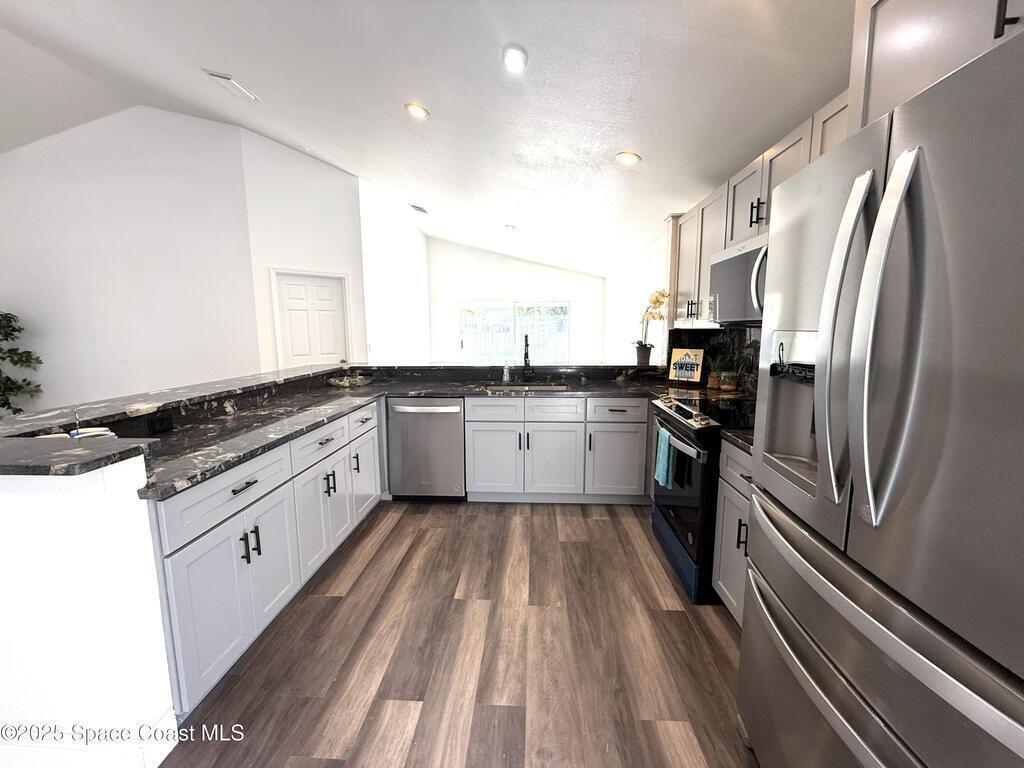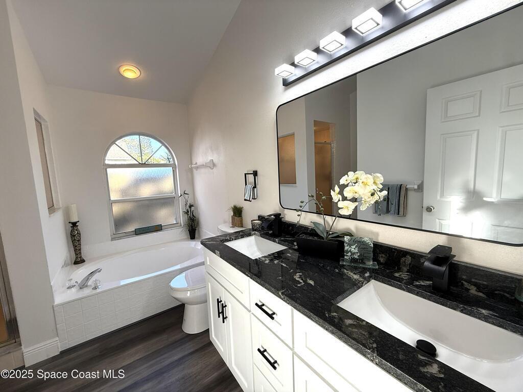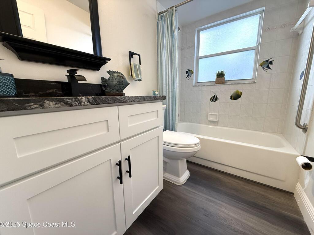 Stunning 3BR/2BA/2 Car garage in a serene location at Pebble creek.This home is updated throughout w/luxurious updates that you will love.Open floor plan w/high ceilings & large living areas boast a comfortable & inviting atmosphere.New vinyl plank flooring throughout adds a modern fresh look.All New fully equipped kitchen w/sleek soft-close cabinetry,elegant high grade granite tops,& S.S. appliances create an impressive & functional cooking space.Two breakfast bars.Primary bedroom & bath offer a spacious layout w/soaking tub, enclosed walk-in shower,new double vanity w/granite tops,new faucets,mirror & lighting.Two guest bedrooms & Updated guest bath w/new vanity. Family room slider leads to a screened-in enclosure, perfect for fun gatherings or unwind overlooking the canal. Two car Garage .Freshly painted interior & exterior. Excellent location, just mins to Patrick Space Force,great shopping,schools, parks,fine restaurants & the beach.Easy access to major roadways & airports.