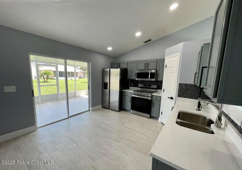 Beautiful Turn Key home in the highly desirable Sandy Pines Neighborhood! Stunning Recent Remodel-All Plank ceramic tile,Quartz Counters,Appliances,all plumbing fixtures,light fixtures,doors & trim,door handles,blackout drapes, ring doorbell, paint inside & out! Hurricane Windows !! Open Floor Plan ! MOVE IN READY !Spacious eat in Kitchen with Stainless Steel Appliances & smart oven with air fry. Vaulted ceilings with designer fans in every room. Spacious great room, 2 car finished garage. This Gated community offers a community pool that is conveniently located just around the corner & secure RV/boat storage is available. Ideally situated near historic downtown Melbourne, Harris, tons of dining, beautiful beaches, FIT, Turkey Creek Sanctuary with boating, biking, & scenic nature trails. Low HOA fee. Screens across Garage door. Save on insurance! City Water & Sewer! Excellent location, near shopping, great restaurants, I-95, Orlando theme parks, Cape Canaveral & Port Canaveral.