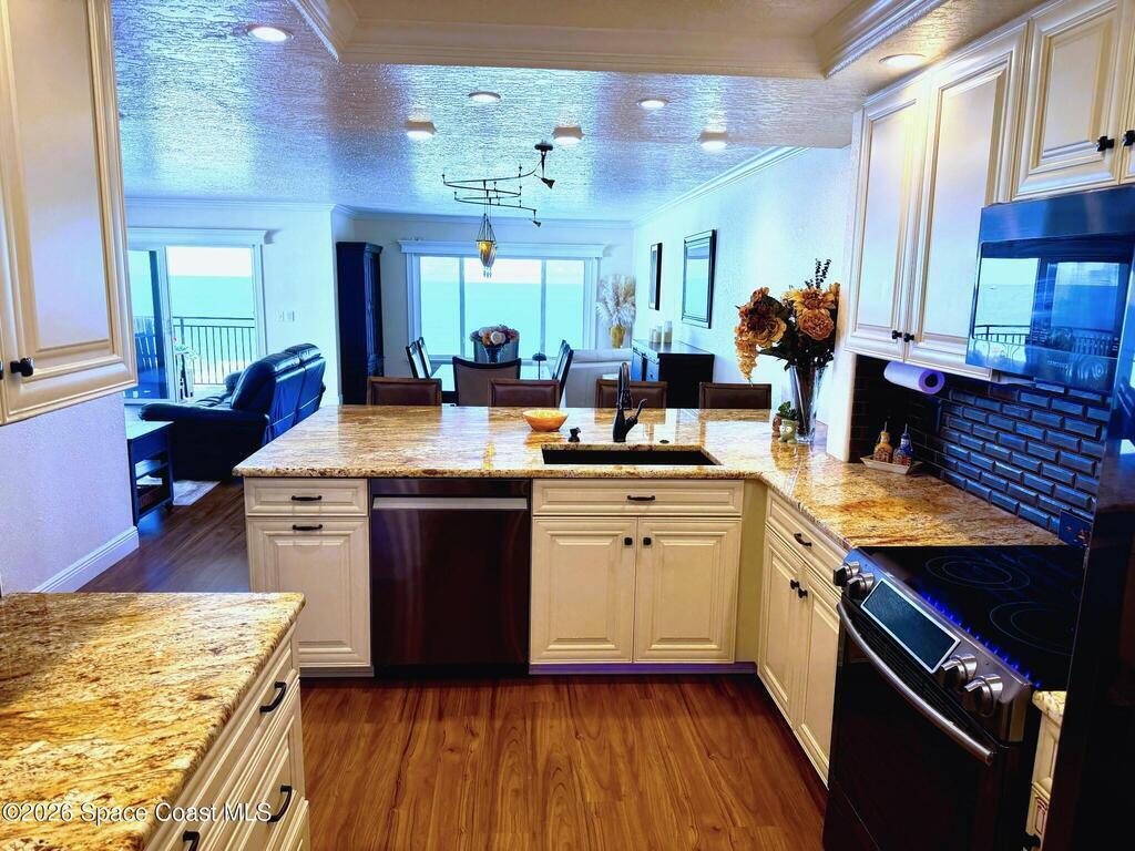 OCEANFRONT 3BR/2BA NE CORNER UNIT ON 7th FLOOR w RARE 2 CAR GARAGE. Panoramic Atlantic views from kitchen, living, dining, primary, and guest bedroom. Completely renovated with luxury vinyl plank flooring, high-end granite countertops, custom wood cabinetry, granite sink, custom lighting, and motorized voice-activated blinds. The primary bath has a walk-in shower, guest bath has a jet tub. 3rd bedroom is Full Murphy Bed/Office for remote work and guests. Hurricane-rated windows, slider, and shutters. Crown molding throughout, in-unit laundry, Coastal AC Unit, and 2025 tankless water heater. Direct beach access, heated oceanfront pool, fire pit, grill, and clubhouse with full kitchen/dining room. Enjoy sunrises, rocket launches, and ocean breezes from the private balcony. Walk to downtown Cocoa Beach. Fully funded reserves, SIRS compliant, concrete restoration TBC 2026. Furnishings negotiable. Move-in ready for living or investment. Direct sale opportunity w owner.
