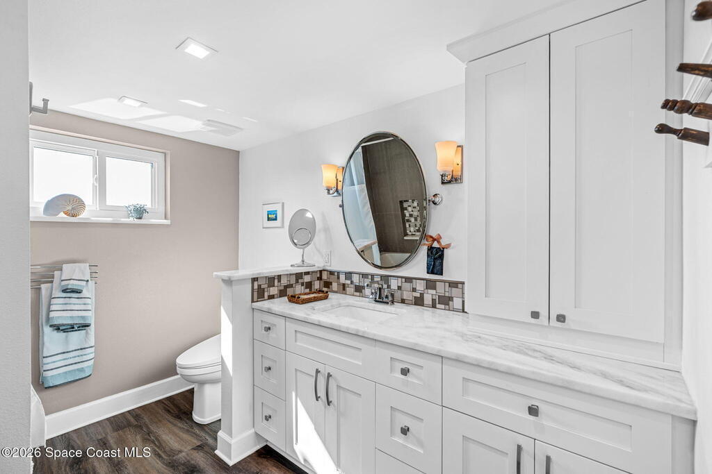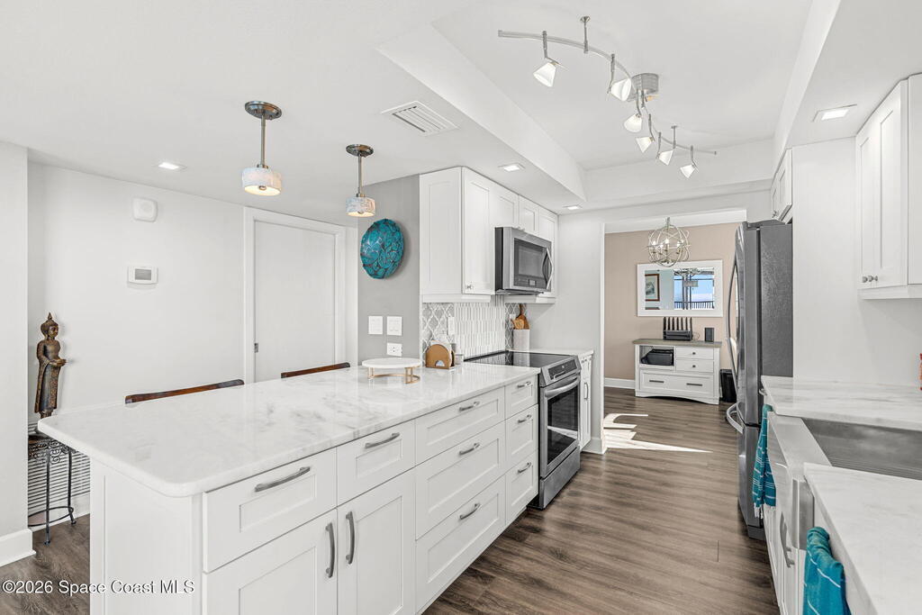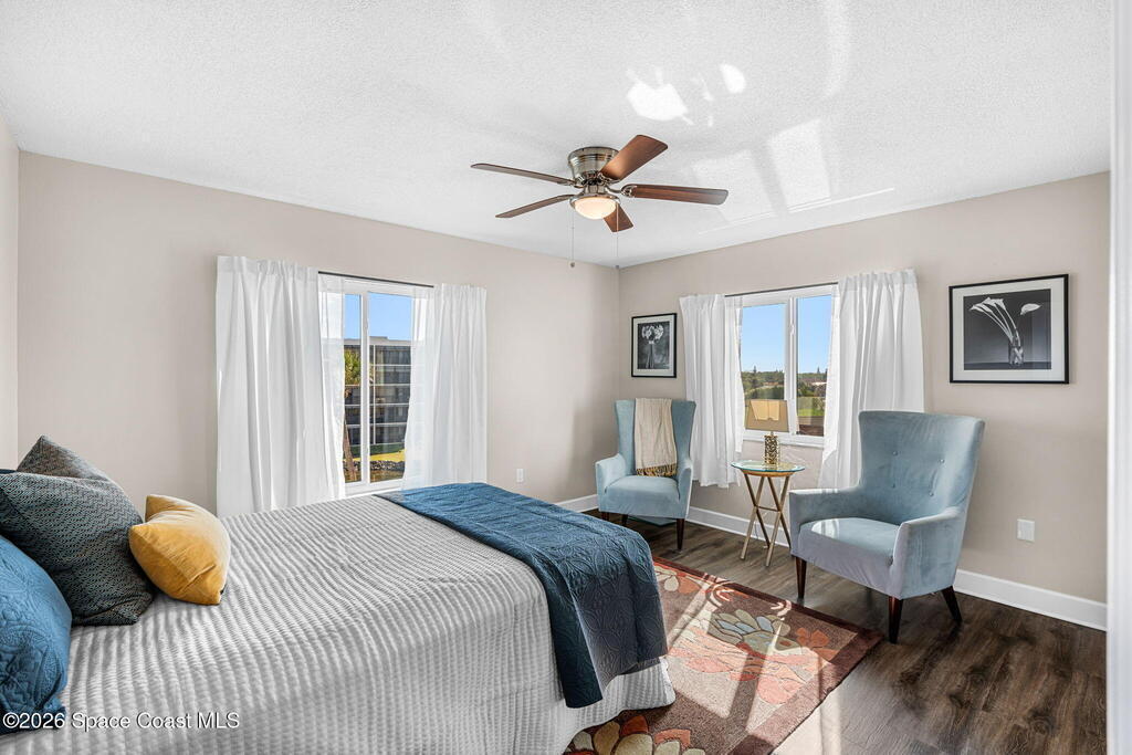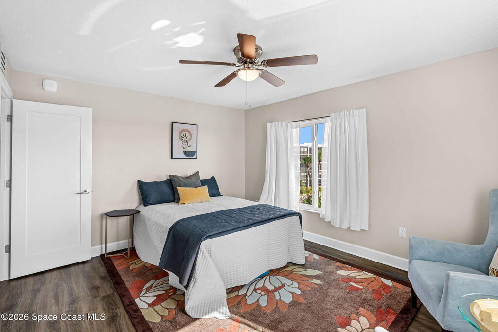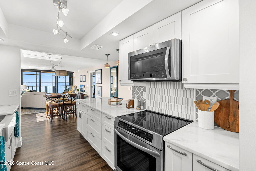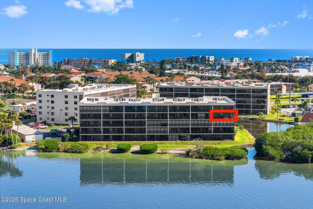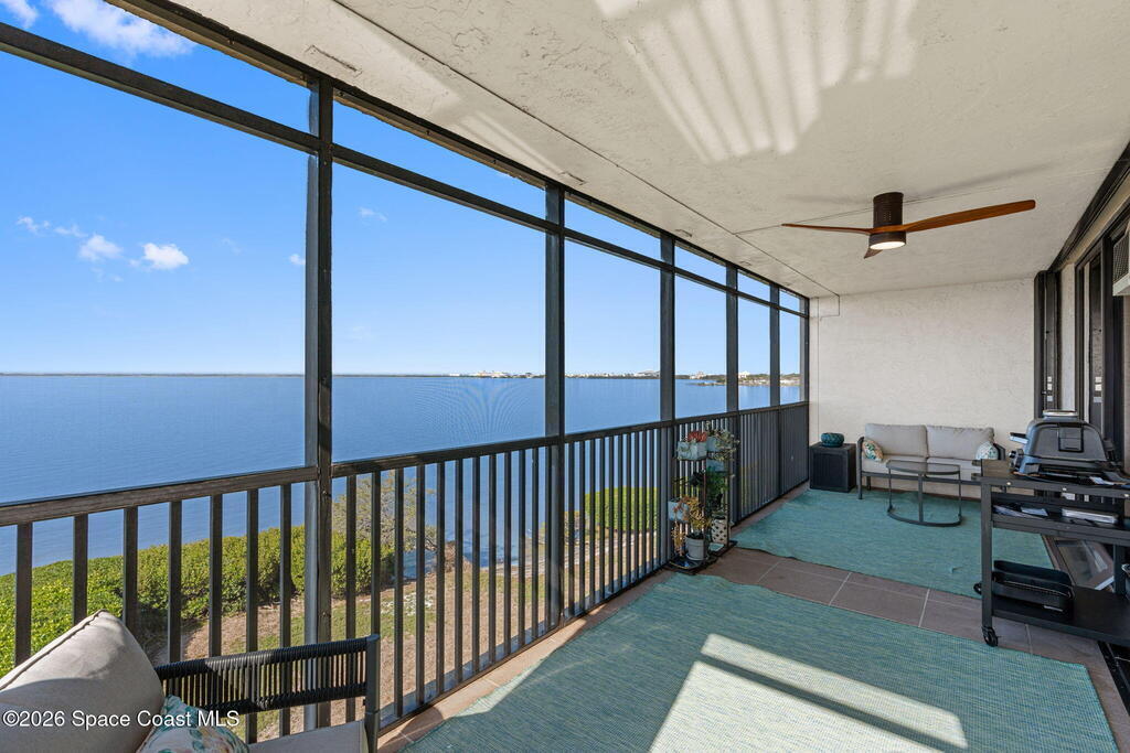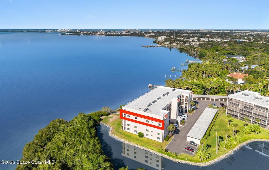 This move-in ready, fully renovated end-unit condo boasts breathtaking 180 degree water views, including direct views of the Banana River from the large screened balcony, making the property feel like a private retreat! Savor spectacular sunsets while watching dolphins and manatees glide through the adjoining canal to the community's private lagoon. Modern interiors feature a gourmet kitchen with quartzite countertops and stainless steel appliances, wine/coffee bar, luxurious updated bathrooms, large walk-in primary closet, and cohesive luxury vinyl flooring throughout. Enjoy hurricane impact windows, new sliding glass doors, and in-unit laundry for ultimate comfort and peace of mind. This prime location offers walking distance to pristine beaches, local restaurants, and shopping. Set sail from vibrant Port Canaveral, only a few minute drive away. The community offers two pools (one heated), tennis/pickleball courts, clubhouse, kayak storage, dock with river access, and much more!
