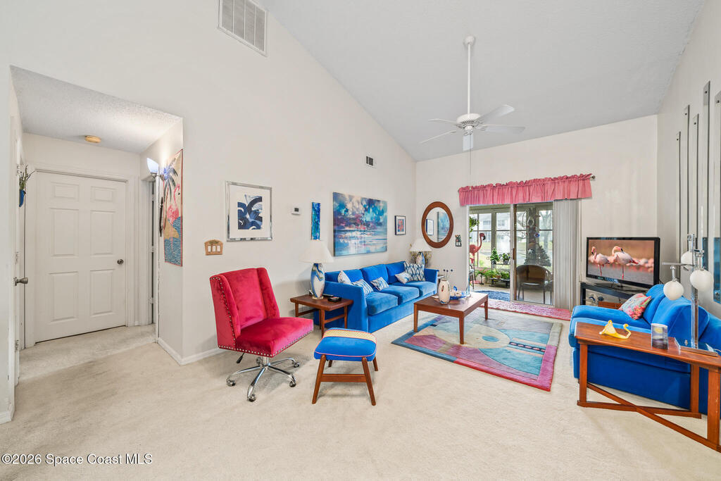 One-story living with no neighbors above! Welcome to this Lakeview, single-story condo featuring a private entry. Newer AC replaced 2/2024. The tiled foyer welcomes you in with soaring vaulted ceilings and serene water views throughout much of the home. The eat-in kitchen offers Corian countertops, plantation shutters, and a convenient breakfast bar. The spacious owner's suite includes access to a tiled, enclosed porch. Relax and enjoy Florida's natural wildlife from the Florida room overlooking the lake in the backyard. The second bedroom is generously sized and has a guest bath. Washer and dryer are included in the unit. Monthly fee covers internet, and TV cable. This is truly a must-see!