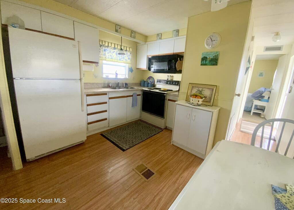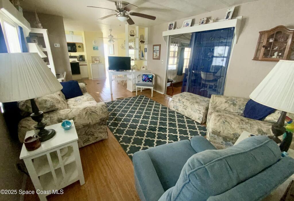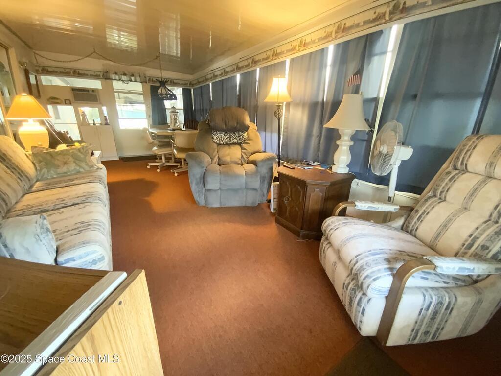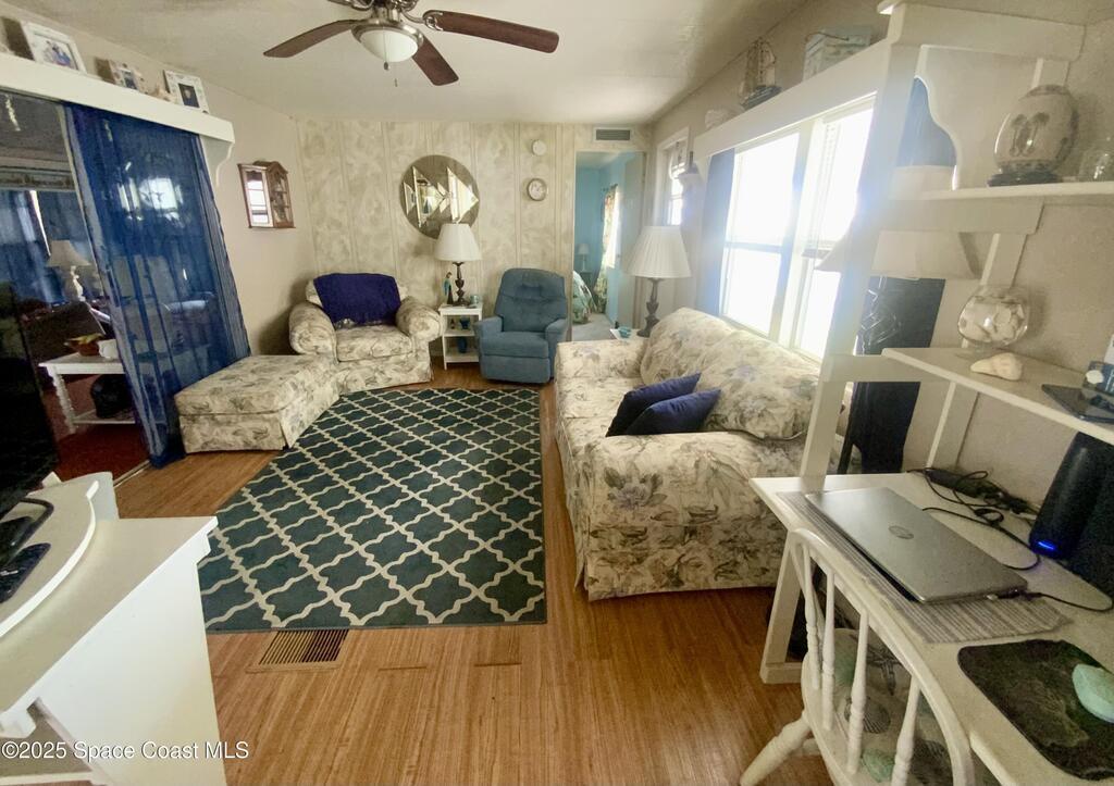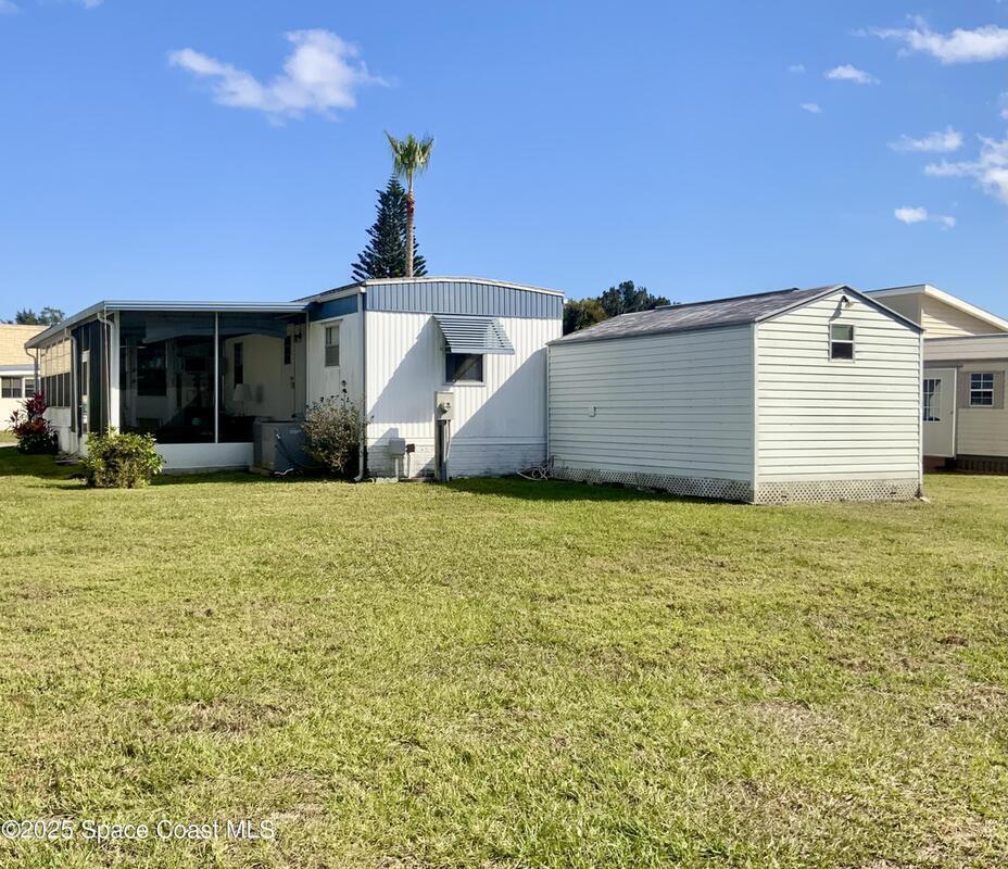 ROOM TO ROAM IN THIS 2BD/2BA FURNISHED HOLIDAY PARK HOME! NO LOT RENT! LAND IS OWNED. Not just a basic singlewide; instead this home has extra room for some personal space too! There is a semi-private screened porch, perhaps a good spot for having morning devotions or quiet conversation, there is a Florida Rm for overnite guests or for doing puzzles & crafts, or watching TV. And, there are 2 sheds; the larger one for tools & workshop. Inside has a split-Bdrm design w/ a bdrm w/ its own bath in front & a bdrm & a bath in the back. NEW ELECTRICAL PANEL BOX in 2025 & UNDER HOME VAPOR BARRIER DONE IN 2025! Plus, there are no immediate backyard neighbors. Holiday Park is an active 55+ community where residents enjoy 2 swimming pools, billiards, bingo, dances, luncheons, corn hole & much more. Beaches are about 20 mins away. Shopping, medical, restaurants, banks, pharmacies, post office, & I-95 are within a mile. Lawn, cable tv & internet are included in yearly maintenance fee.