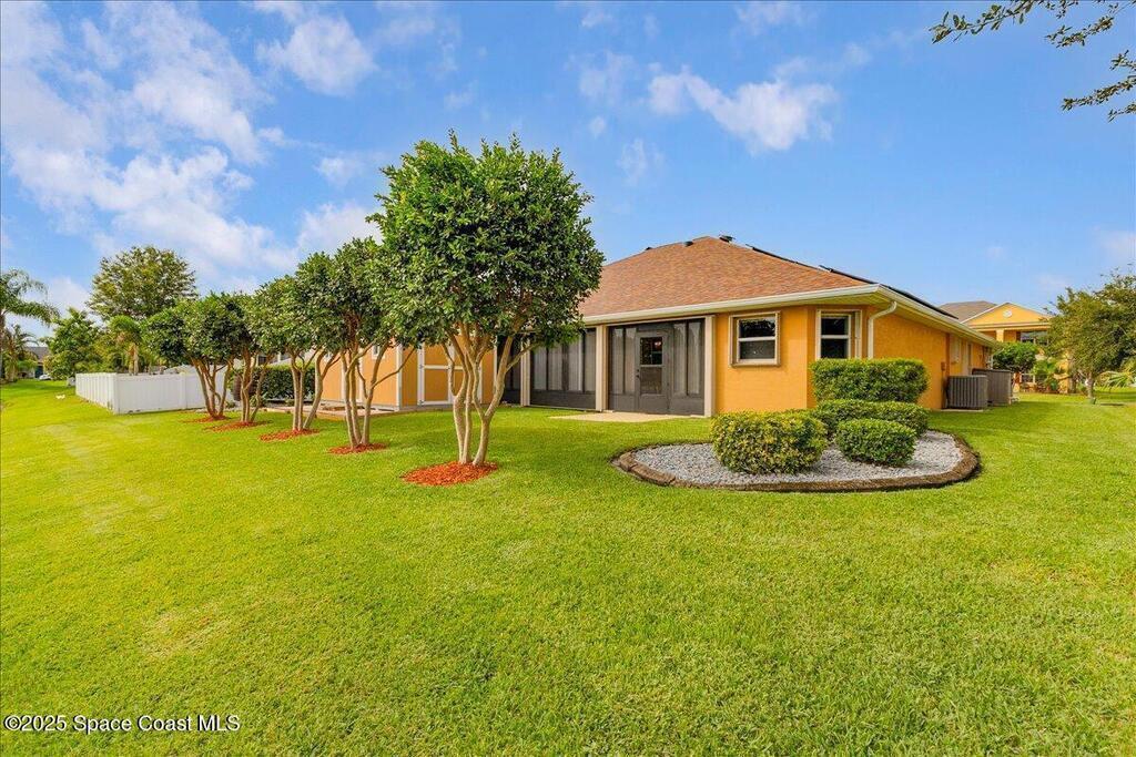 🚣 CONVENIENT & COMFORTABLE LAKEFRONT LIVING! 2023 Whole House Solar ($40/month electric bills)! Impeccably maintained CONCRETE BLOCK 4 BR, 2 BA. 📍Located in a sidewalk-safe, GATED COMMUNITY with playground, basketball courts and top-rated schools, this one-story West Melbourne home offers 2,489 SFL with soaring ceilings and spacious split bedroom floorplan. Flexible Florida Room can be cooled, heated, or opened as a screened lanai--perfect for entertaining or relaxing by the stocked lake with bass and tilapia. 🏡 Expansive primary bedroom features peaceful lake views and invigorating ensuite bath with walk-in closets, corner tub and separate shower. Whole House Generator hookup & Accordion Storm Shutters. ✅ ~*NEW AC. 2023 ROOF, Gutters/Downspouts, Hurricane-Rated Tuff Shed & Exterior Paint. Newer HWH & Whirlpool SS Appliances.*~ Energy-efficient & MOVE-IN READY --your LAKEFRONT DREAM HOME awaits! Seller will consider removing shed, if Buyer wishes.