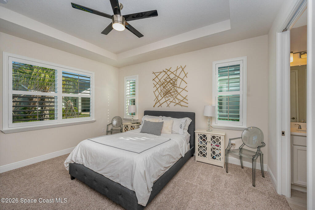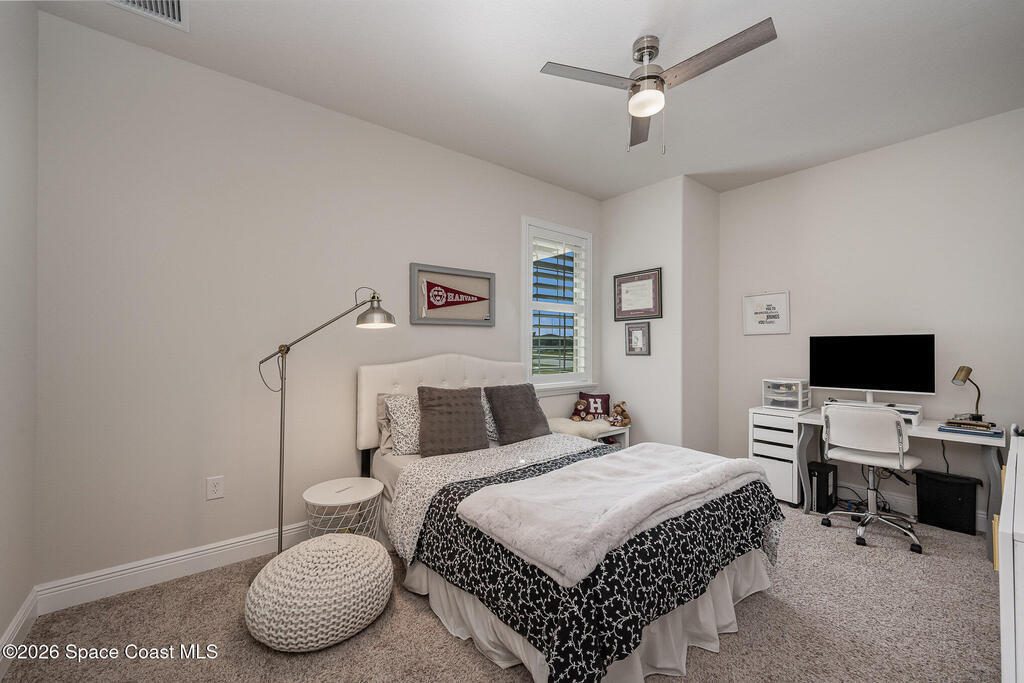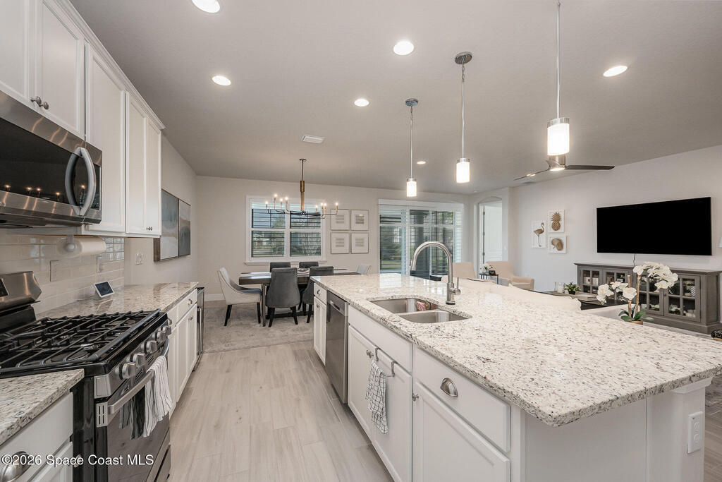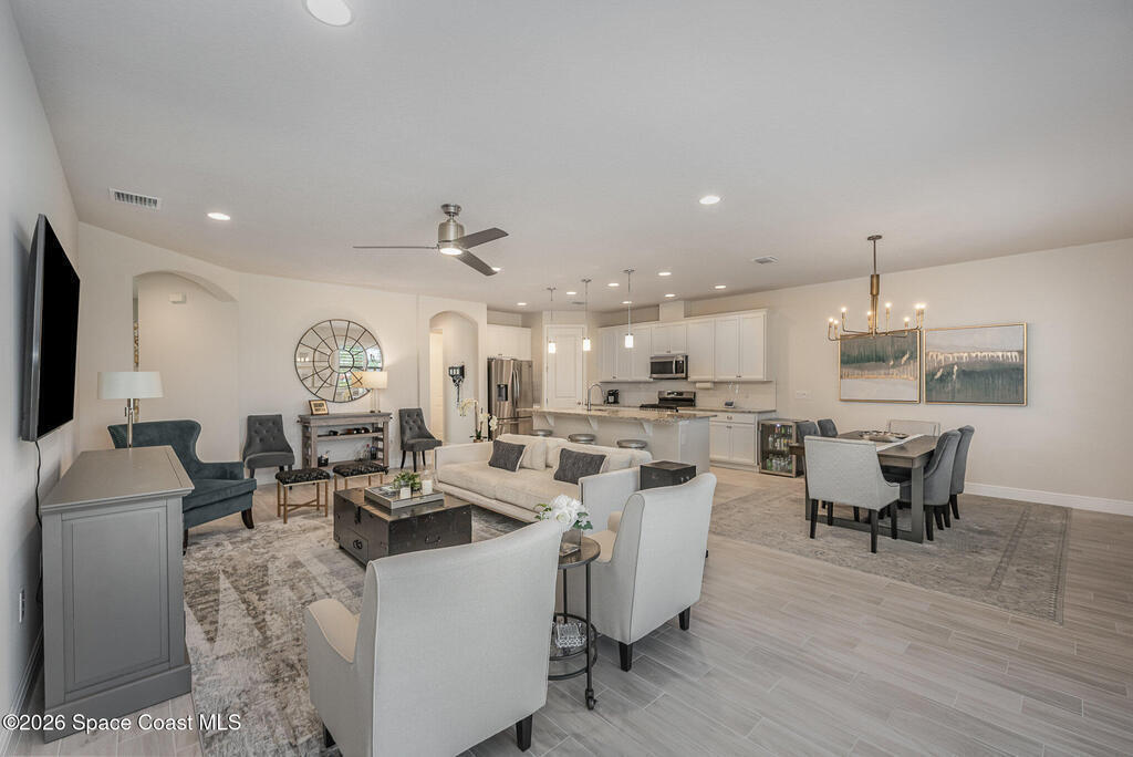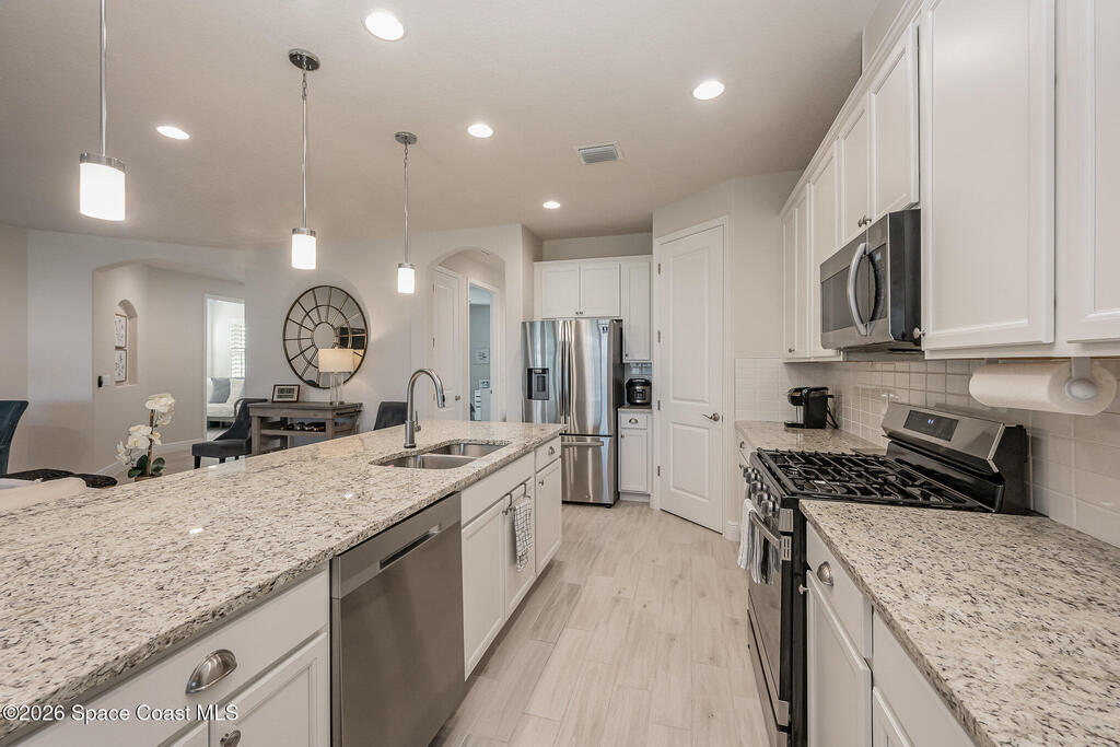 This modern, single-story 2-bedroom plus flex room residence, built in 2022, offers refined, maintenance-free living in Loren Cove. Bright, open spaces are thoughtfully designed for comfort, flexibility, and effortless everyday living.The open interior is anchored by a well-designed kitchen featuring granite countertops, stainless steel appliances, a natural gas range, and generous workspace ideal for both everyday living and entertaining. The living and dining areas flow seamlessly, creating a welcoming space that feels both stylish and relaxed.Two comfortable bedroom retreats with a clean, modern feel provide inviting spaces to unwind, while the flexible bonus room easily adapts to your needs, whether you envision a home office or den. Plank tile flooring enhances the living areas, complemented by plush carpeting in the bedrooms and ceiling fans throughout for year-round comfort. A washer and dryer are included making move-in simple and stress-free.