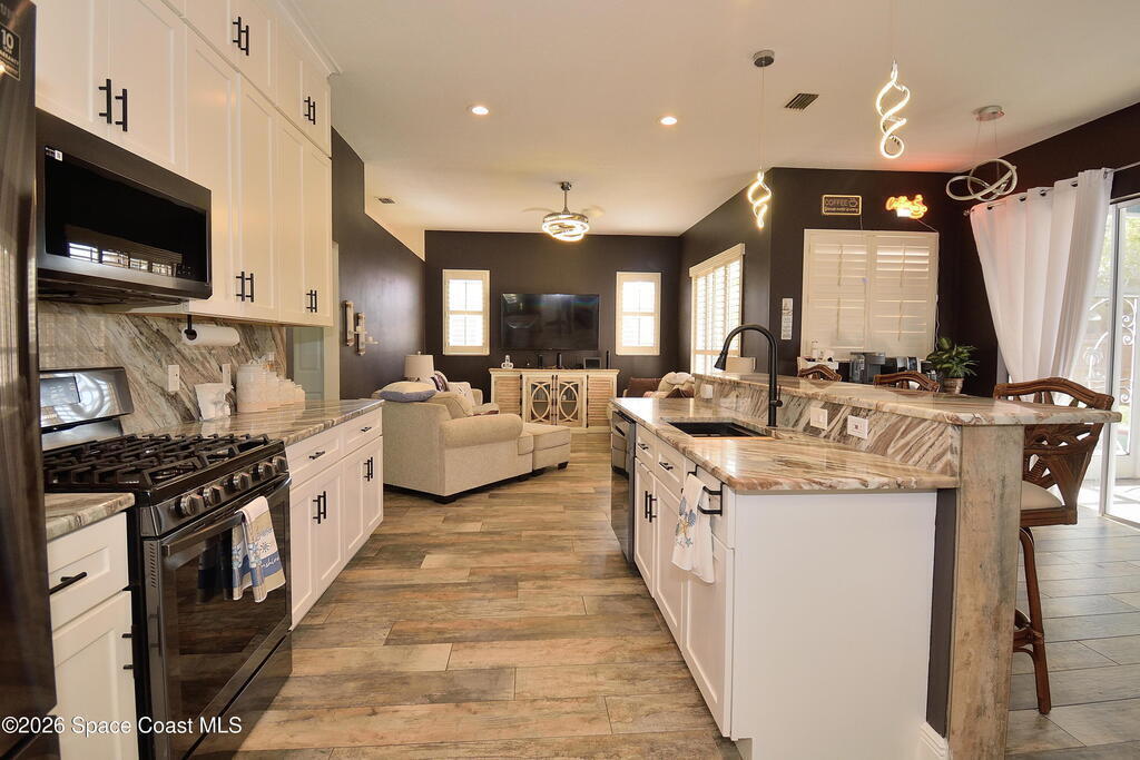 From the moment you step inside, the show-stopping kitchen sets the tone for this beautifully updated 3 bedroom, 2 bathroom home offering 1,779 square feet of well-designed living space. The kitchen has been completely transformed with floor-to-ceiling white cabinetry, abundant storage, and expansive stone countertops that flow seamlessly into a large center island with seating. A striking full-height stone backsplash, stainless steel appliances, and a gas range make this space as functional as it is visually impressive. Modern pendant lighting and recessed lighting highlight the clean lines and open layout, while tile flooring throughout the home adds durability and cohesion.The kitchen opens effortlessly to the family room and dining area, creating an ideal space for entertaining or everyday living. In addition to the open living areas, the home offers both a formal living room and a formal dining room, providing flexibility for gatherings, work-from-home needs, or