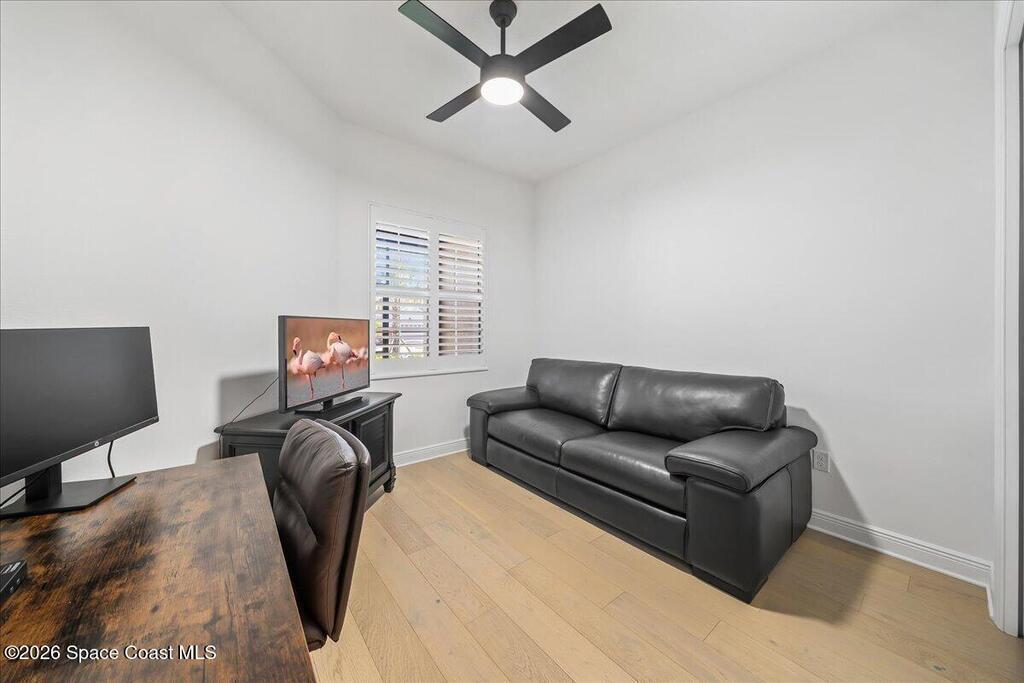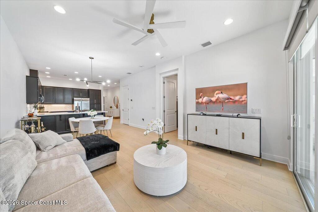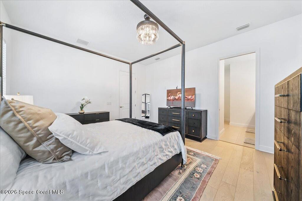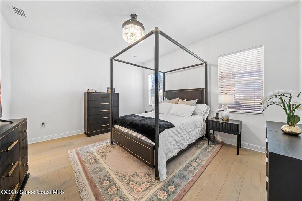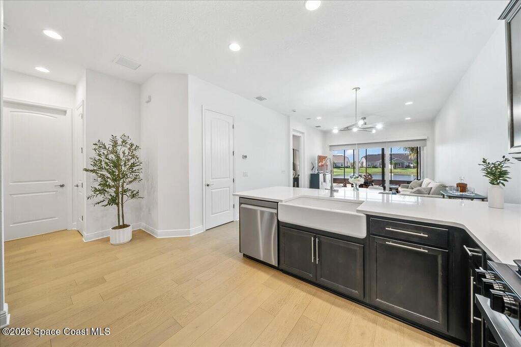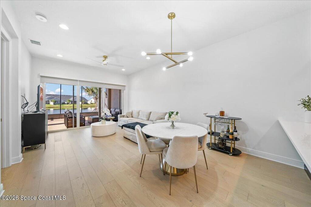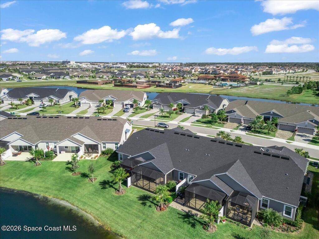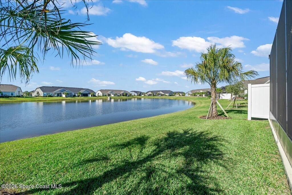 This Viera Home will make your 2026 even Happier! Welcome to Avalonia in Viera West, where this fully upgraded, waterfront Lindsey II villa, built in late 2024, delivers maintenance-free luxury living at its finest.Arrive to a modern coastal vibe, paver driveway, epoxy finished 2 car garage, screened front covered porch and a spacious open floor-plan that showcases, gorgeous neutral toned wood flooring throughout entire home, stunning gourmet kitchen with a gas range, quartz counters in kitchen & baths, large primary bedroom & upgraded bath w/frameless shower, impact-rated windows and doors, plantation shutters, stylish tall doors and baseboards help bring everything together. Smart home technology allows for climate & lighting adjustments remotely. Efficient and convenient tankless natural gas water heater, and an in-wall pest control system for true peace of mind. Enjoy breathtaking lakefront sunsets from your fully screened, extended patio--the perfect place to unwind.