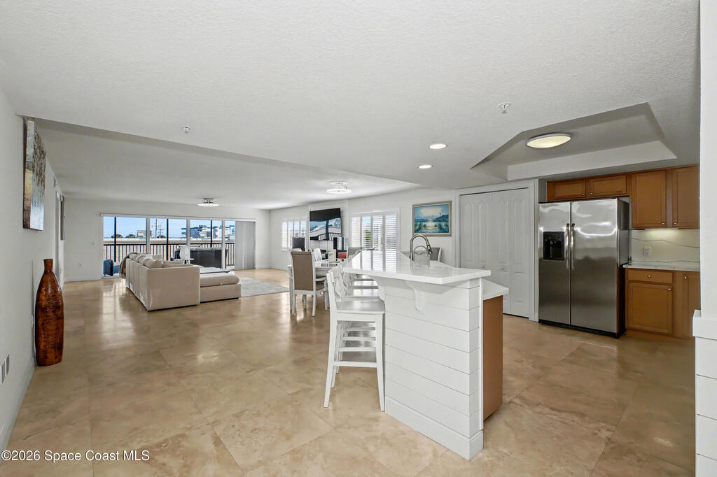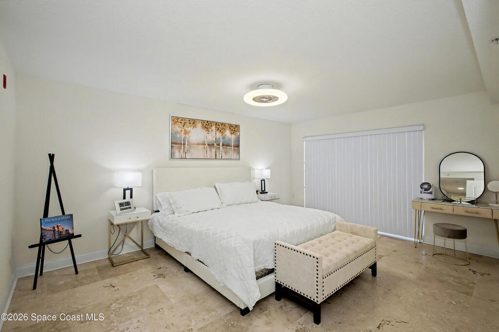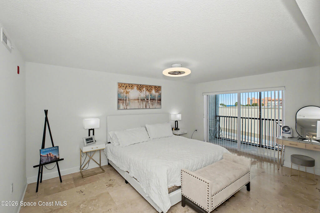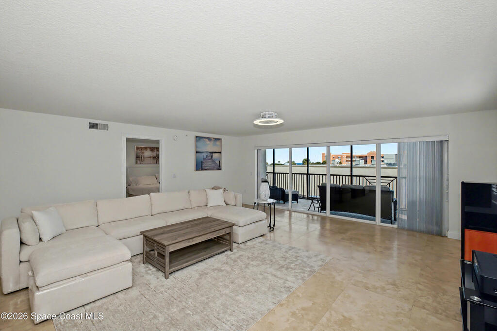 Coastal Living at its finest, Steps to the BEACH, PRIME LOCATION! Beautifully designed 3-bedroom 2-bath Desirable SE End unit condo lends over 2,000 sq ft of light-filled living space with travertine tile throughout. Partially Furnished The open-concept layout features modern fixtures ,and a gourmet kitchen with white quartz waterfall island, custom wood cabinetry, and SS appliances. Enjoy morning sunrises and ocean glimpses from the screened balcony, plus coastal breezes year-round. The split floor plan provides privacy, with a spacious primary suite featuring a spa-inspired bath and dual-head shower. Additional highlights include generous closet space, bike storage, and two assigned indoor garage spaces--rare for condo living. Palm Springs Condos offer resort-style amenities including pool, fitness center, clubhouse, tennis and pickleball courts. Steps to the beach and close to dining, shopping, and everyday conveniences--perfect as a primary residence or vacation retreat!