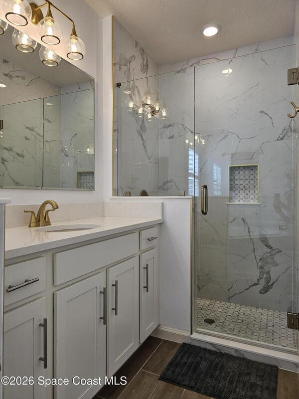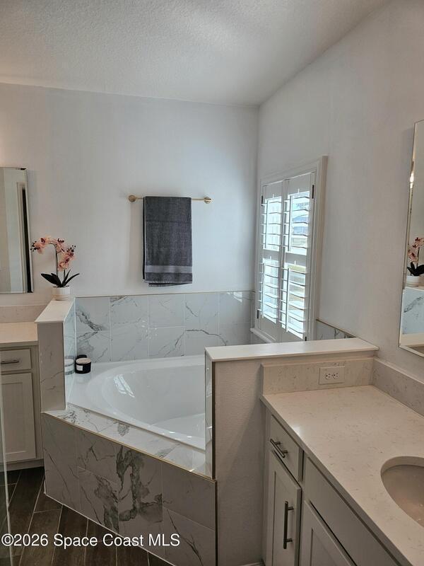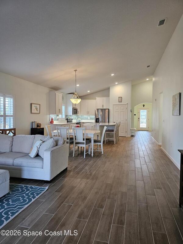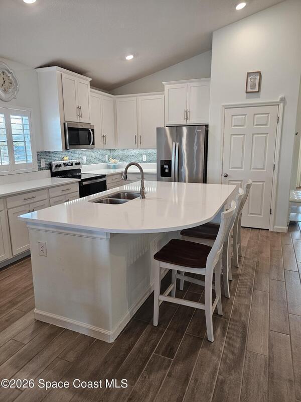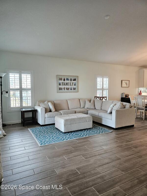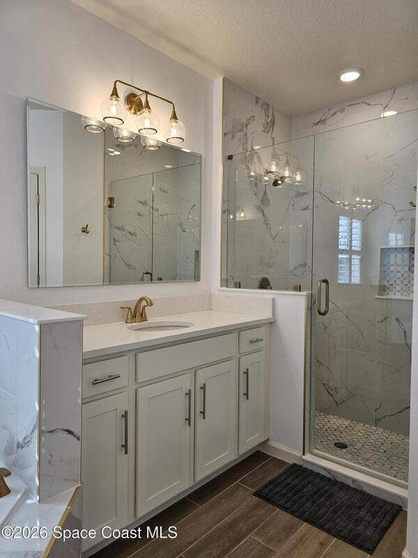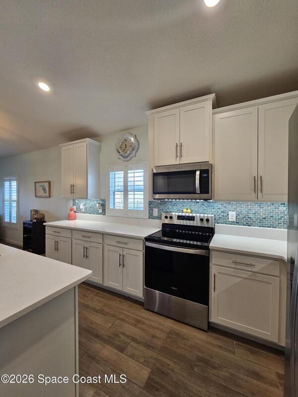72 Hour Kick Out in place. Solar panels/low electric bill. Immaculately maintained & modern flair. Versatile floor plan w/ 3 bedrooms + flex room, ideal as home office or 4th bedroom. Freshly painted interior, complemented by plantation shutters. Kitchen features white shaker cabinets, quartz countertops, a center island, glass tile backsplash, & a pantry w/ wood shelving & motion lighting. Primary suite w/ double closets & door leading to the lanai. Remodeled en-suite bath boasts gold fixtures & accessories, upgraded floor-to-ceiling tile in the shower w/ a recessed shelf, marble floor tiles, a frameless glass shower door, & matching tile surrounding the soaking tub. Centralized smart hub, Wi-Fi switches, keyless entry, & Ring doorbell, offering efficiency & peace of mind. Enjoy water views from the lanai, a fully fenced backyard, & added privacy alongside w/ adjacent community lot. Paver driveway & front pad, front-load washer & dryer w/ pedestals. 2025 HWH, 2020 Roof, 2020 A/C.