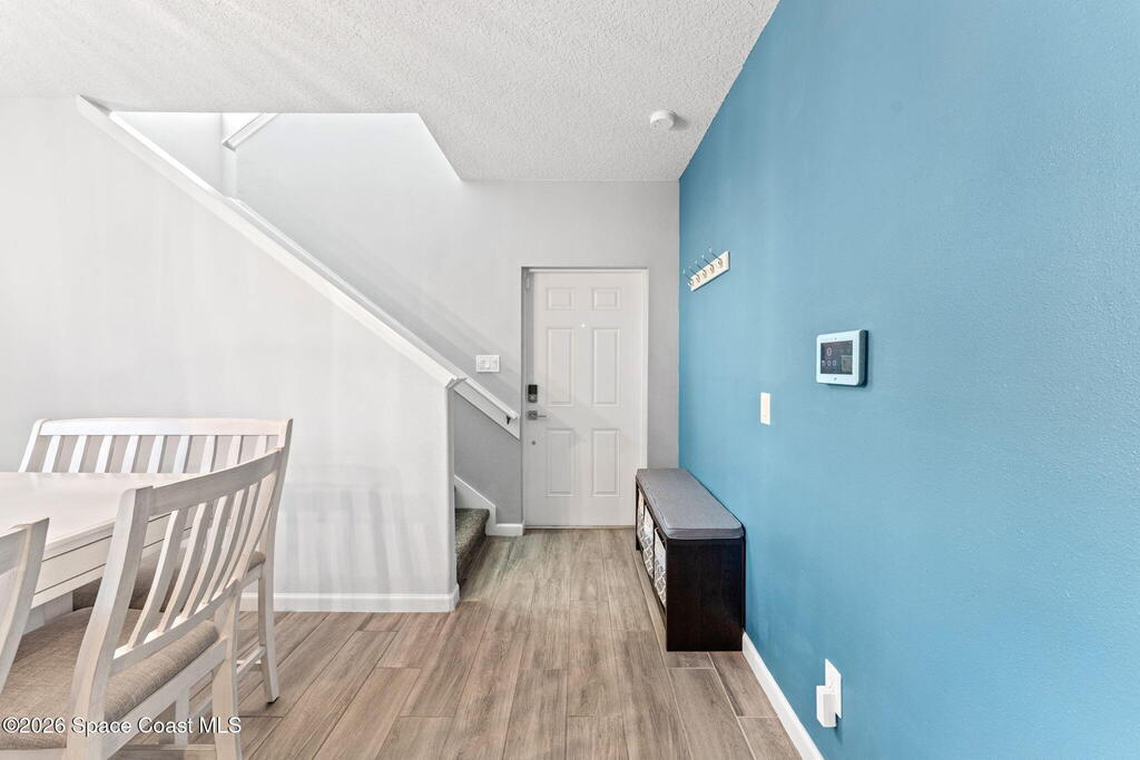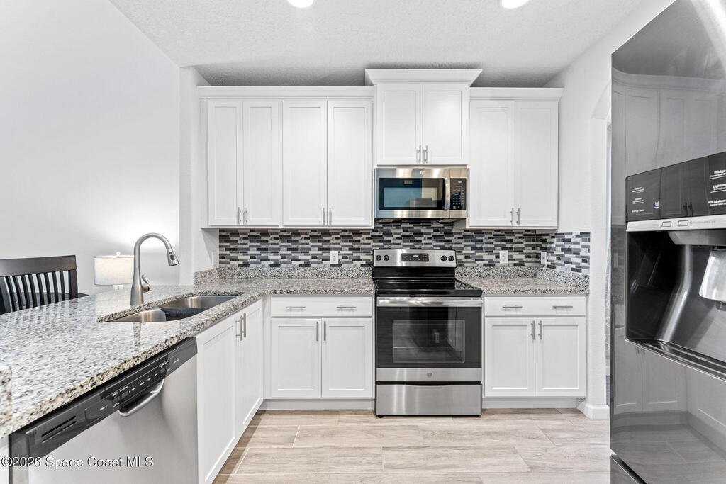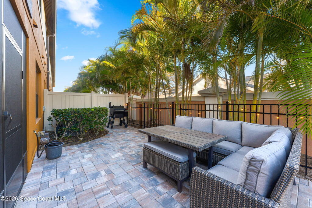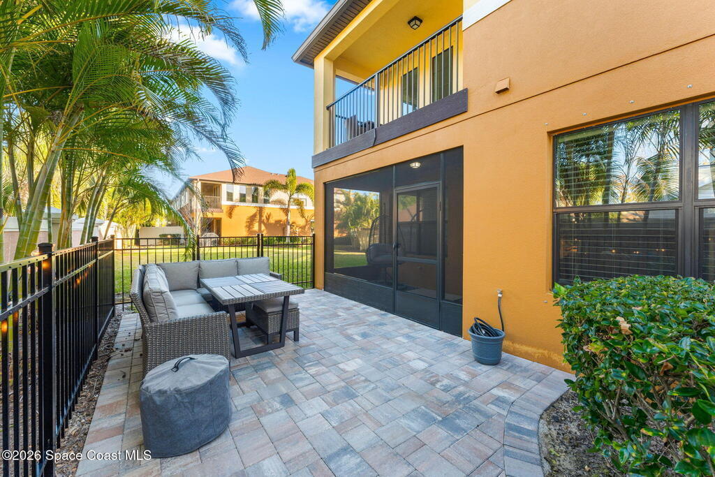 This townhome (End Unit!) hits different - bold, smart, and built for living! 3 beds, 2.5 baths, and a 1-car garage bring the space, while granite countertops and a breakfast bar give the kitchen serious style points. The primary suite lives downstairs with sliders spilling out to a covered, screened patio...your everyday escape for fresh air, slow mornings, and late-night unwinding. Upstairs, two guest rooms offer privacy and smart layout flow, with one opening to a breezy balcony perfect for sunset resets. Tile & carpet throughout, central vacuum, storm shutters, a security system, and a smart doorbell mean effortless, secure living. Plus, a smart thermostat keeps comfort dialed in year-round. Out back, a paved patio with metal fencing sets the stage for chilling, grilling, and good-vibe nights. Minutes from Viera's top shopping and dining - because convenience should feel this cool!