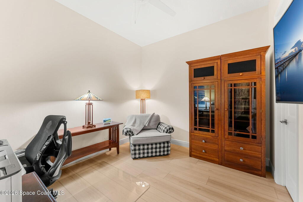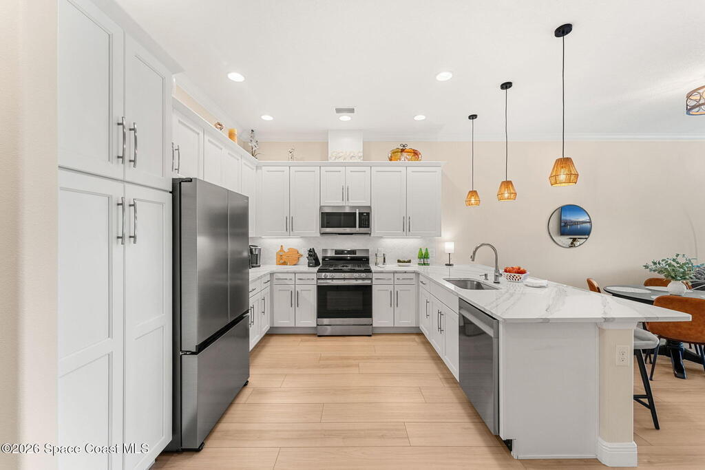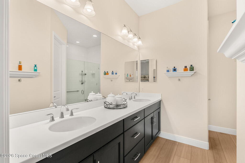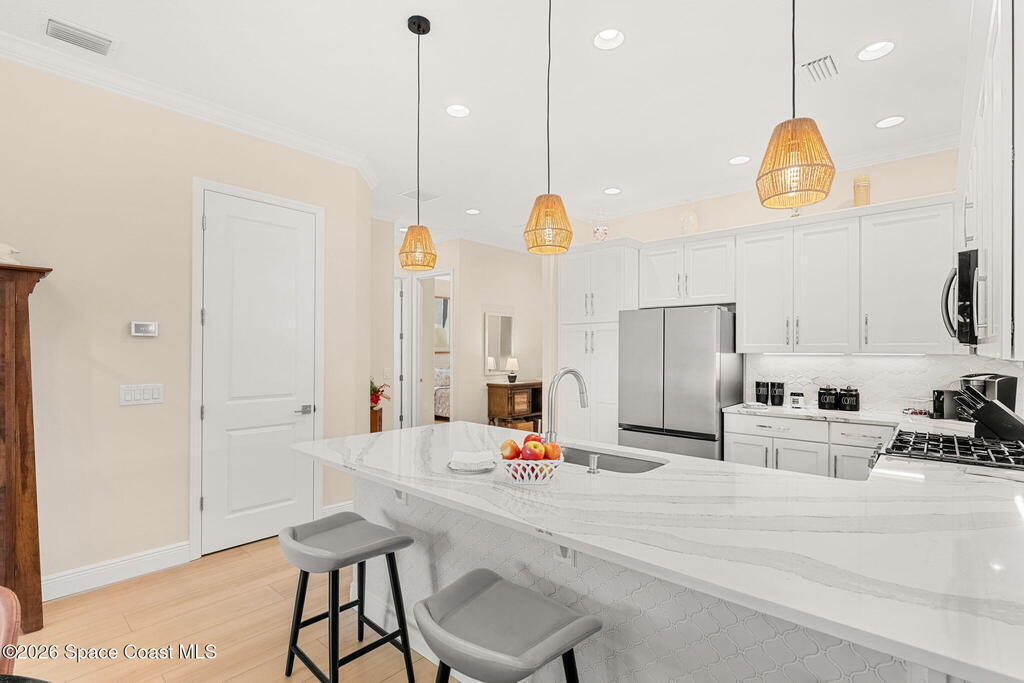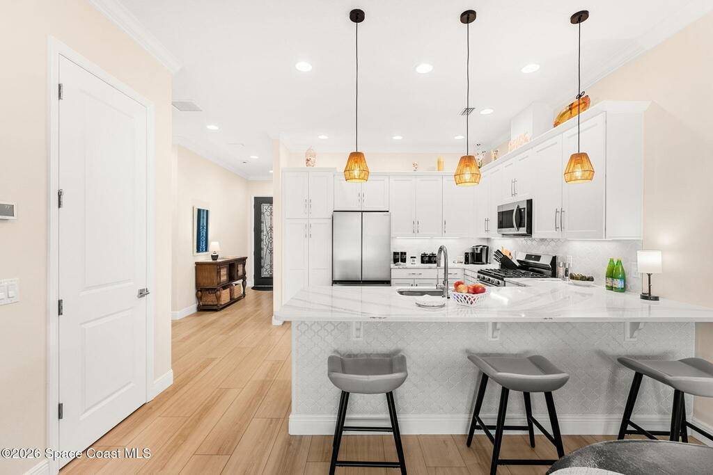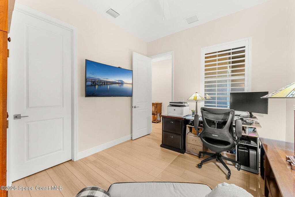 If you've been dreaming of the Viera lifestyle without the typical Viera price tag, this is the one. Built in 2024 and thoughtfully upgraded from top to bottom, this 3 bedroom, 2 bath home offers the ease of townhouse living with the feel of a custom residence. From the moment you step inside, you'll notice the difference. Luxury vinyl plank flooring, upgraded cabinetry, premium countertops, designer tile details and custom touches throughout create a space that feels polished, comfortable and completely move in ready. The owners have gone beyond the builder basics with a whole home water softener, custom closets, window treatments, upgraded fixtures and a beautifully finished primary bath with a frameless glass shower. (See upgrade list attached) Step outside and enjoy peaceful pond views from the screened lanai, unwind on the extended paver patio, and take advantage of the built in natural gas grill connection with additional paver space designed for easy outdoor entertaining.