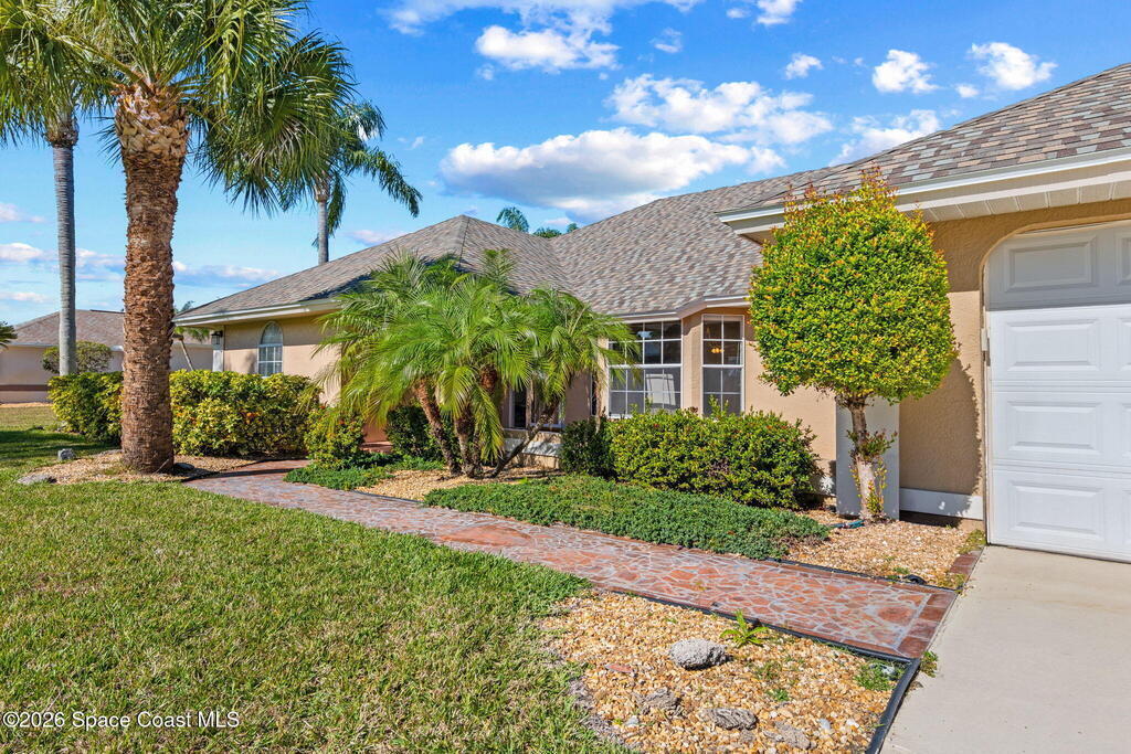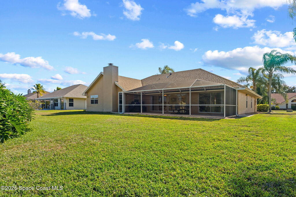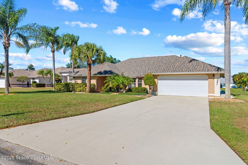 Discover this meticulous 3-bedroom, 2-bathroom ''hidden gem'' on a .28-acre waterfront double lot in Spanish Wells. This energy-efficient home features a brand-new roof (2025), and a fresh interior. The flexible open floorplan includes a spacious family room and kitchen with stainless steel appliances, all overlooking a serene lake and protected preserve. The primary suite offers two large closets, attached office and the garage easily fits two cars. Can be purchased furnished or unfurnished.Perfectly located near top-rated schools, Suntree Country Club, and Viera's best shopping and dining, this home offers the ultimate Florida lifestyle. Don't miss your chance to own this slice of paradise in a charming community of custom homes.