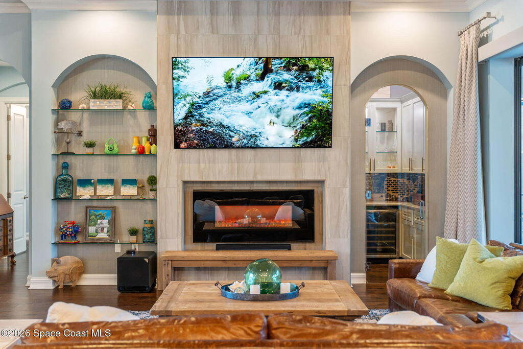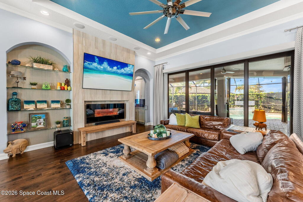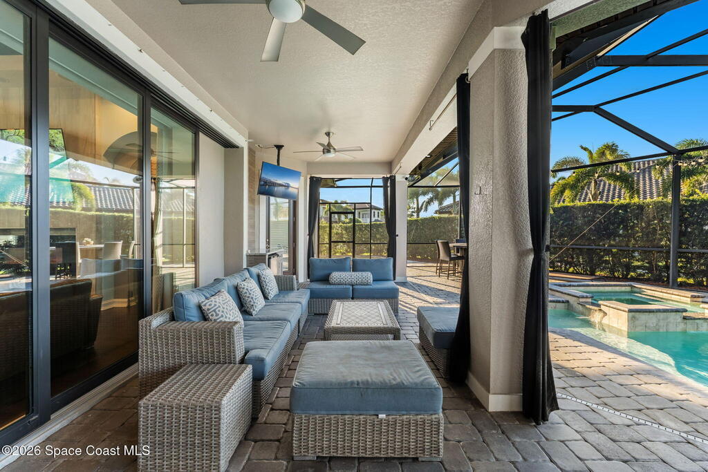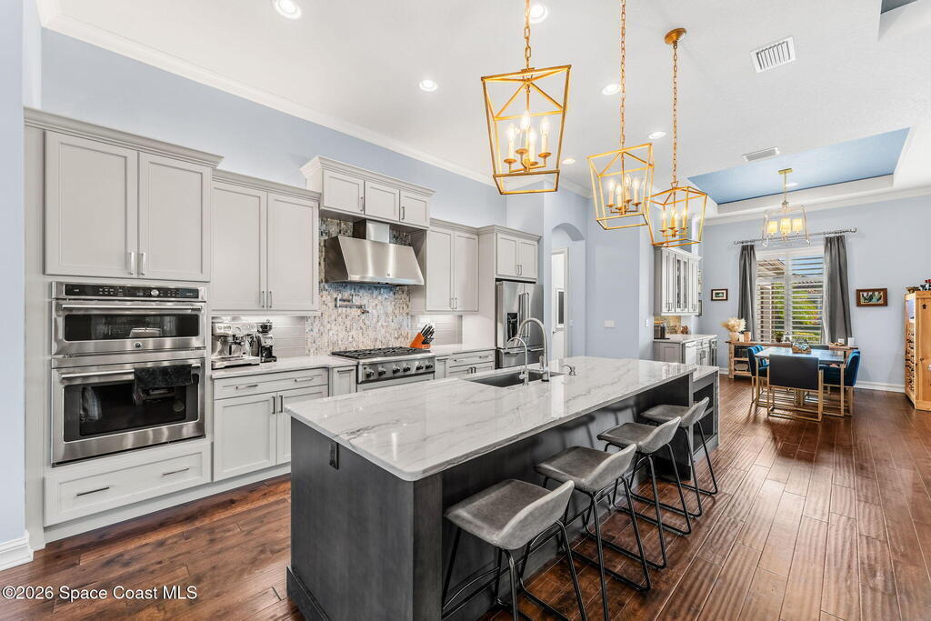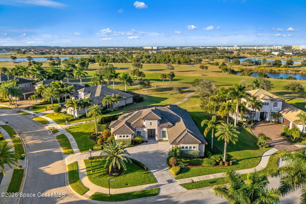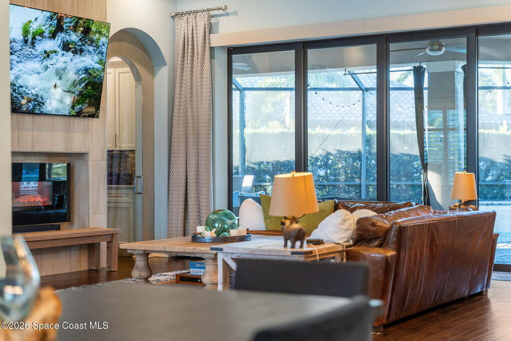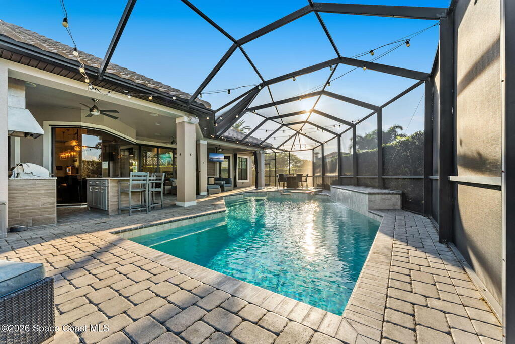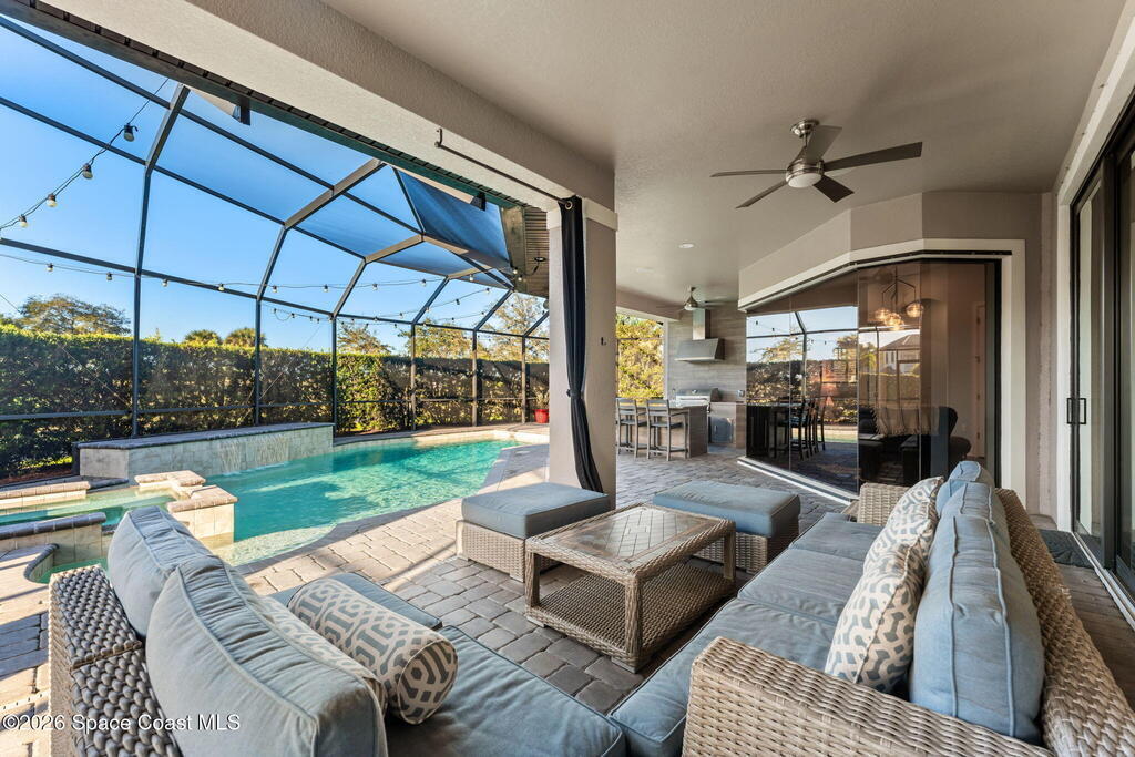 Welcome to Wyndham at Duran, one of Viera's most prestigious gated golf communities, offering 24/7 security, manicured streetscapes, and serene golf course vistas. Ideally positioned on a premium corner lot within a quiet cul-de-sac, this residence blends architectural elegance with modern comfort.This exceptional 4-bedroom + dedicated office, 3.5-bath home showcases wide-plank hardwood floors, a beautifully appointed fireplace, and handcrafted mahogany entry doors. The open-concept design centers around a chef's kitchen featuring a 13-foot quartzite island, GE Cafe appliance suite, natural gas cooktop, vented hood, custom cabinetry, and a walk-in wine room, perfectly curated for both daily living and effortless entertaining.Expansive 9-foot pocket sliders create seamless indoor-outdoor living, opening to a private outdoor sanctuary complete with a fully equipped summer kitchen, large island, and vented hood. The luxurious primary suite offers tray ceilings, dual