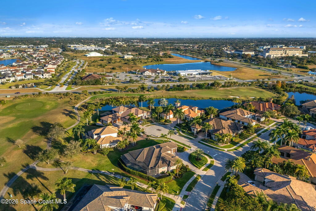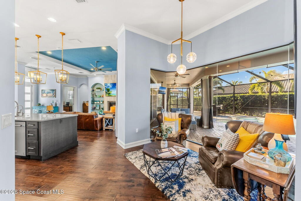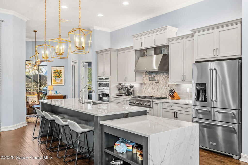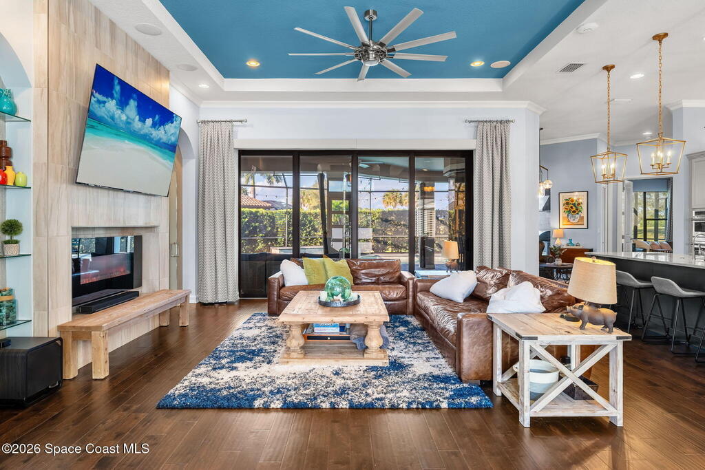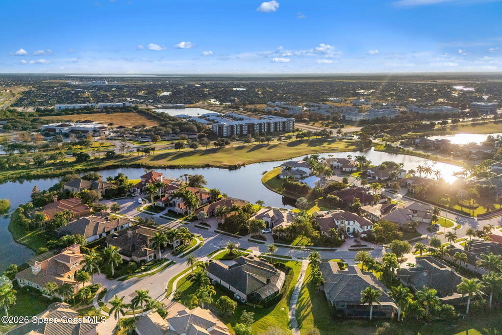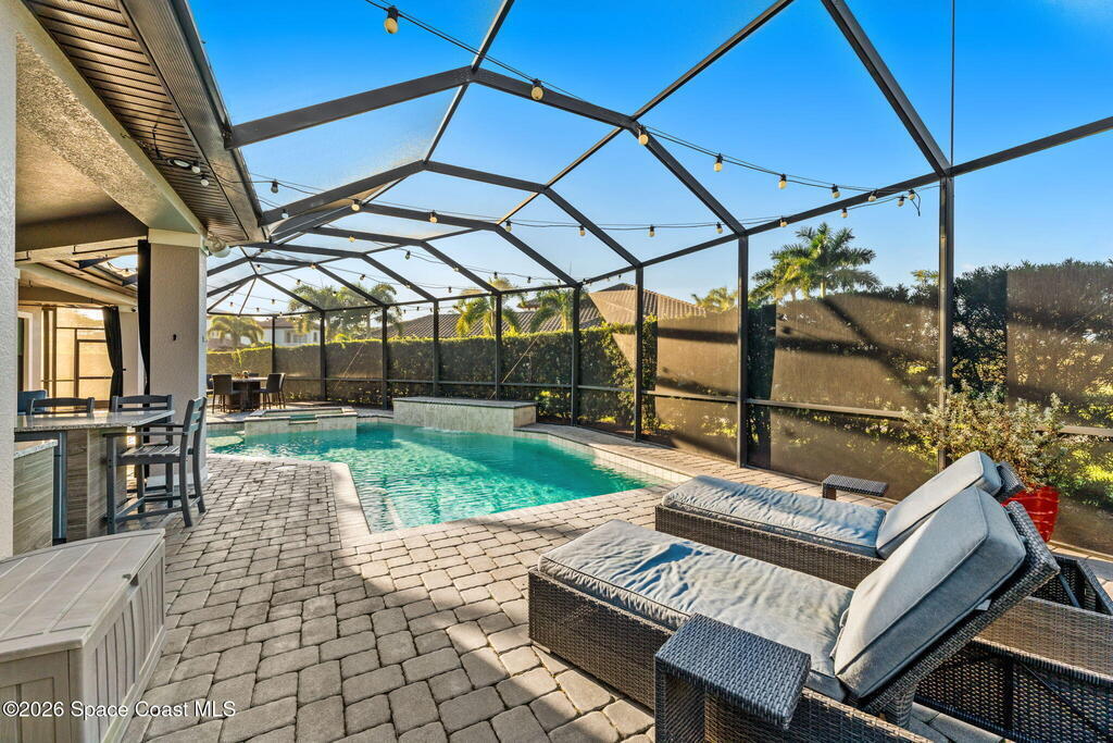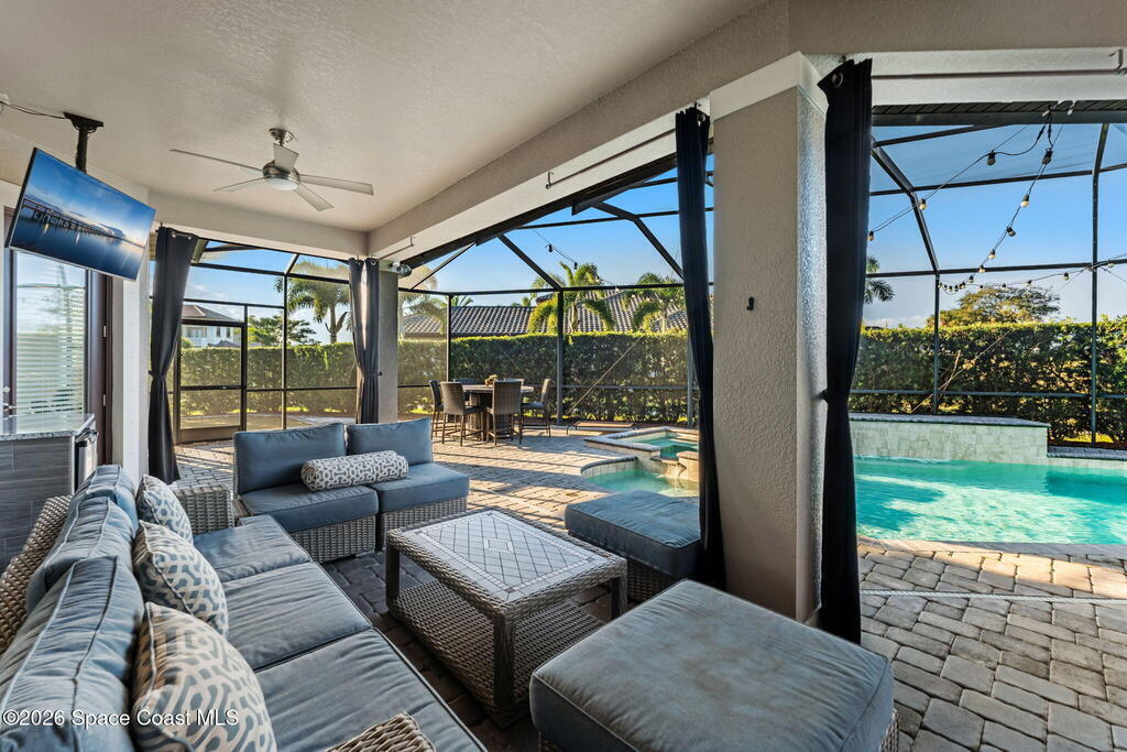 Welcome to Wyndham at Duran, one of Viera's most prestigious gated golf communities, offering 24/7 security, manicured streetscapes, and serene golf course vistas. Ideally positioned on a premium corner lot within a quiet cul-de-sac, this residence blends architectural elegance with modern comfort.This exceptional 4-bedroom + dedicated office, 3.5-bath home showcases wide-plank hardwood floors, a beautifully appointed fireplace, and handcrafted mahogany entry doors. The open-concept design centers around a chef's kitchen featuring a 13-foot quartzite island, GE Cafe appliance suite, natural gas cooktop, vented hood, custom cabinetry, and a walk-in wine room, perfectly curated for both daily living and effortless entertaining.Expansive 9-foot pocket sliders create seamless indoor-outdoor living, opening to a private outdoor sanctuary complete with a fully equipped summer kitchen, large island, and vented hood. The luxurious primary suite offers tray ceilings, dual