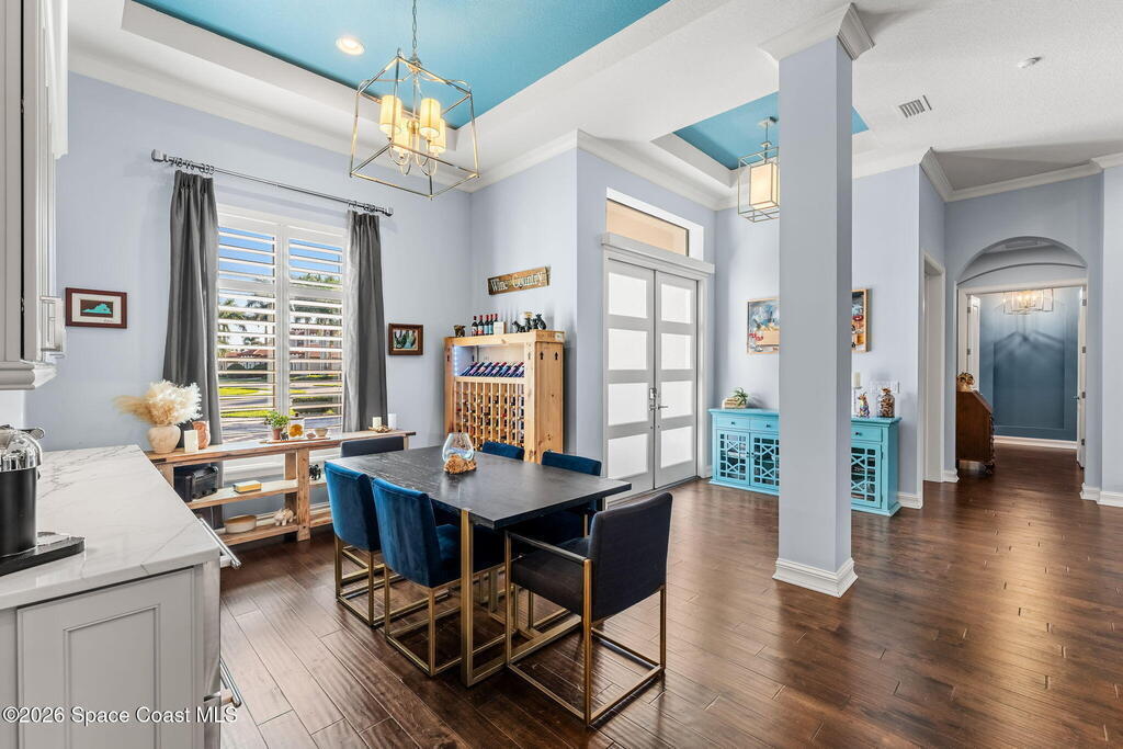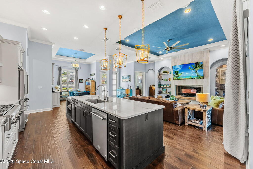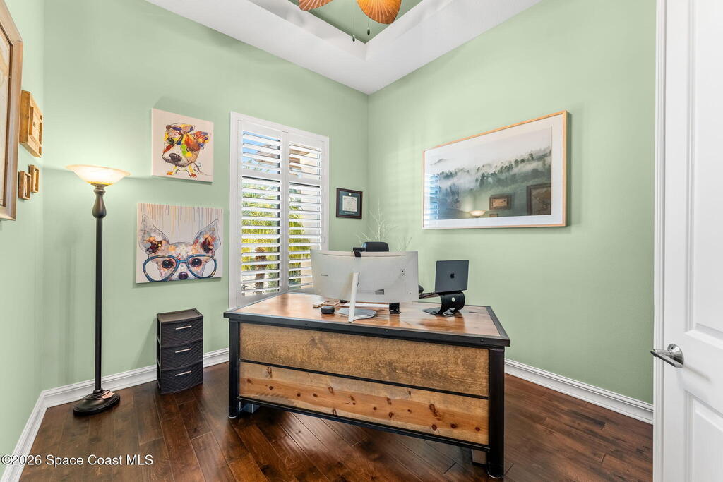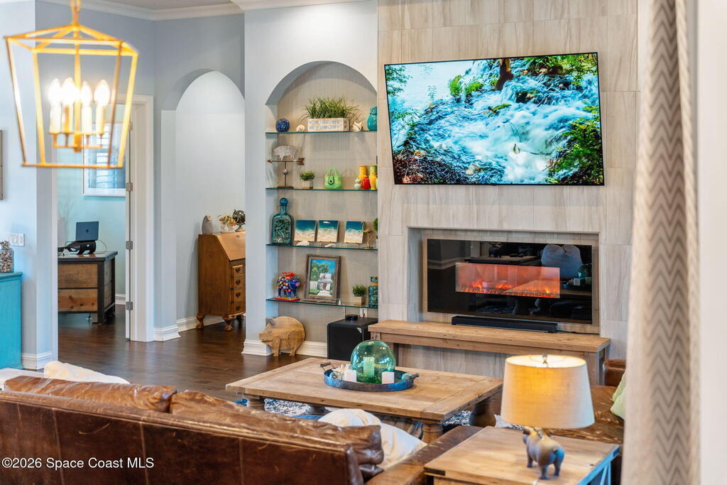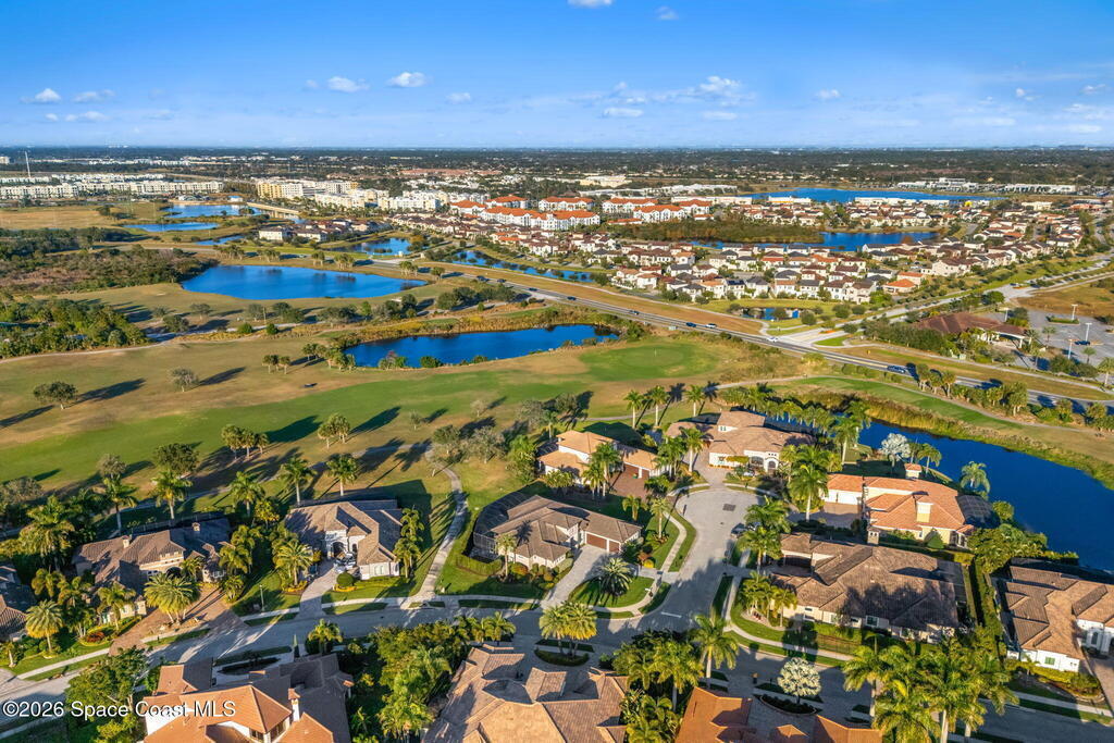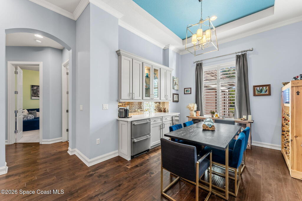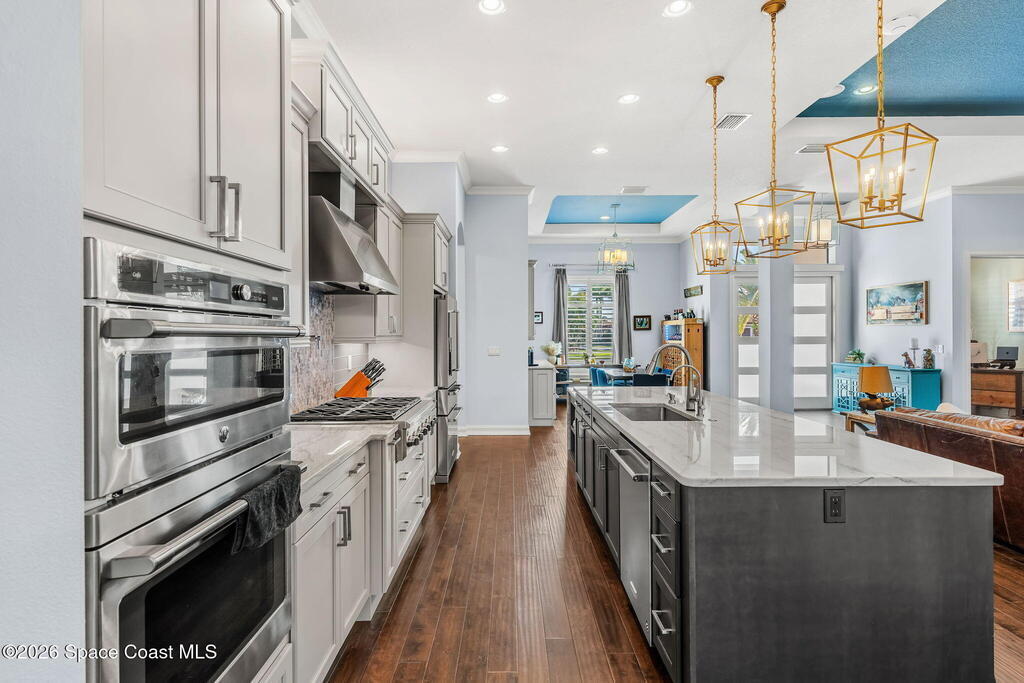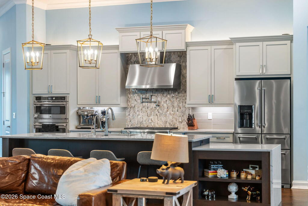 Welcome to Wyndham at Duran, one of Viera's most prestigious gated golf communities, offering 24/7 security, manicured streetscapes, and serene golf course vistas. Ideally positioned on a premium corner lot within a quiet cul-de-sac, this residence blends architectural elegance with modern comfort.This exceptional 4-bedroom + dedicated office, 3.5-bath home showcases wide-plank hardwood floors, a beautifully appointed fireplace, and handcrafted mahogany entry doors. The open-concept design centers around a chef's kitchen featuring a 13-foot quartzite island, GE Cafe appliance suite, natural gas cooktop, vented hood, custom cabinetry, and a walk-in wine room, perfectly curated for both daily living and effortless entertaining.Expansive 9-foot pocket sliders create seamless indoor-outdoor living, opening to a private outdoor sanctuary complete with a fully equipped summer kitchen, large island, and vented hood. The luxurious primary suite offers tray ceilings, dual