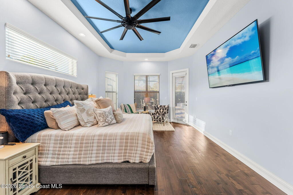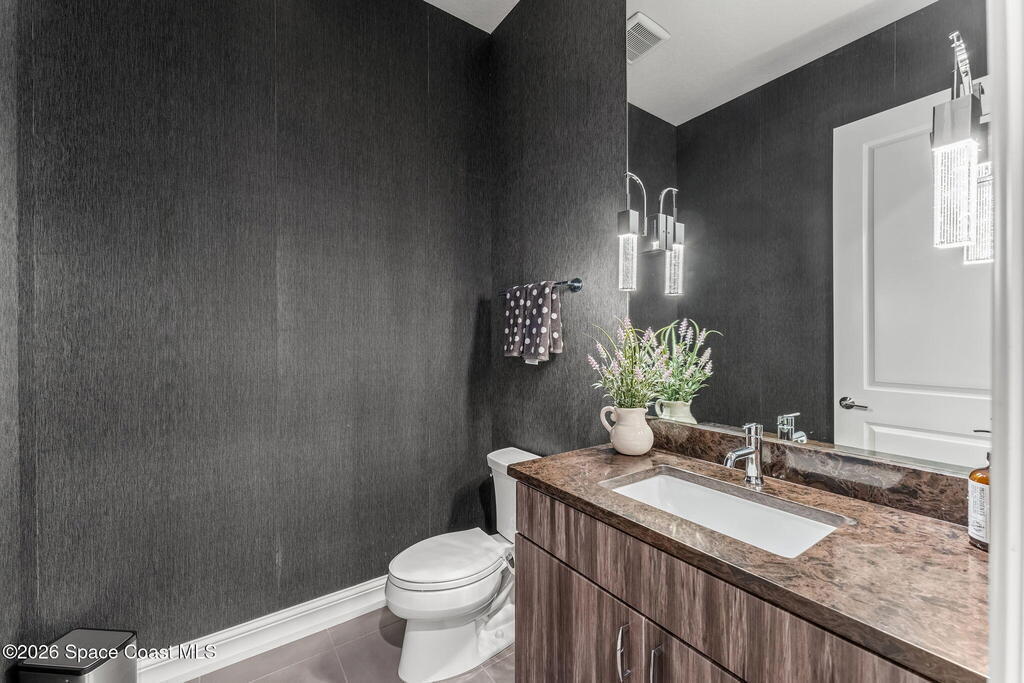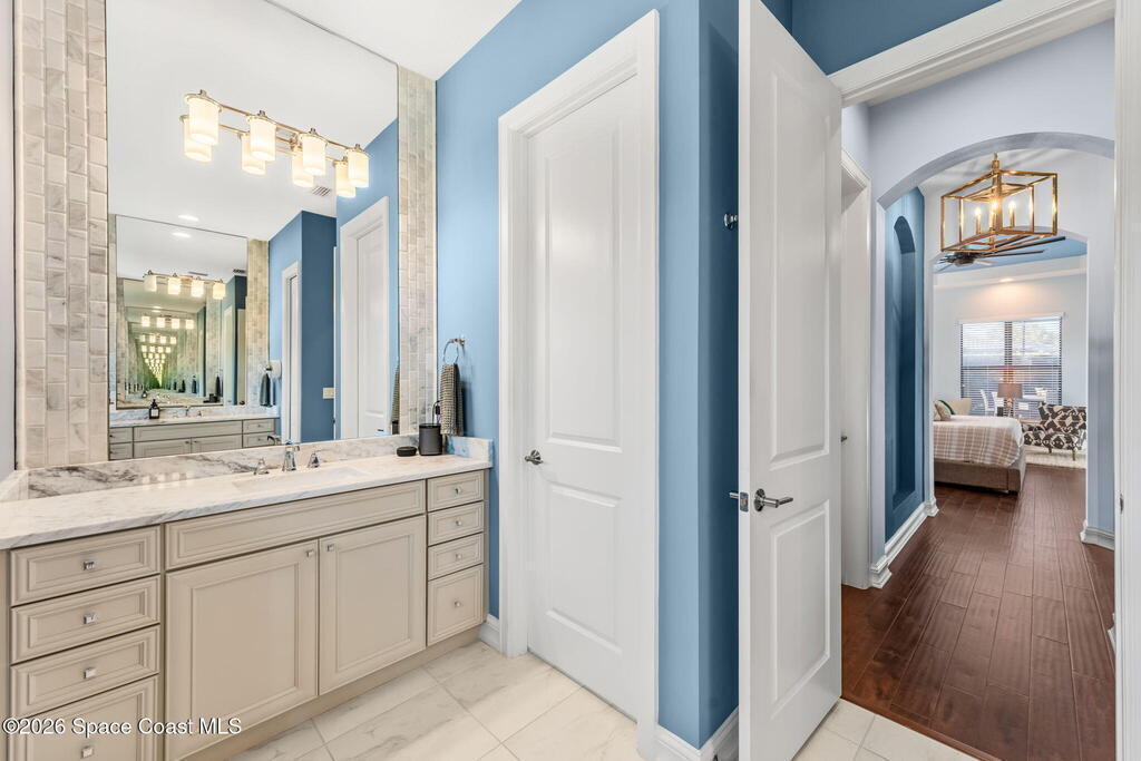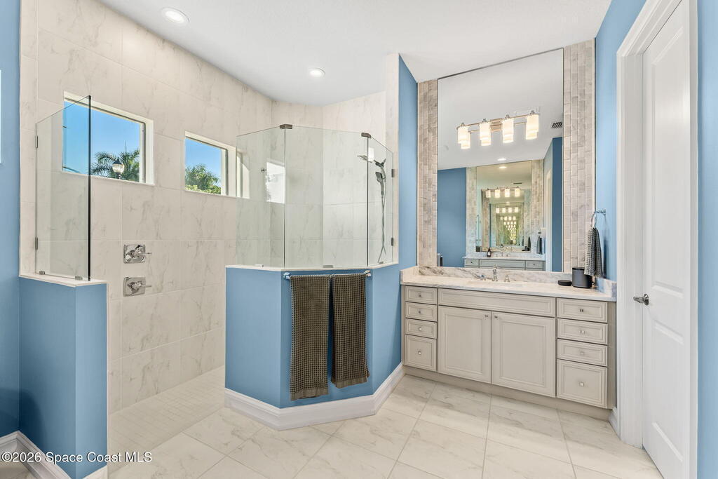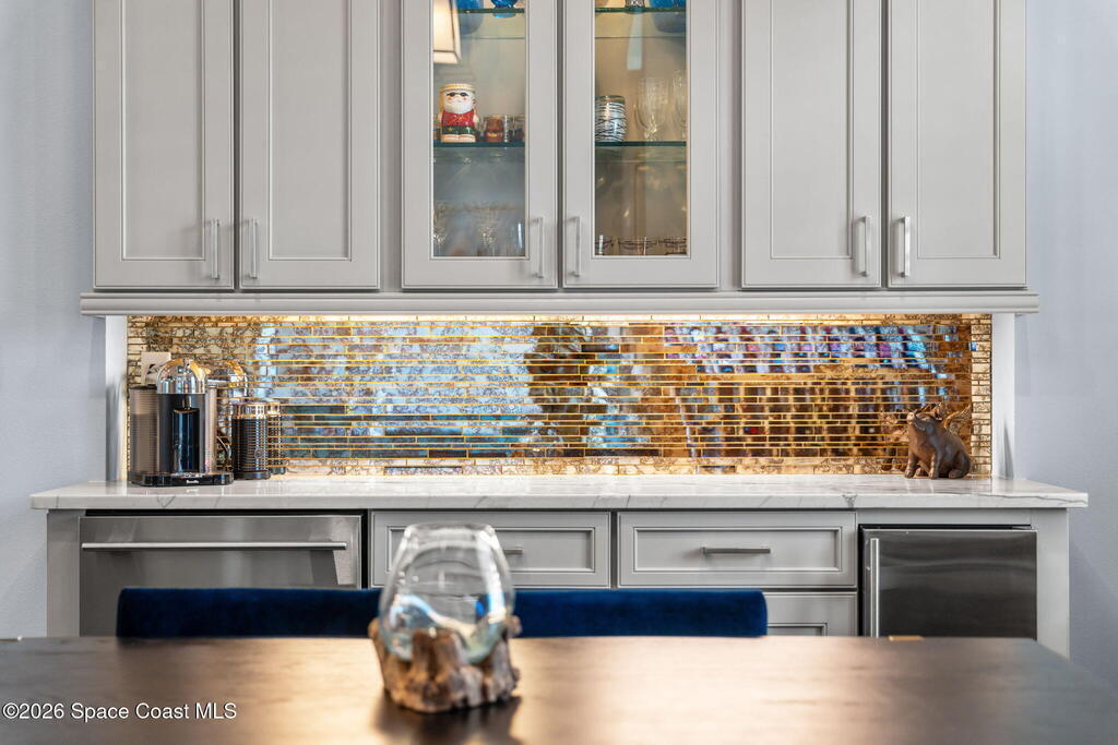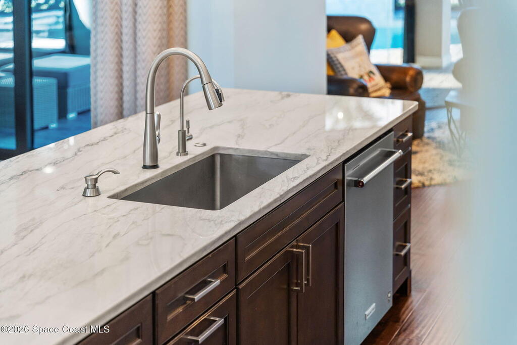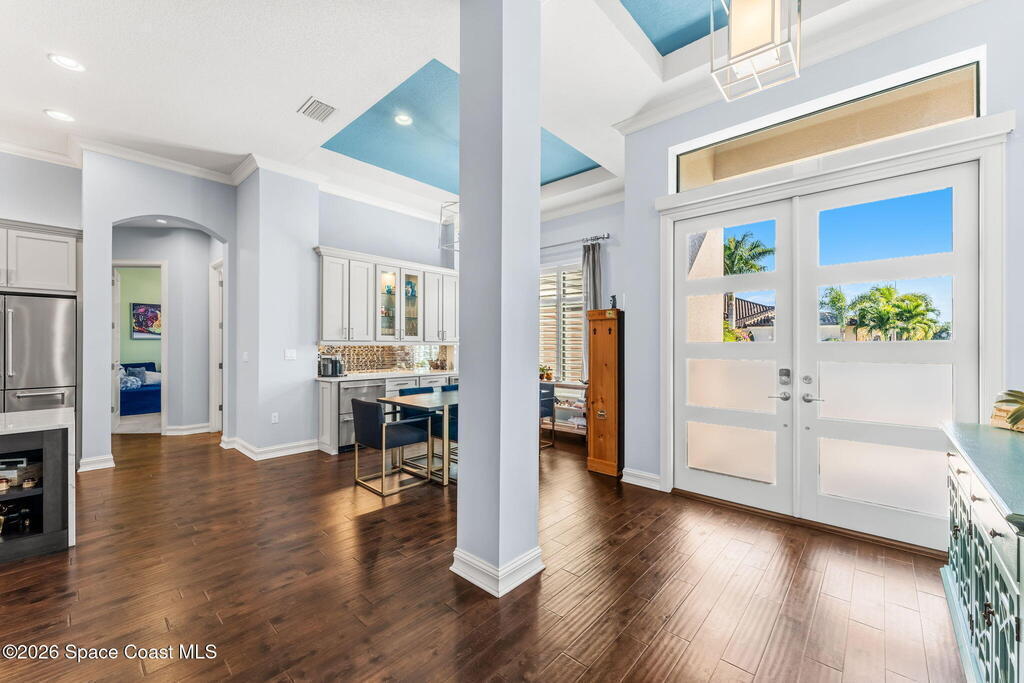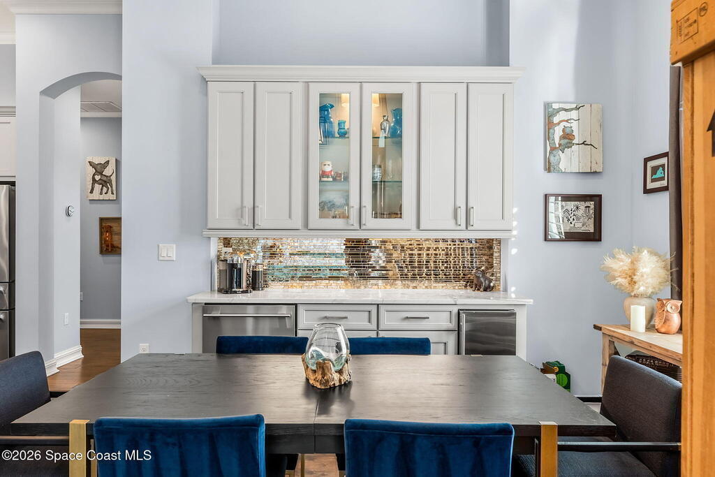Welcome to Wyndham at Duran, one of Viera's most prestigious gated golf communities, offering 24/7 security, manicured streetscapes, and serene golf course vistas. Ideally positioned on a premium corner lot within a quiet cul-de-sac, this residence blends architectural elegance with modern comfort.This exceptional 4-bedroom + dedicated office, 3.5-bath home showcases wide-plank hardwood floors, a beautifully appointed fireplace, and handcrafted mahogany entry doors. The open-concept design centers around a chef's kitchen featuring a 13-foot quartzite island, GE Cafe appliance suite, natural gas cooktop, vented hood, custom cabinetry, and a walk-in wine room, perfectly curated for both daily living and effortless entertaining.Expansive 9-foot pocket sliders create seamless indoor-outdoor living, opening to a private outdoor sanctuary complete with a fully equipped summer kitchen, large island, and vented hood. The luxurious primary suite offers tray ceilings, dual