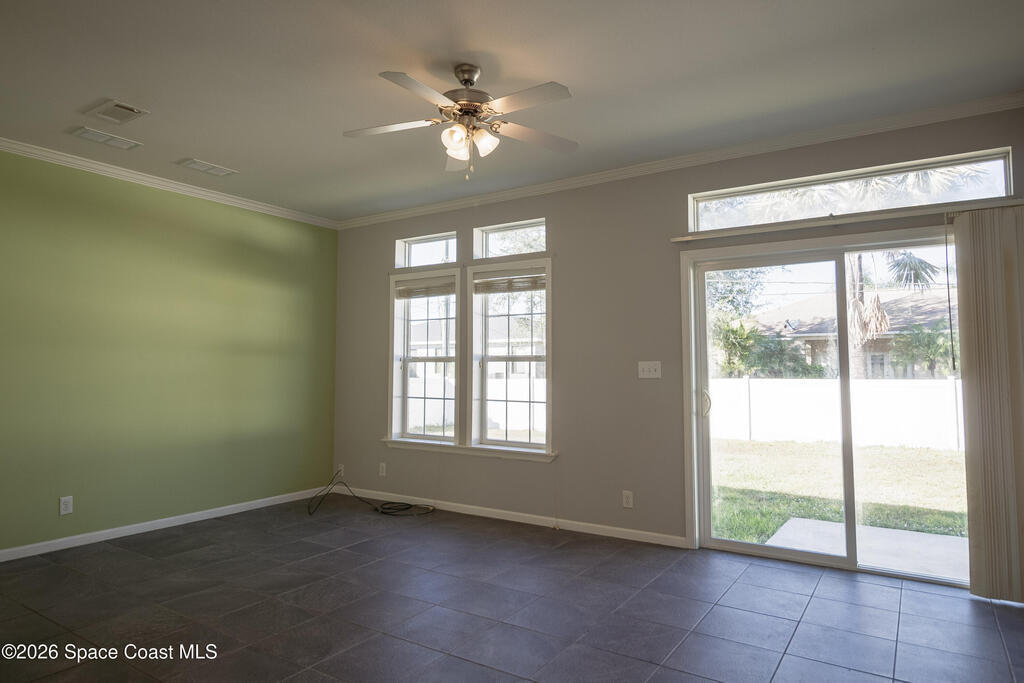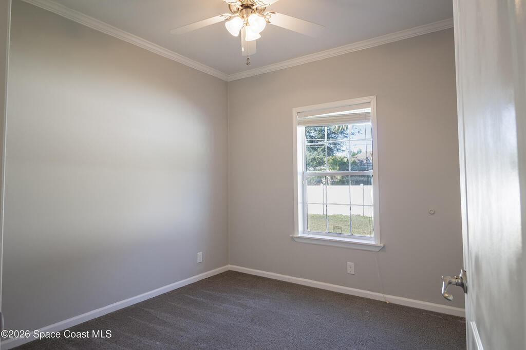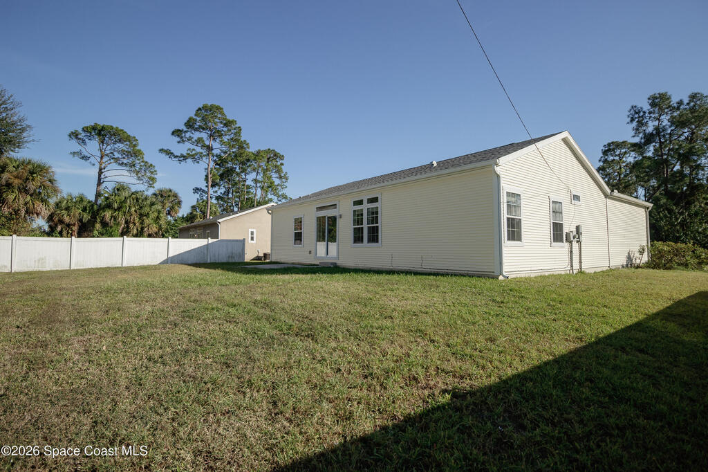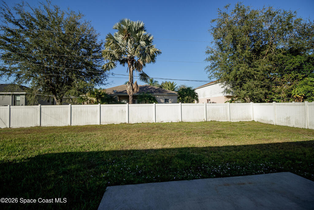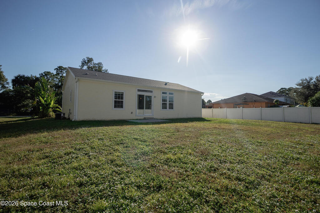 Beautiful 3 bedroom, 2 bathroom home for sale in Palm Bay. Don't miss the opportunity to own this well maintained, 10 year old home. Split layout with primary bedroom suite including new carpet, walk in closet, double vanity bathroom with shower. Two additional nice size bedrooms with ceiling fans and new carpet. The family bathroom has a tub/shower combination. Living room features a ceiling fan and crown molding. Nice size kitchen with lots of cabinets, stainless appliances, center island, breakfast bar adjacent to the dining room. Dining room walks out through the sliding glass doors to the rear patio. Two car garage and interior laundry that includes a washer and dryer. Ready to move in!