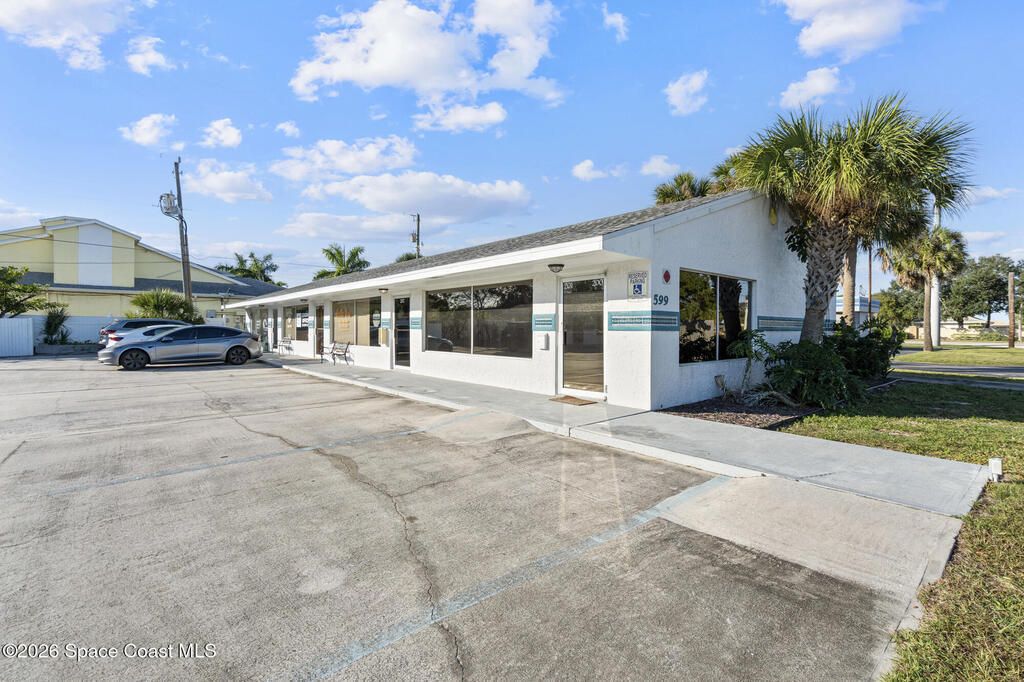 599 Sherwood Avenue offers three office suites in a multi-tenant Satellite Beach building. Each has a private entrance, private restroom, and layout suited for professional, therapy, or wellness use. Features include direct access off South Patrick Dr (20,000+ AADT), pylon signage, surface parking, and proximity to A1A, Patrick SFB (5-10 min), and beach access (under 5 min). The building has 16 suites with tenants in wellness, beauty, professional services, and specialty retail.Available suites: Suite 101: 330 SF, $700/mo gross ($25.45 PSF) Suite 110: 317 SF, $600/mo gross ($22.71 PSF) Suite 207: 352 SF, $575/mo gross (~$19.60 PSF)Lease: Base rent + NNN (CAM/taxes/insurance, confirm on inquiry).