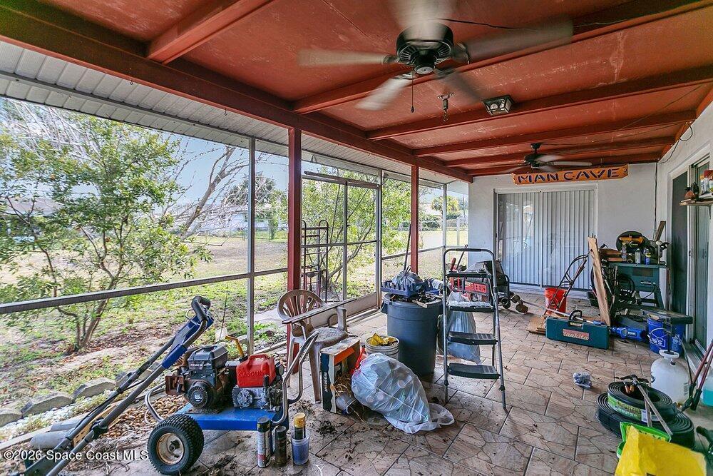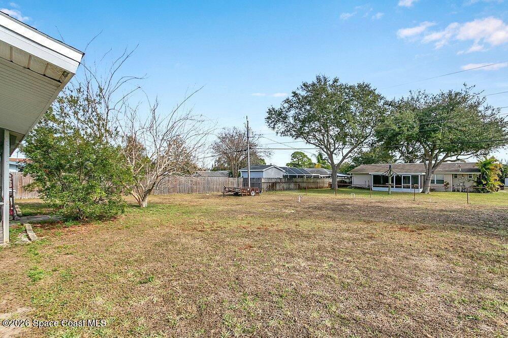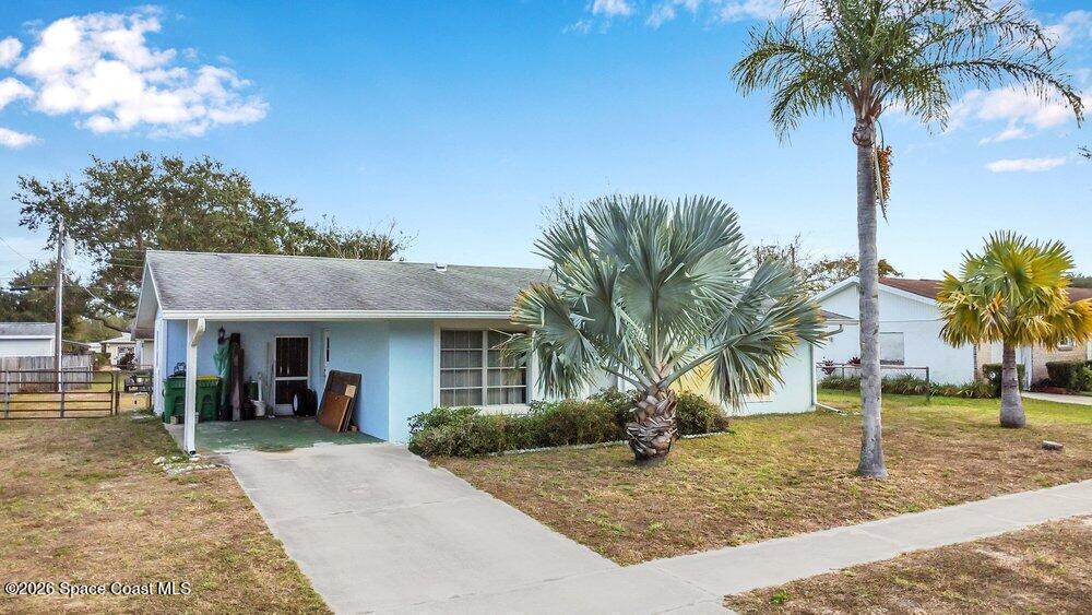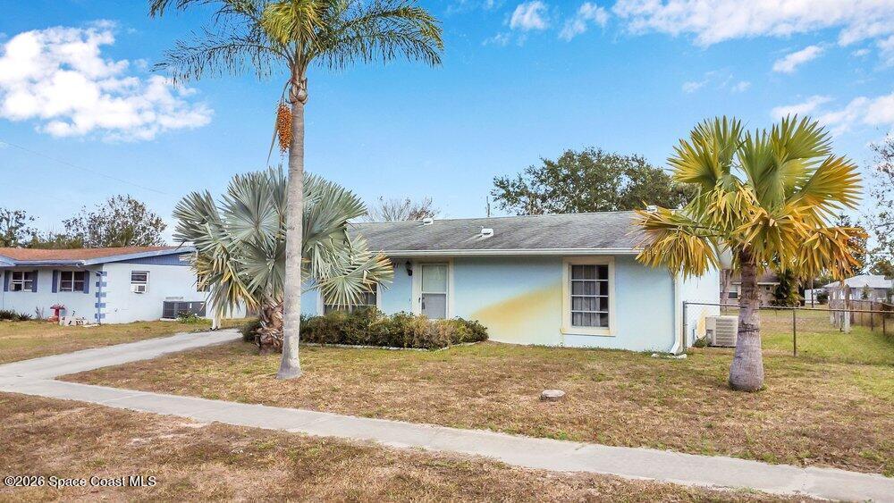 Solid concrete block home on slab featuring 2 bedrooms and 2 full baths, central A/C, and a carport. Approx. 894 sq ft of living area on a ~0.23-acre lot. Enclosed utility/sunroom area has flexible space for storage, workshop, or potential expansion (buyer to verify). Convenient Cocoa location near shopping, schools, and major routes. Delivered vacant at closing. Refrigerator and stove do not convey.