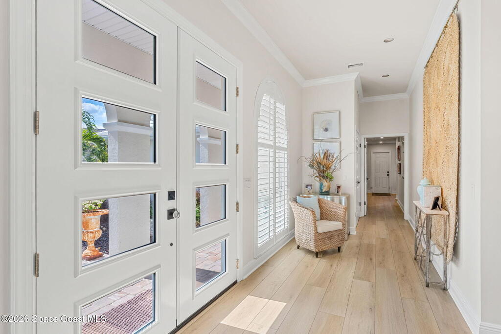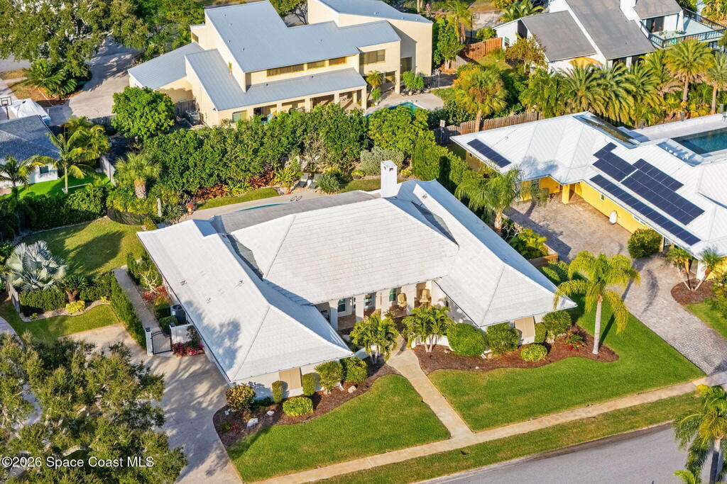 Located in the highly desirable estate section of Franklyn Avenue in Indialantic, this concrete block home has been thoughtfully improved with a focus on quality, durability, and everyday livability. Major upgrades include new impact-rated windows and doors, new Trane HVAC systems, and updated ductwork throughout.Set on a .42-acre lot, the property is framed by refreshed landscaping and subtle water features that create a sense of privacy without feeling closed off. Bimini shutters on select windows add a refined architectural detail, complementing the home's exterior. Inside, the home offers large, well-proportioned living spaces with new flooring, updated trim, and carefully selected lighting throughout. A fireplace anchors the main living area, adding warmth and character.