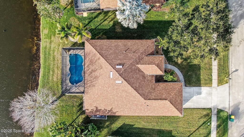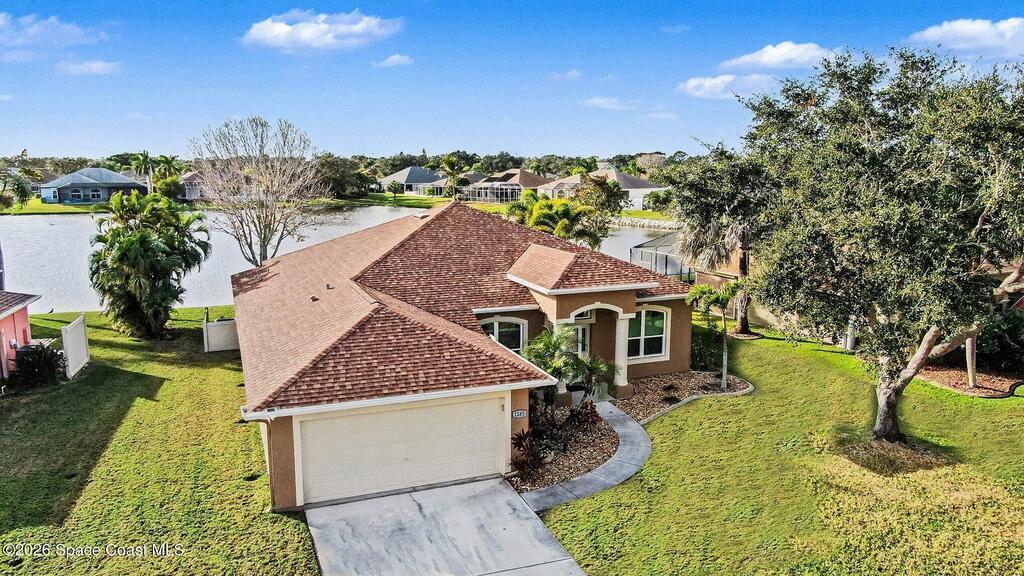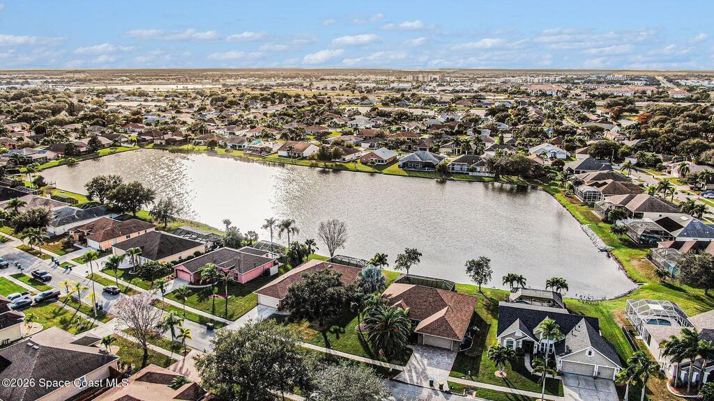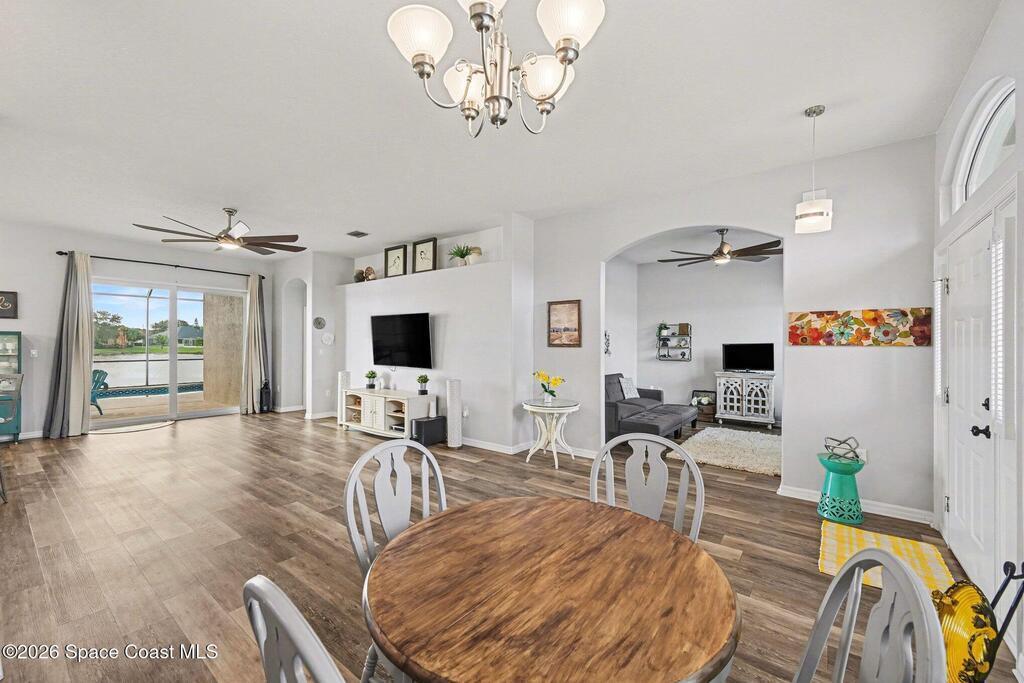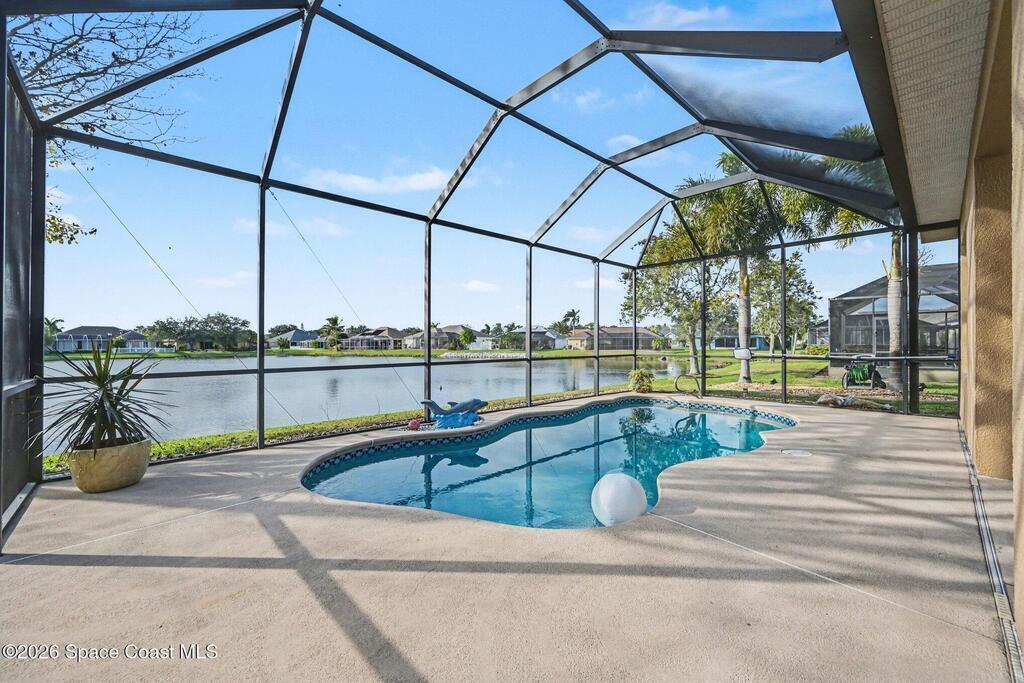 Enjoy resort-style living in this well-maintained pool home with lake views from nearly every room. The open, light-filled great room features neutral paint and luxury vinyl plank flooring. Impact windows and expansive sliders highlight the water views and improve energy efficiency. The kitchen overlooks the living and dining areas and offers white cabinetry, granite countertops, stainless appliances, breakfast bar seating, and a cozy nook with lake views. A flexible front room is ideal for an office or den. The private primary suite includes lake and pool views, an updated bath with large walk-in shower, dual granite vanities, and two walk-in closets. Two additional bedrooms share a guest bath. Triple sliders open to a screened lanai with covered seating and a self-cleaning pool overlooking one of Viera's widest lakes. Two-stage A/C and variable-speed pool pump help keep electric bills low. Quiet, low-traffic circle near schools, shopping, dining, I-95, and a neighborhood dog park.