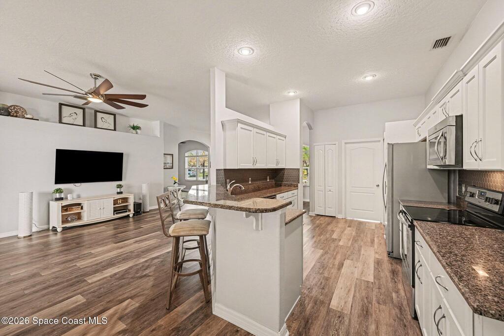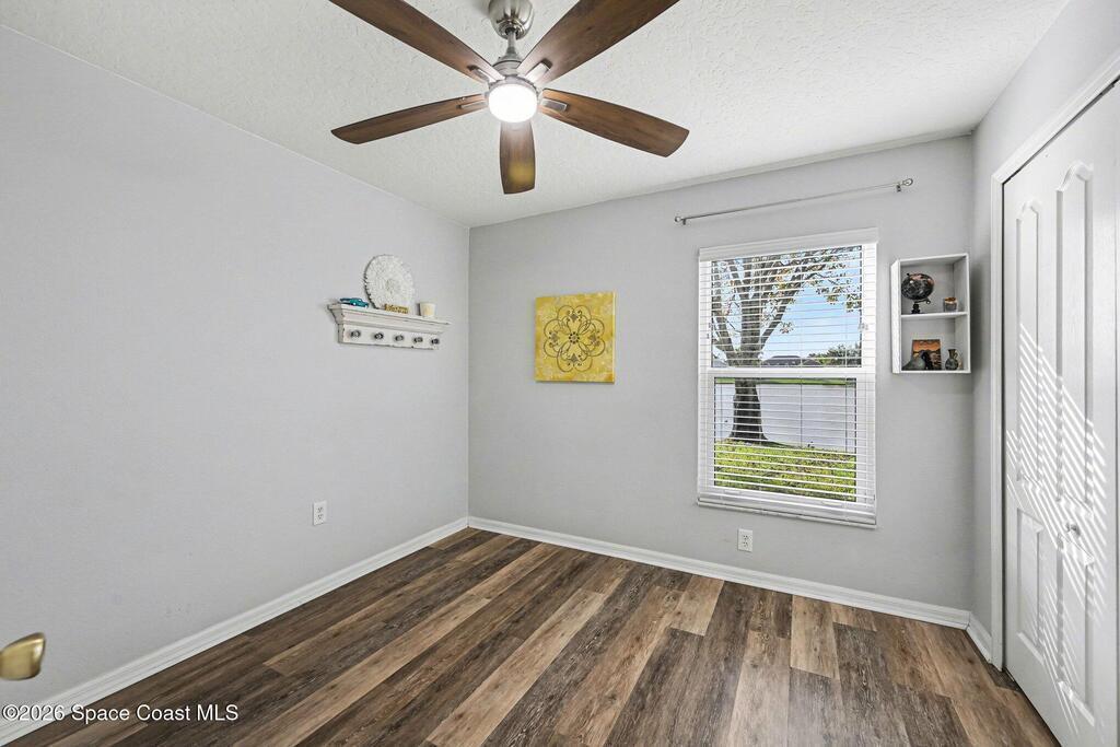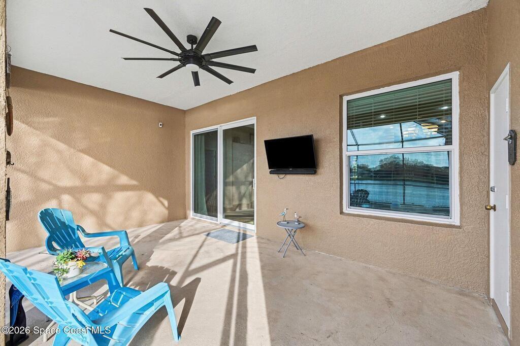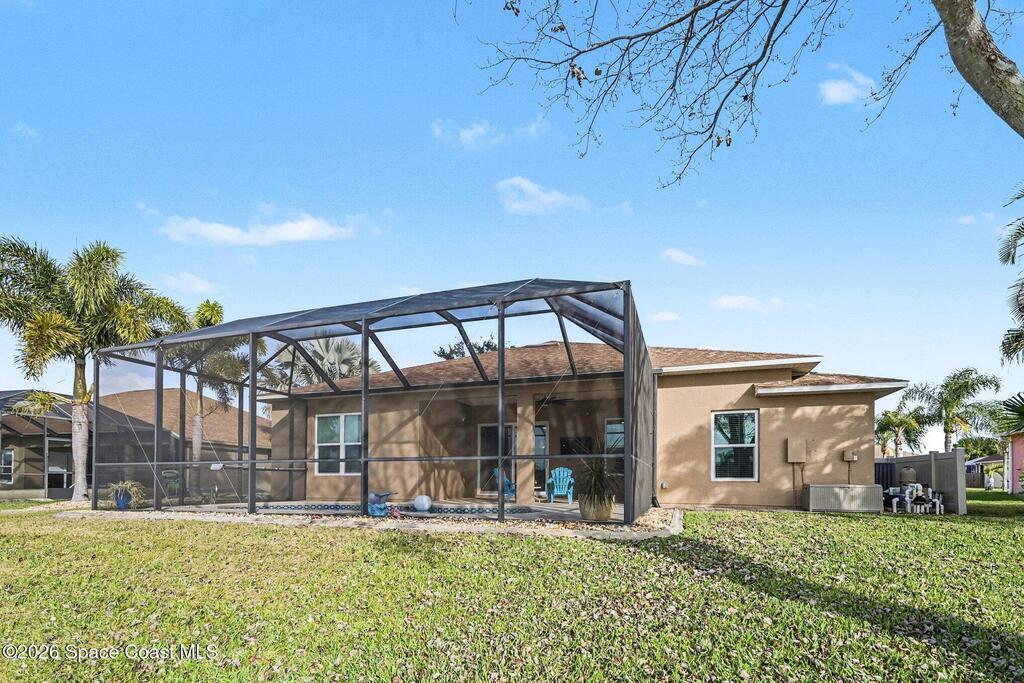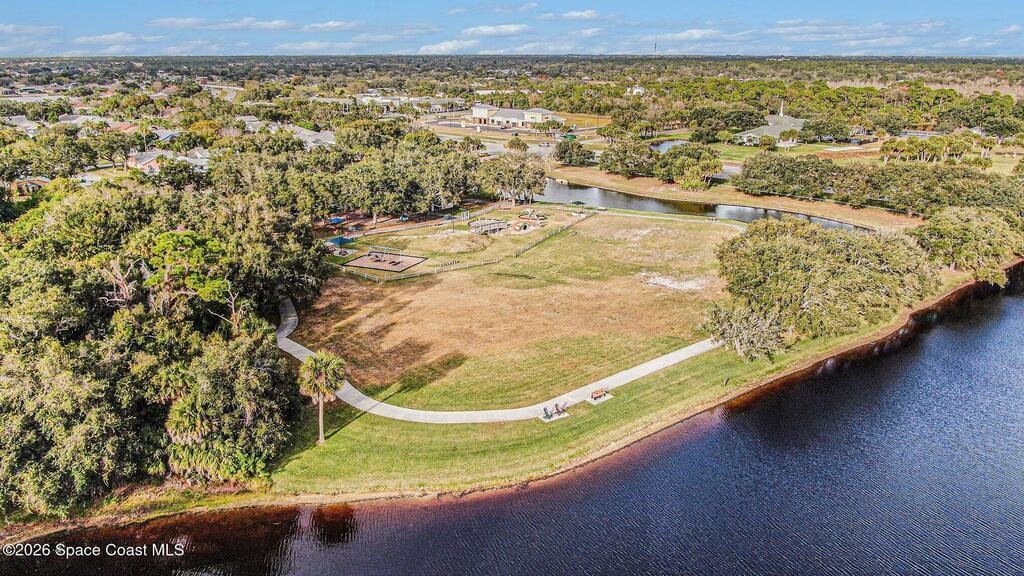 Enjoy resort-style living in this well-maintained pool home with lake views from nearly every room. The open, light-filled great room features neutral paint and luxury vinyl plank flooring. Impact windows and expansive sliders highlight the water views and improve energy efficiency. The kitchen overlooks the living and dining areas and offers white cabinetry, granite countertops, stainless appliances, breakfast bar seating, and a cozy nook with lake views. A flexible front room is ideal for an office or den. The private primary suite includes lake and pool views, an updated bath with large walk-in shower, dual granite vanities, and two walk-in closets. Two additional bedrooms share a guest bath. Triple sliders open to a screened lanai with covered seating and a self-cleaning pool overlooking one of Viera's widest lakes. Two-stage A/C and variable-speed pool pump help keep electric bills low. Quiet, low-traffic circle near schools, shopping, dining, I-95, and a neighborhood dog park.